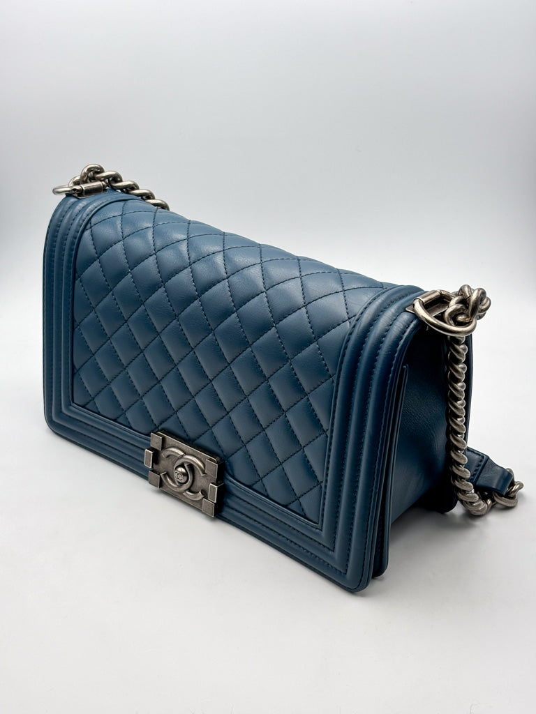 La Chanel Le Boy 25cm in pregiata pelle di agnello si distingue per il suo colore cobalto unico e vibrante, raro da trovare nelle collezioni classiche. L'hardware in rodio valorizza ulteriormente il design, conferendo un'eleganza sofisticata e moderna. Ideale per chi cerca un accessorio di lusso dal carattere deciso e raffinato, capace di completare con stile ogni outfit.