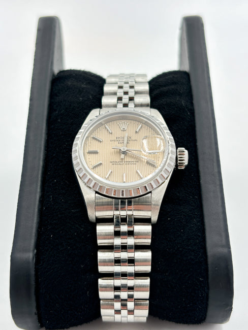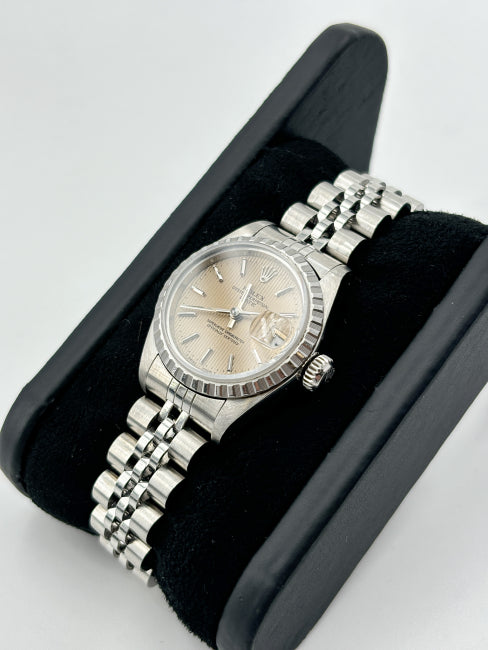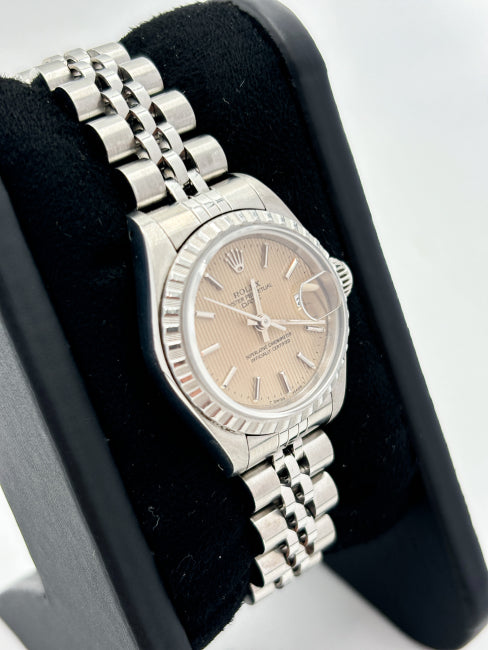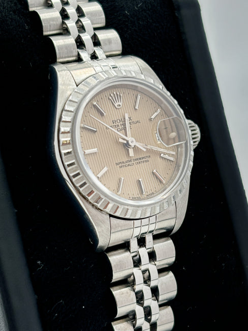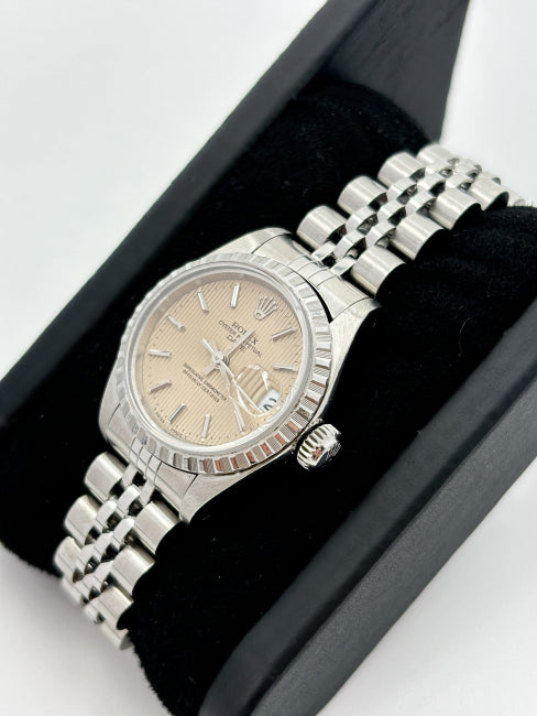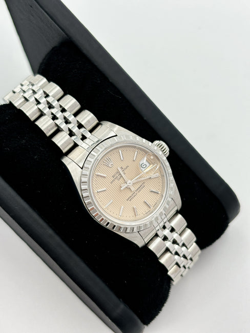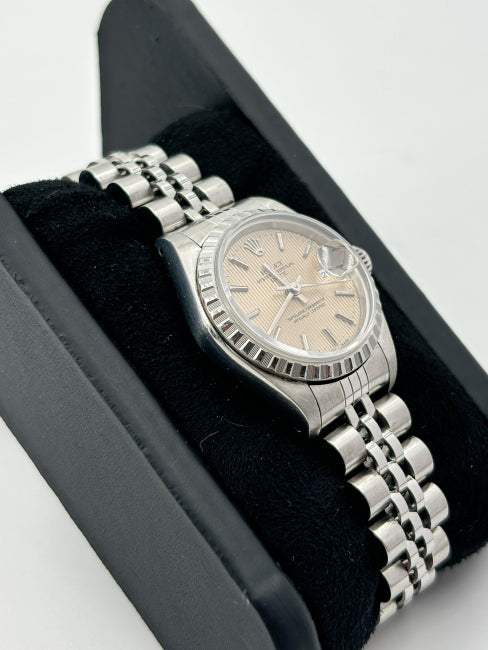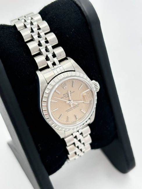Scoprite l'eleganza intramontabile del Rolex Datejust 69240, un autentico simbolo di raffinatezza ed esclusività. Con una cassa di 26 mm in acciaio inossidabile, questo orologio è progettato per adattarsi perfettamente al polso di chi ama distinguersi con classe. Il suo affascinante quadrante rosa, delicato e luminoso, cattura la luce in modo sublime, rendendo ogni attimo un momento da celebrare. Il bracciale Jubilee, con la sua straordinaria lavorazione e l'iconico design a maglia, garantisce un comfort eccezionale e una vestibilità perfetta, conferendo al polso un tocco di lusso senza tempo. La chiusura déployante assicura una praticità senza pari, unendo funzionalità e sofisticatezza in un pezzo che trascende le mode e le tendenze.
