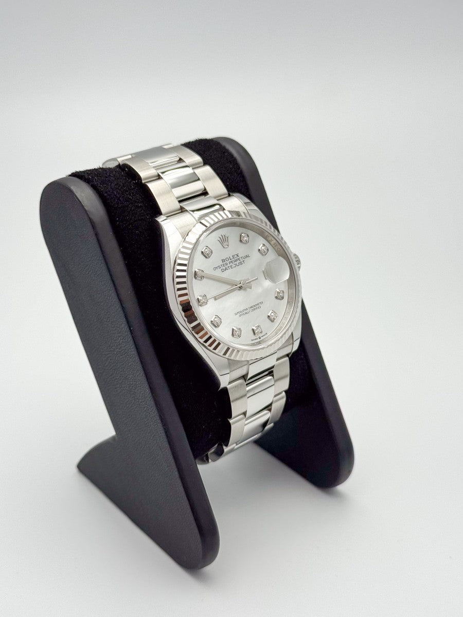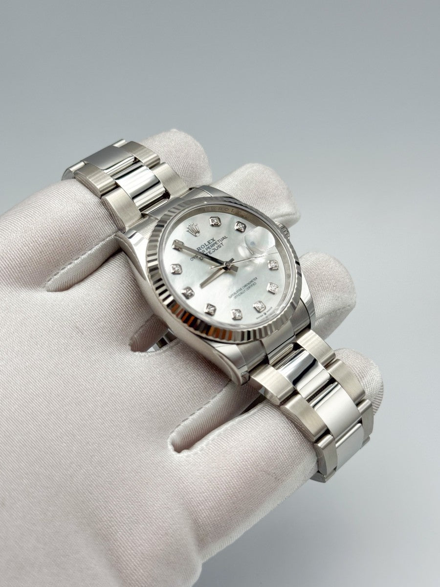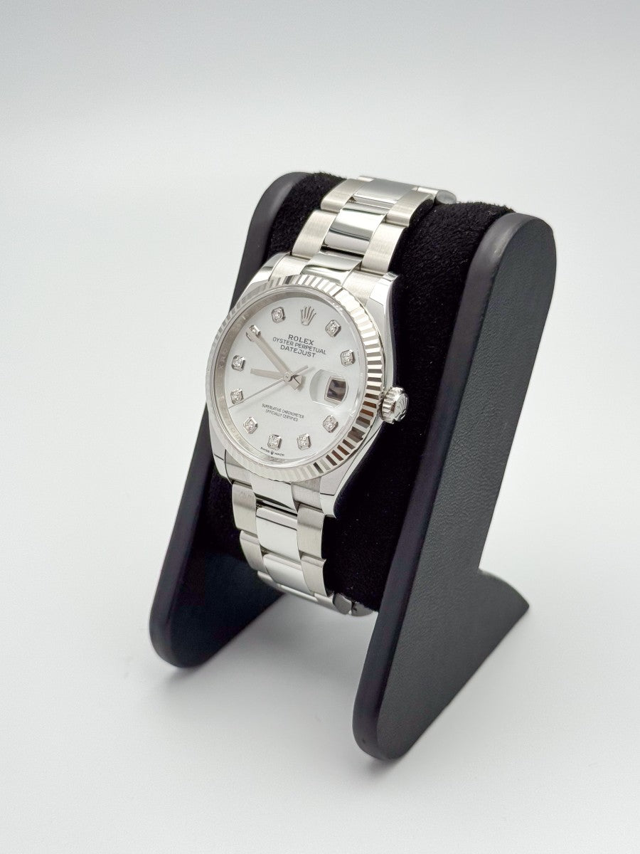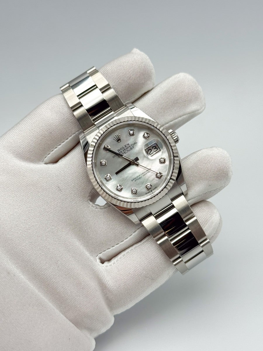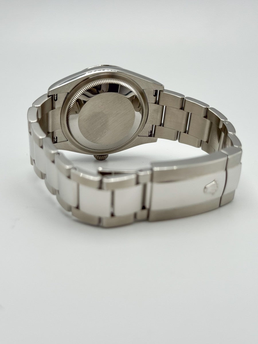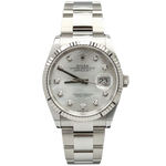 Il Rolex Datejust 126234 è l'incarnazione dell'eleganza e della raffinatezza, un orologio che si distingue per la sua cassa da 36mm in acciaio pregiato, abbinata a una ghiera zigrinata in oro bianco. Questo modello, simbolo di prestigio, è arricchito da un quadrante in madreperla, che cattura la luce in modo unico e affascinante, mentre gli indici di pietre preziose aggiungono un tocco di sfarzo discreto. Il bracciale Oyster rappresenta la fusione perfetta di comfort e stile, garantendo una vestibilità impeccabile per ogni occasione. La chiusura déployante assicura praticità e sicurezza, rendendo il Datejust non solo un segnatempo, ma un vero e proprio gioiello da indossare con orgoglio, espressione di un gusto sofisticato e di un'attenzione al dettaglio senza pari.