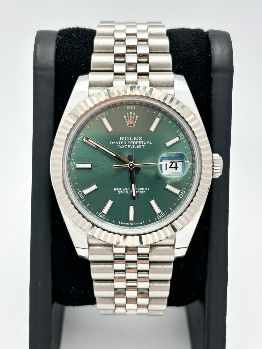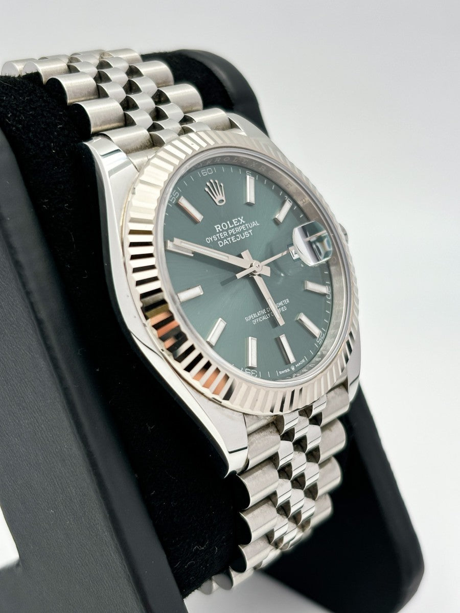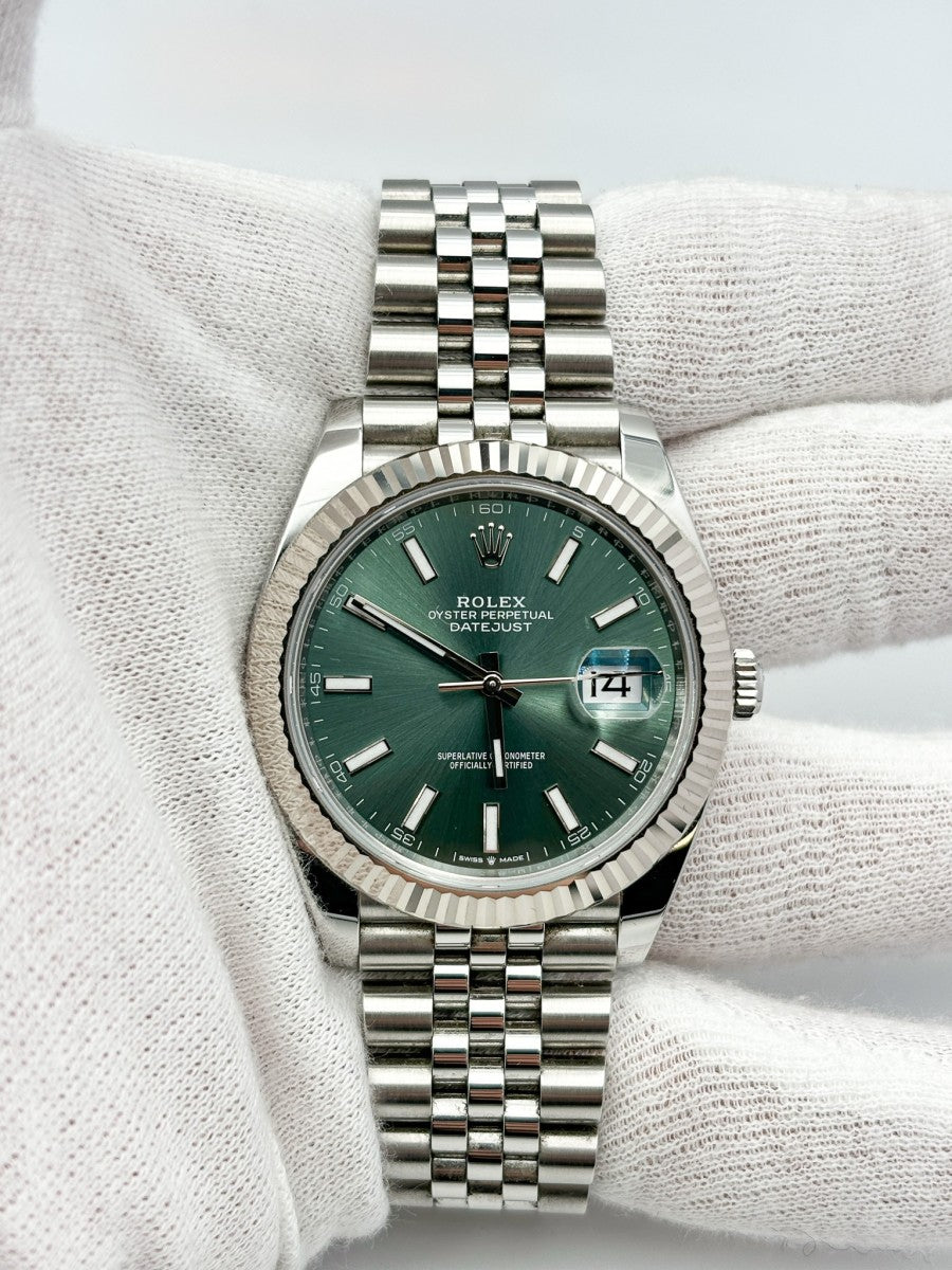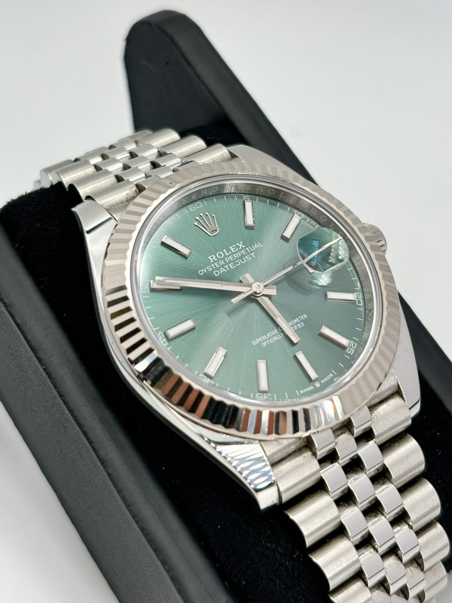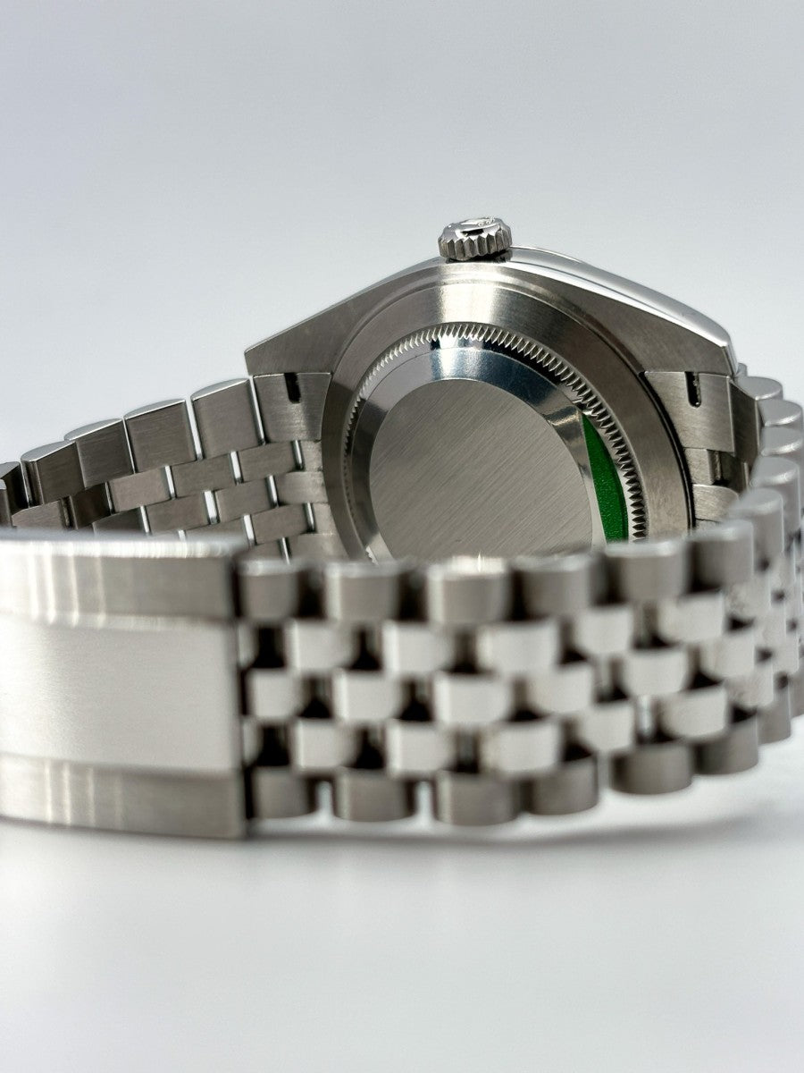 La Rolex Datejust 126334 è molto più di un semplice orologio: è un simbolo di eleganza senza tempo e raffinatezza. Con una cassa di 41 mm in acciaio inox, questo orologio si distingue per la sua ghiera zigrinata in oro bianco, che cattura la luce in modo splendido, creando giochi di riflessi che lo rendono irresistibile. Il quadrante verde, audace e distintivo, aggiunge un tocco di freschezza e originalità al design classico, rendendolo adatto a ogni occasione, da eventi formali a incontri casual. Il bracciale Jubilee, con la sua lavorazione meticolosa, offre non solo comfort, ma anche un’estetica impeccabile. La chiusura déployante garantisce sicurezza e praticità, trasformando questo capolavoro in un accessorio da indossare con orgoglio.