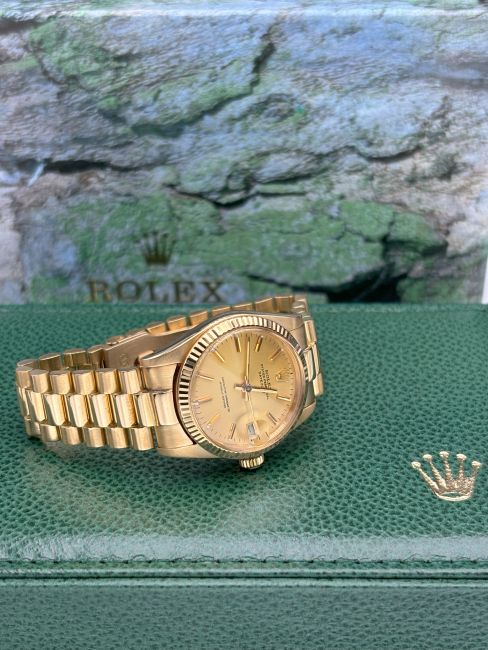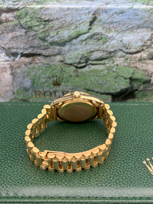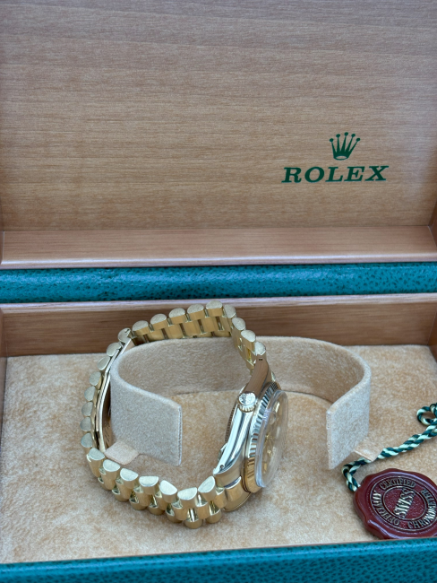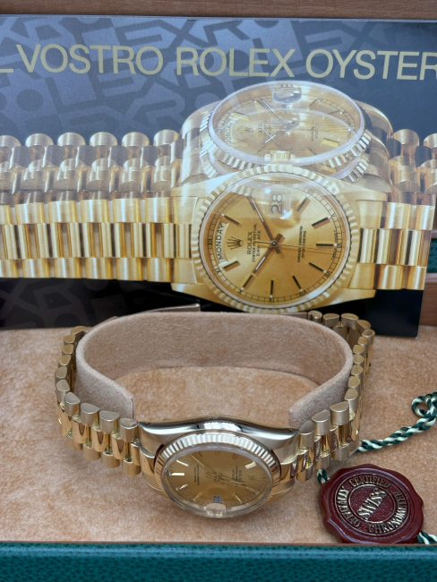 Il quadrante champagne illumina il polso con la sua luminosità calda e avvolgente, catturando l'attenzione in ogni occasione. L'abbinamento con il bracciale President, rinomato per il suo comfort e la sua eleganza, assicura che ogni indossatore possa godere di un'esperienza di lusso senza pari. Questo orologio non è solamente un segnatempo, ma un pezzo di storia che racconta un'epoca di raffinatezza e maestria artigianale.