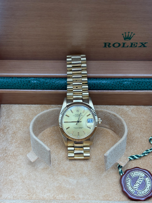 Scopri l'eleganza senza tempo del Rolex Datejust 6827, un'icona della gioielleria di lusso. Questo raffinato orologio presenta una cassa di 31mm realizzata in pregiato oro giallo, che esprime un fascino unico e una classe ineguagliabile. La ghiera zigrinata, anch'essa in oro giallo, conferisce un tocco di distinzione, rendendo questo pezzo non solo un accessorio, ma un vero e proprio simbolo di status.