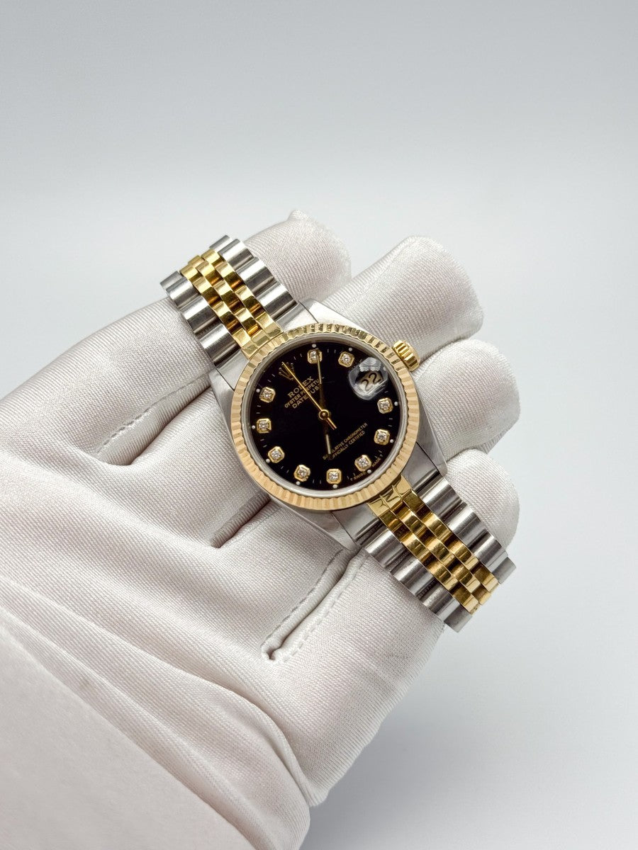 Il Rolex Datejust 68273 rappresenta un perfetto connubio di eleganza e funzionalità, un vero simbolo di distinzione per chi desidera indossare un pezzo di storia orologiera. La sua cassa da 31mm, realizzata in un sofisticato mix di oro giallo e acciaio, esprime una raffinatezza senza tempo, capace di regalare un tocco di lusso ad ogni outfit. La ghiera zigrinata, con il suo delicato gioco di luci e ombre, incornicia magnificamente il quadrante nero, abbellito da indici in pietre preziose che scintillano ad ogni movimento. Il bracciale Jubilee, con la sua struttura armoniosa, offre non solo un comfort impareggiabile, ma anche un'eleganza che non passa mai inosservata, rendendo questo orologio un autentico must-have per i collezionisti più esigenti.