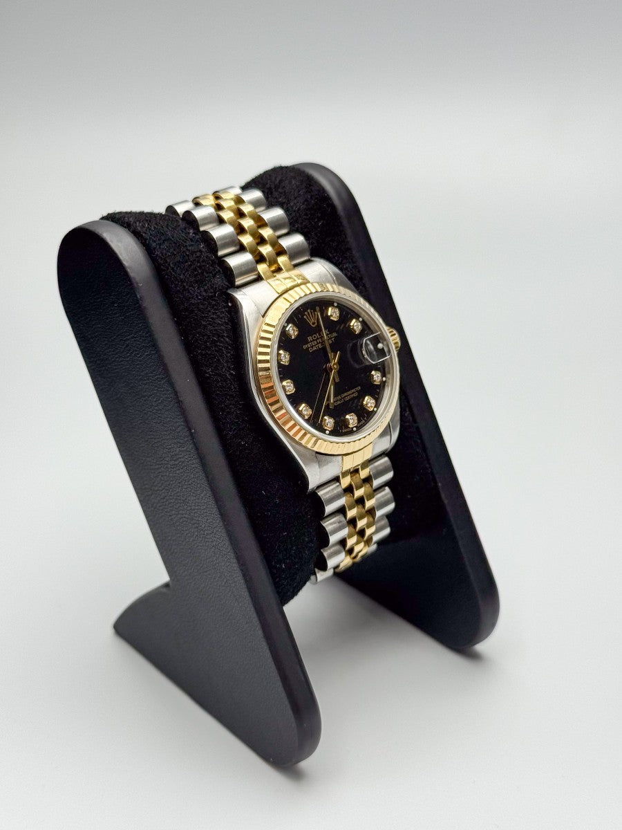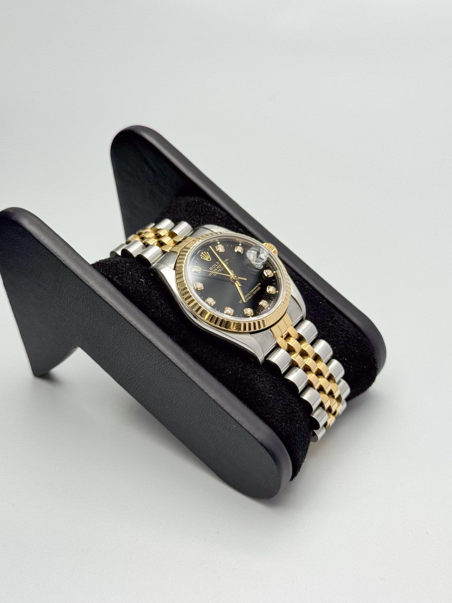 Scoprite l'eleganza senza tempo del Rolex Datejust 68273, un vero gioiello che incarna la perfezione artigianale e il lusso discreto. Con una cassa di 31 mm, questo orologio rappresenta un perfetto equilibrio tra dimensioni compatte e una presenza raffinata al polso. La ghiera zigrinata in oro giallo aggiunge un tocco di opulenza, mentre il bracciale Jubilee, simbolo di convivialità e stile, avvolge il polso con grazia e comfort. Il quadrante nero, impreziosito da indici in pietre preziose, cattura la luce in modo straordinario, rendendo ogni istante un'occasione speciale. Questo orologio non è solo un accessorio, ma un'affermazione di classe e personalità per colui che sa apprezzare il bello nella vita.