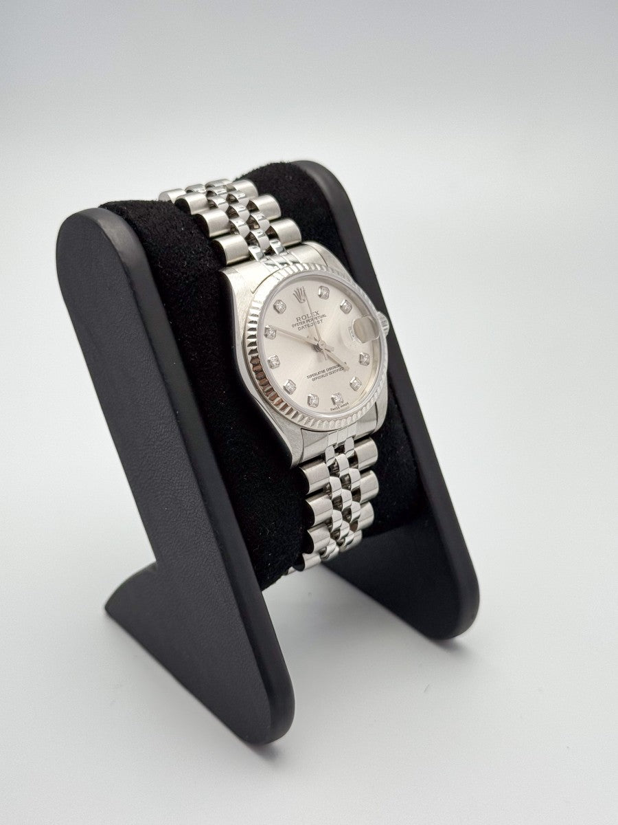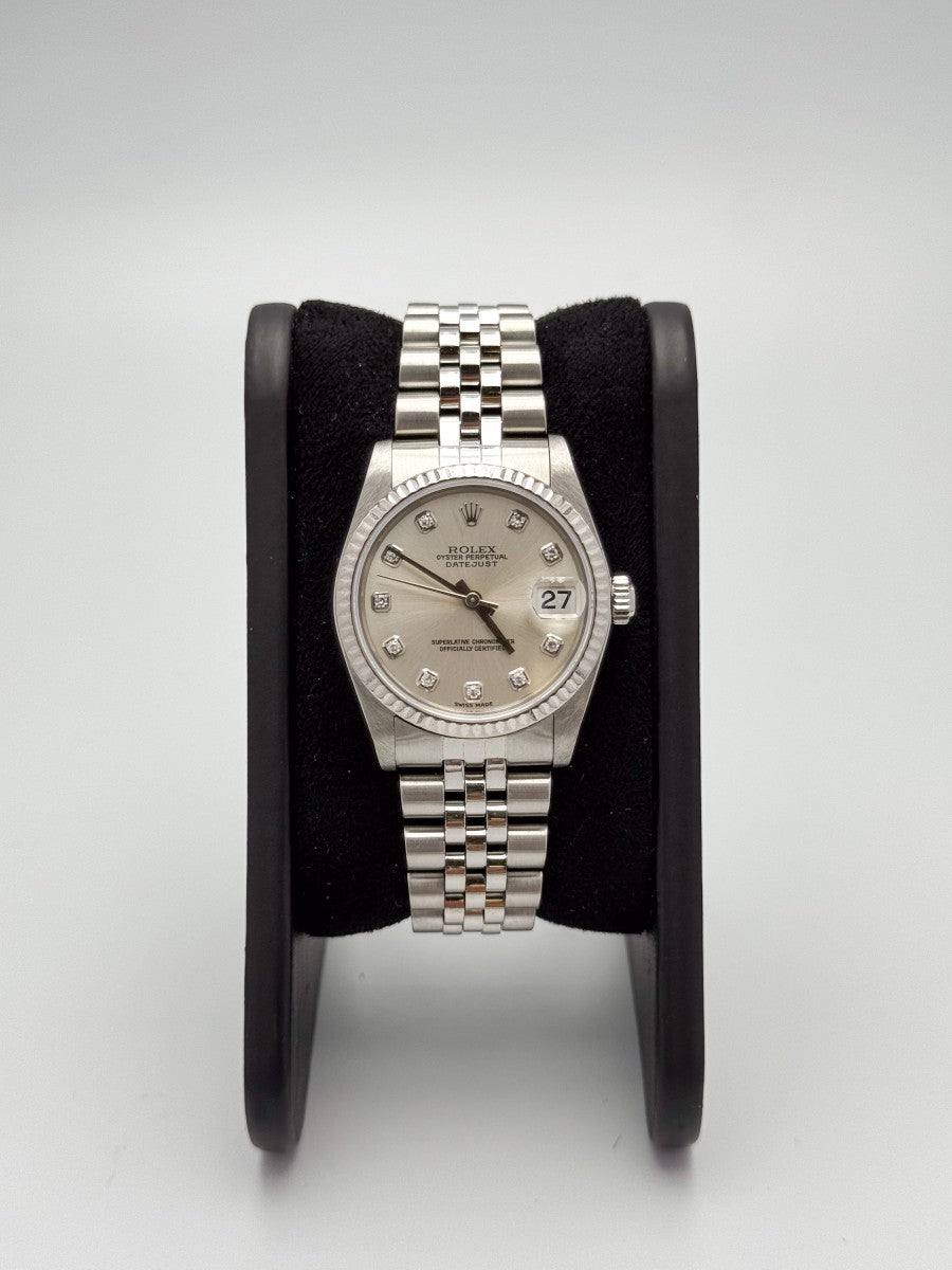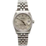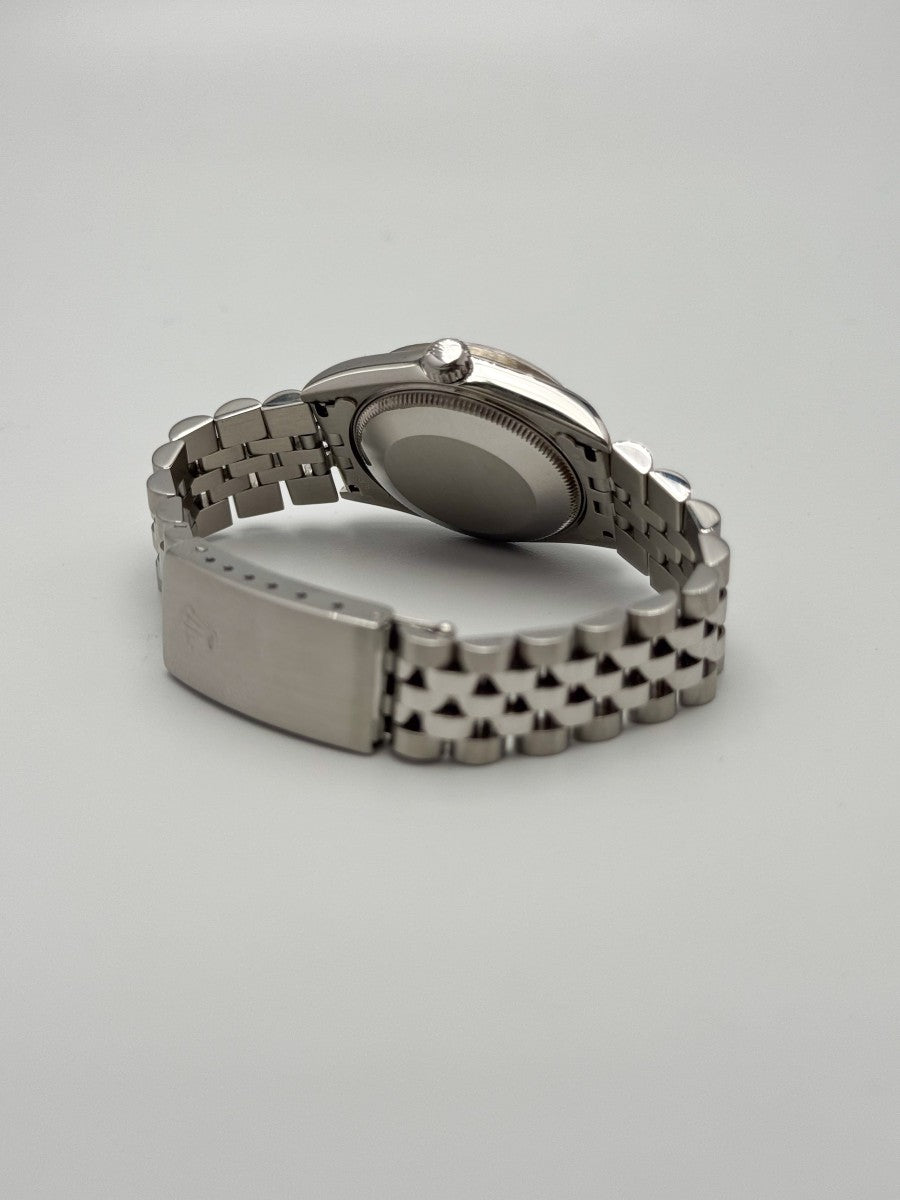 La bellezza senza tempo del Rolex Datejust 78274 si rivela in ogni dettaglio, trasformando un semplice orologio in un simbolo di eleganza e raffinatezza. La sua cassa da 31 mm, realizzata in pregiato acciaio, incornicia un quadrante silver che cattura la luce e riflette il carattere distintivo di chi lo indossa. Gli indici, arricchiti da pietre preziose, aggiungono un tocco di lusso, mentre la ghiera zigrinata in oro bianco conferisce un’ulteriore dimensione di classe e preziosità. Il bracciale Jubilee, con la sua lavorazione impeccabile, assicura un comfort che si sposa perfettamente con l'estetica sofisticata di questo capolavoro dell'orologeria. Indossare il Datejust 78274 significa abbracciare un'eredità di stile e qualità che trascende il tempo.