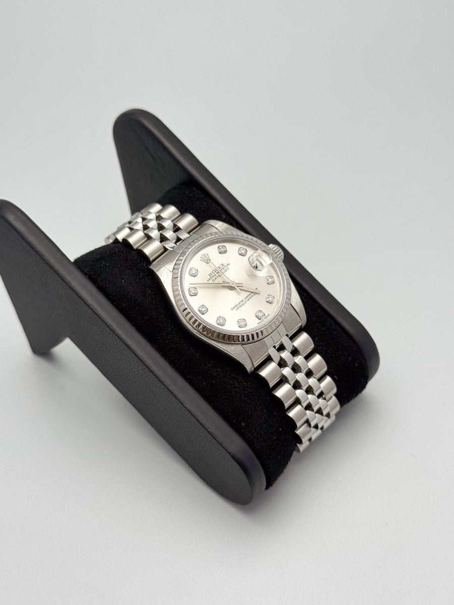Scoprite l’eleganza senza tempo della Rolex Datejust 78274, un’autentica icona di lusso che incarna la perfetta armonia tra prestigio e funzionalità. Con una cassa di 31mm, questo orologio si distingue per la sua ghiera zigrinata in oro bianco, che conferisce un tocco di raffinatezza e brillantezza ad ogni movimento. Il bracciale Jubilee, simbolo di comodità e stile, avvolge delicatamente il polso, mentre il quadrante silver, impreziosito da indici in pietre preziose, cattura la luce in modo incantevole, creando un gioco di riflessi unico. Realizzato in acciaio di alta qualità, il Rolex Datejust 78274 non è solo un orologio, ma un vero e proprio gioiello di alta orologeria, pensato per coloro che cercano l'eccellenza in ogni dettaglio.