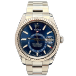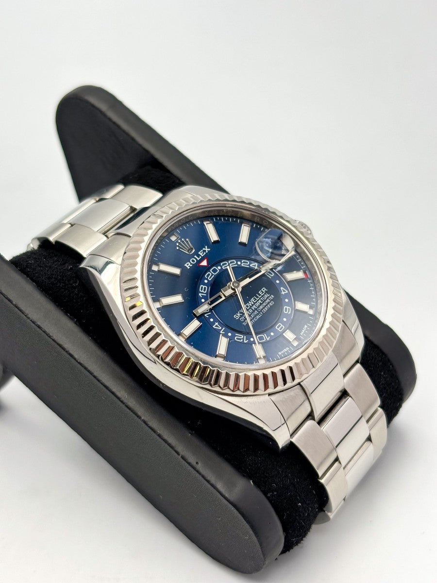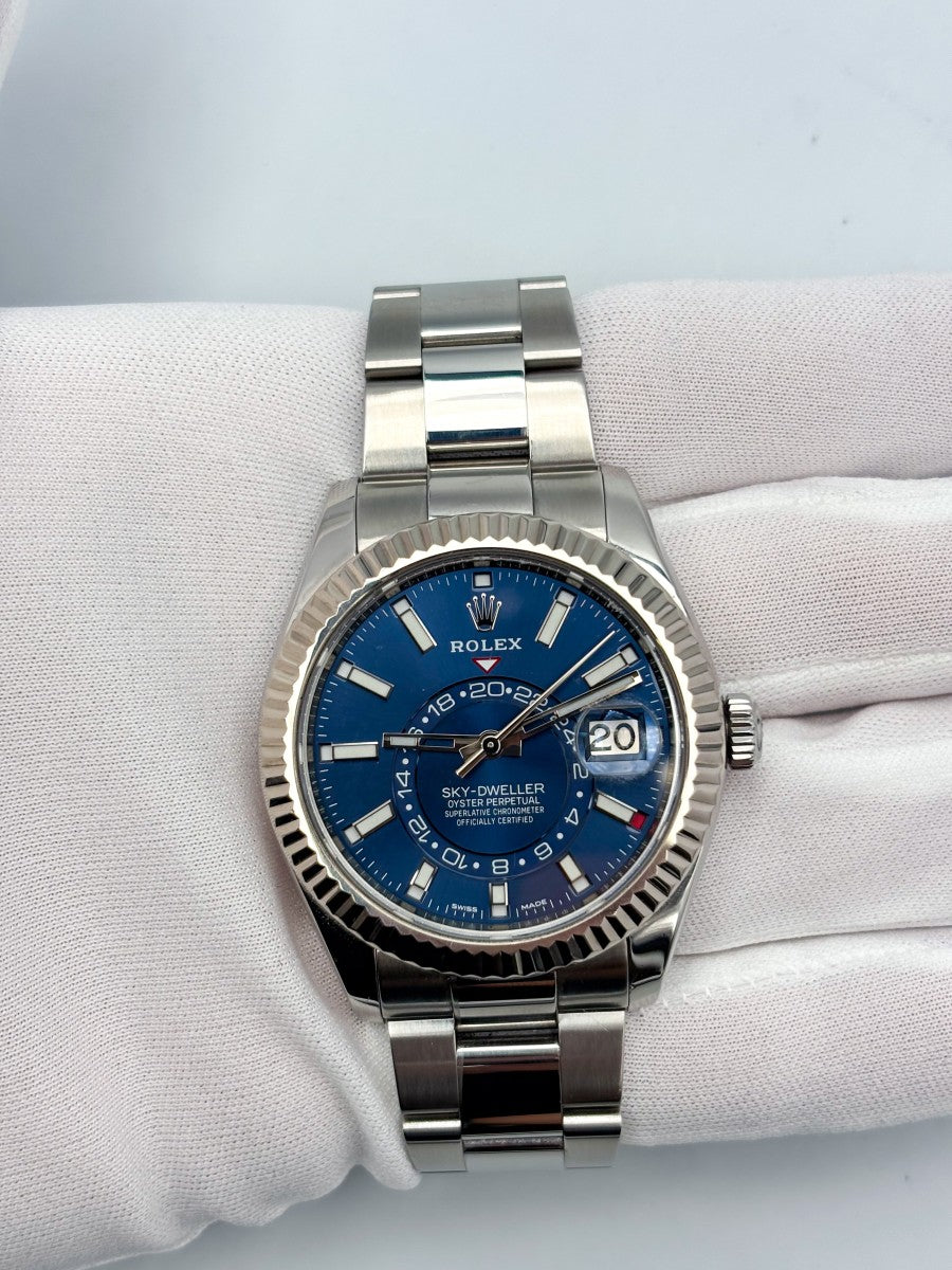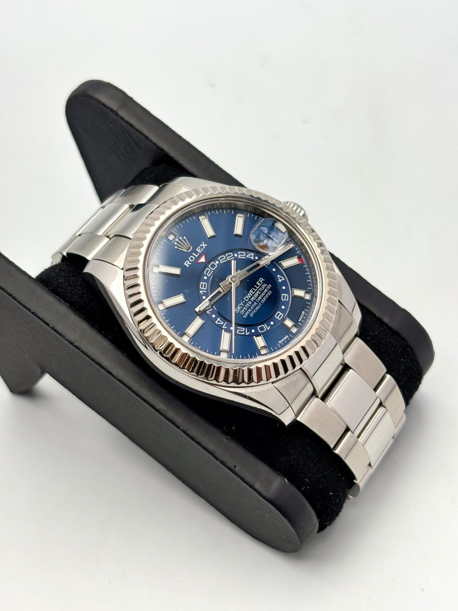 Il Rolex Sky-Dweller 326934 è un’autentica opera d’arte che coniuga magistralmente l’innovazione tecnica e l’eleganza senza tempo. Questo modello si distingue per la sua ghiera zigrinata in oro bianco, che aggiunge un tocco di raffinatezza al già straordinario design. Il quadrante blu, profondo e suggestivo, cattura l'attenzione e riflette la luce in modi affascinanti, rendendolo un compagno ideale sia per eventi formali che per occasioni informali. La robustezza dell'acciaio, unita alla comodità del bracciale Oyster, assicura un’eccellente vestibilità e durata, perfetta per chi vive una vita dinamica e piena di impegni. La chiusura déployante, poi, offre praticità e sicurezza, facendo del Rolex Sky-Dweller un accessorio di prestigio e funzionalità. Indossarlo significa non solo segnare il tempo, ma anche affermare il proprio stile e la propria personalità.