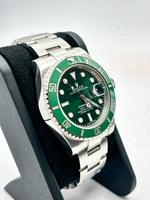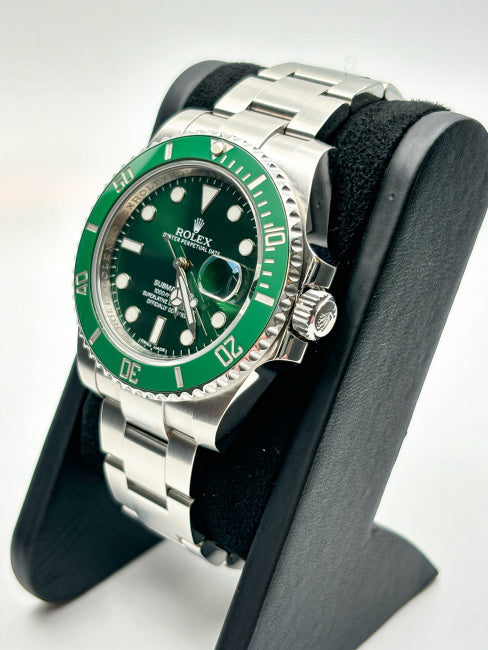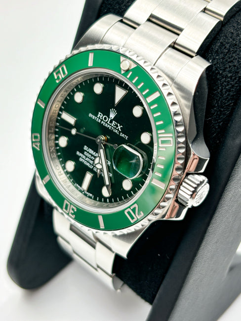 Il Submariner Hulk 116610LV si distingue per la sua lunetta in ceramica verde e il quadrante coordinato, simboli di robustezza e funzionalità subacquea. Realizzato in acciaio Oystersteel da 40 mm, garantisce resistenza all’acqua fino a 300 metri, ideale per immersioni professionali. Il vetro zaffiro antigraffio e il display Chromalight assicurano durabilità e leggibilità ottimale anche in condizioni di scarsa illuminazione. Un orologio che unisce precisione tecnica, resistenza e uno stile inconfondibile, espressione della maestria Rolex nel settore degli orologi subacquei di lusso.