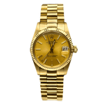 Il quadrante champagne illumina il polso con la sua luminosità calda e avvolgente, catturando l'attenzione in ogni occasione. L'abbinamento con il bracciale President, rinomato per il suo comfort e la sua eleganza, assicura che ogni indossatore possa godere di un'esperienza di lusso senza pari. Questo orologio non è solamente un segnatempo, ma un pezzo di storia che racconta un'epoca di raffinatezza e maestria artigianale.