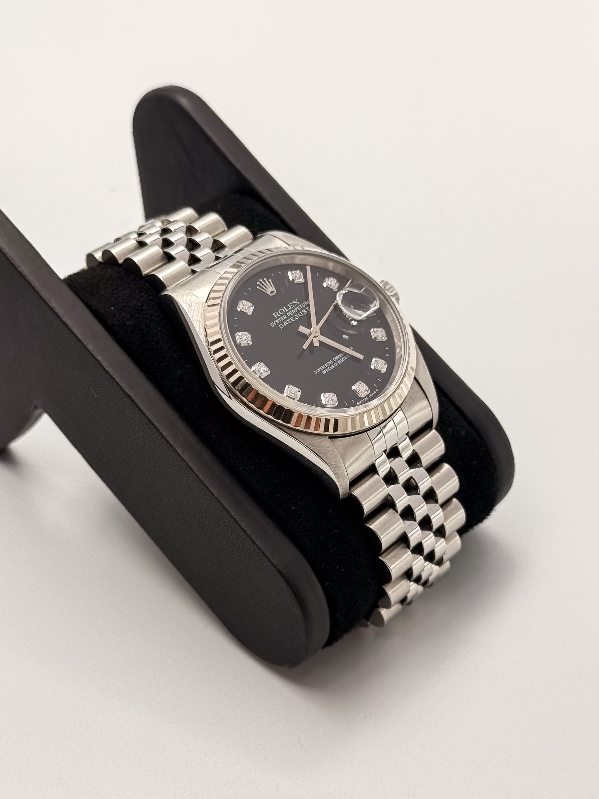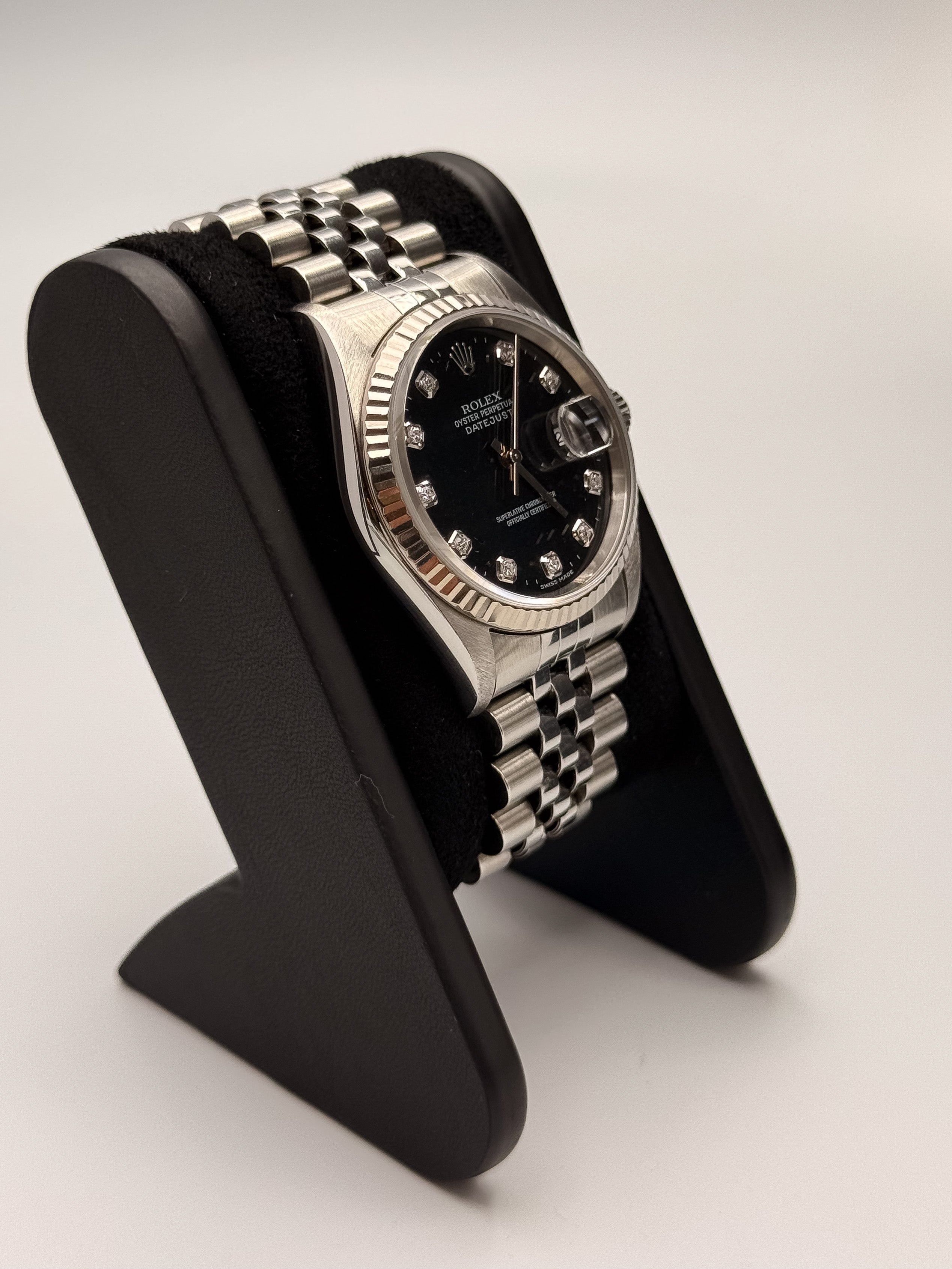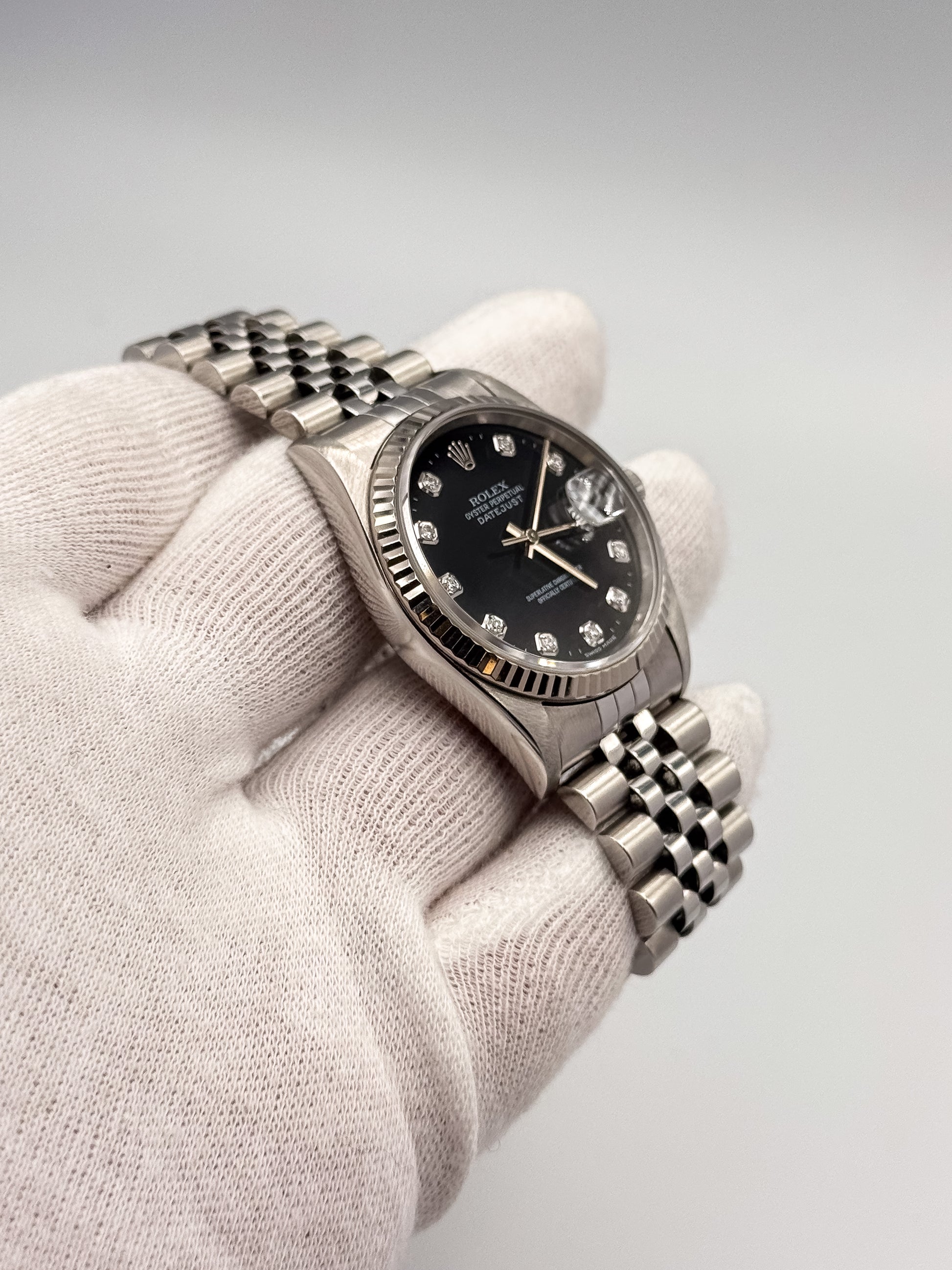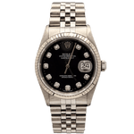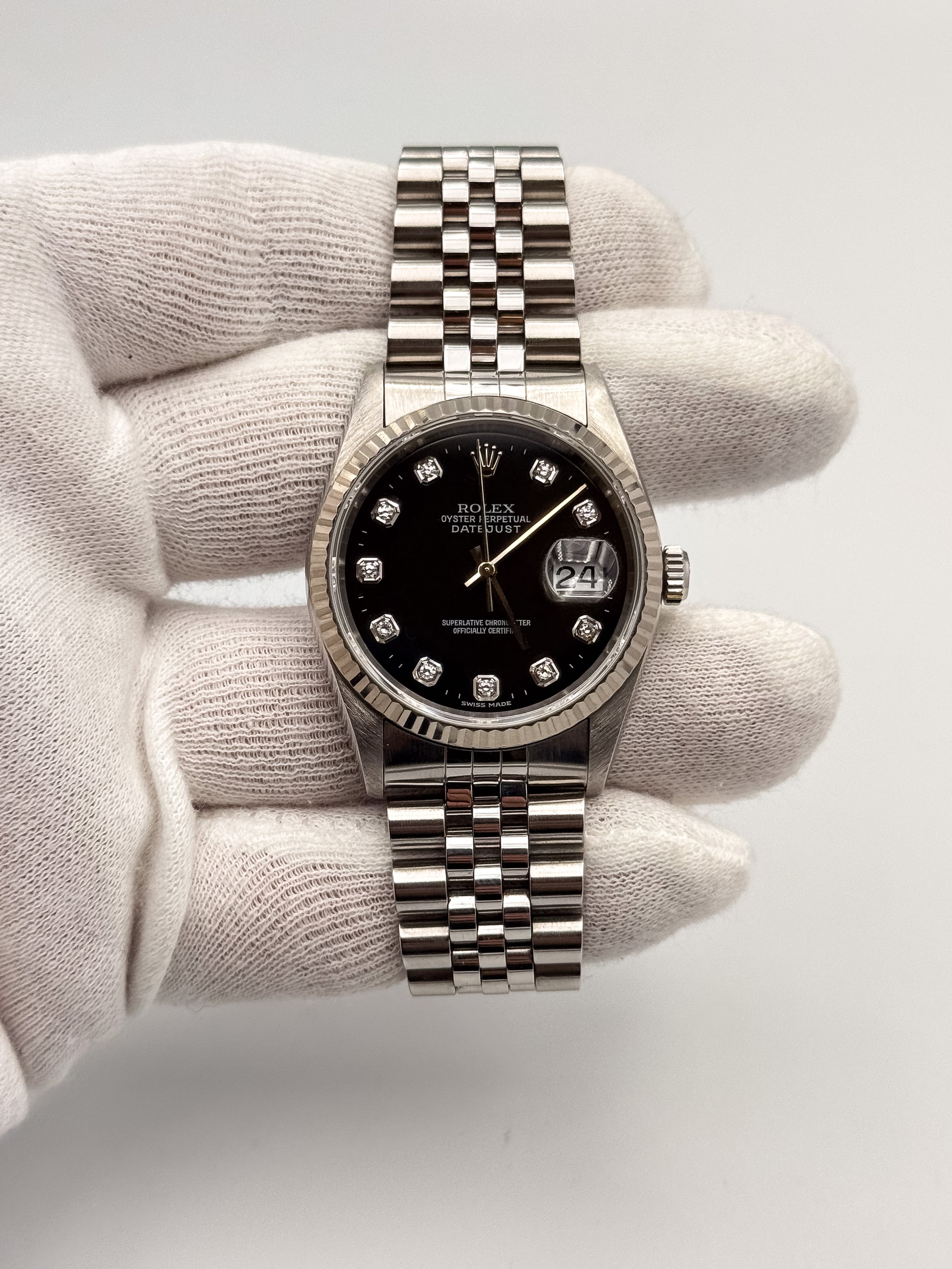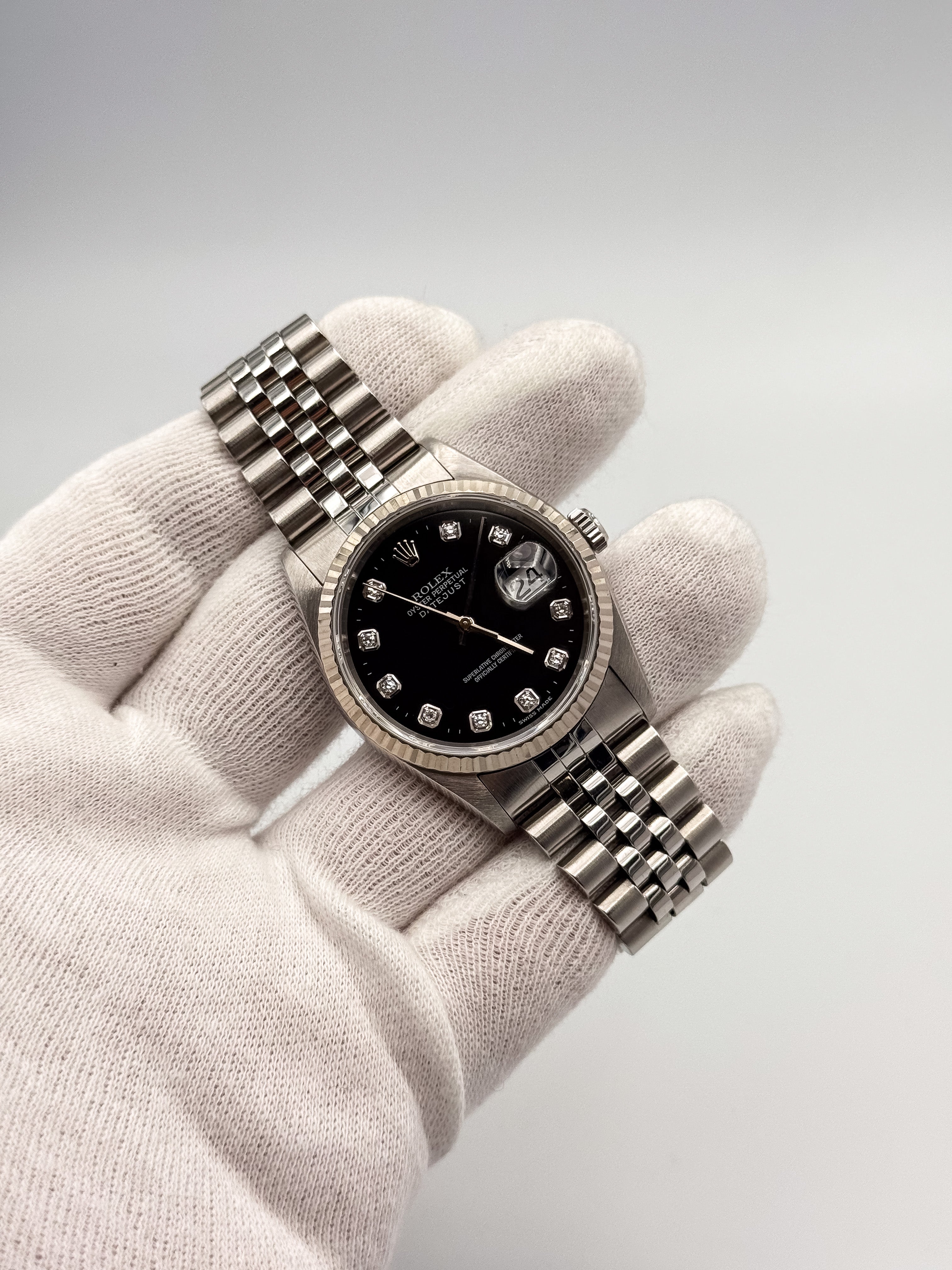 Datejust 16234 con quadrante nero impreziosito da diamanti, un capolavoro di orologeria che incarna l'eleganza senza tempo. Questo modello combina la precisione svizzera con un design raffinato, caratterizzato da una cassa in acciaio e ghiera in oro bianco che esalta il contrasto del quadrante scuro. I diamanti, sapientemente posizionati, catturano la luce con discrezione, conferendo un tocco di lusso sobrio. Il cristallo zaffiro antigraffio e la resistenza all'acqua garantiscono affidabilità quotidiana. Un orologio che trascende le mode, perfetto per chi apprezza l'eccellenza artigianale e la versatilità senza compromessi.