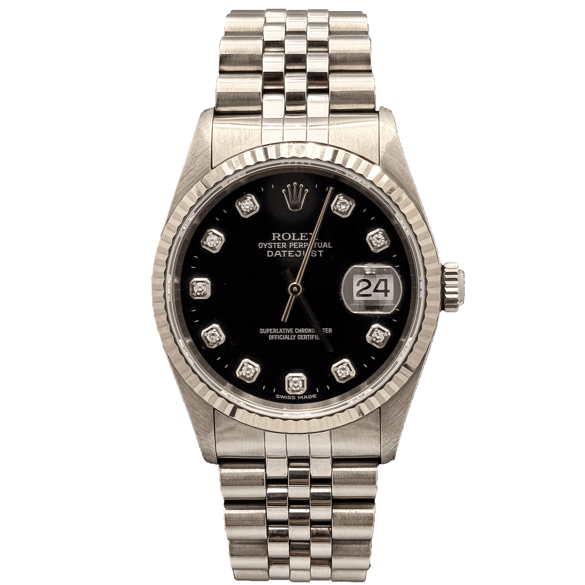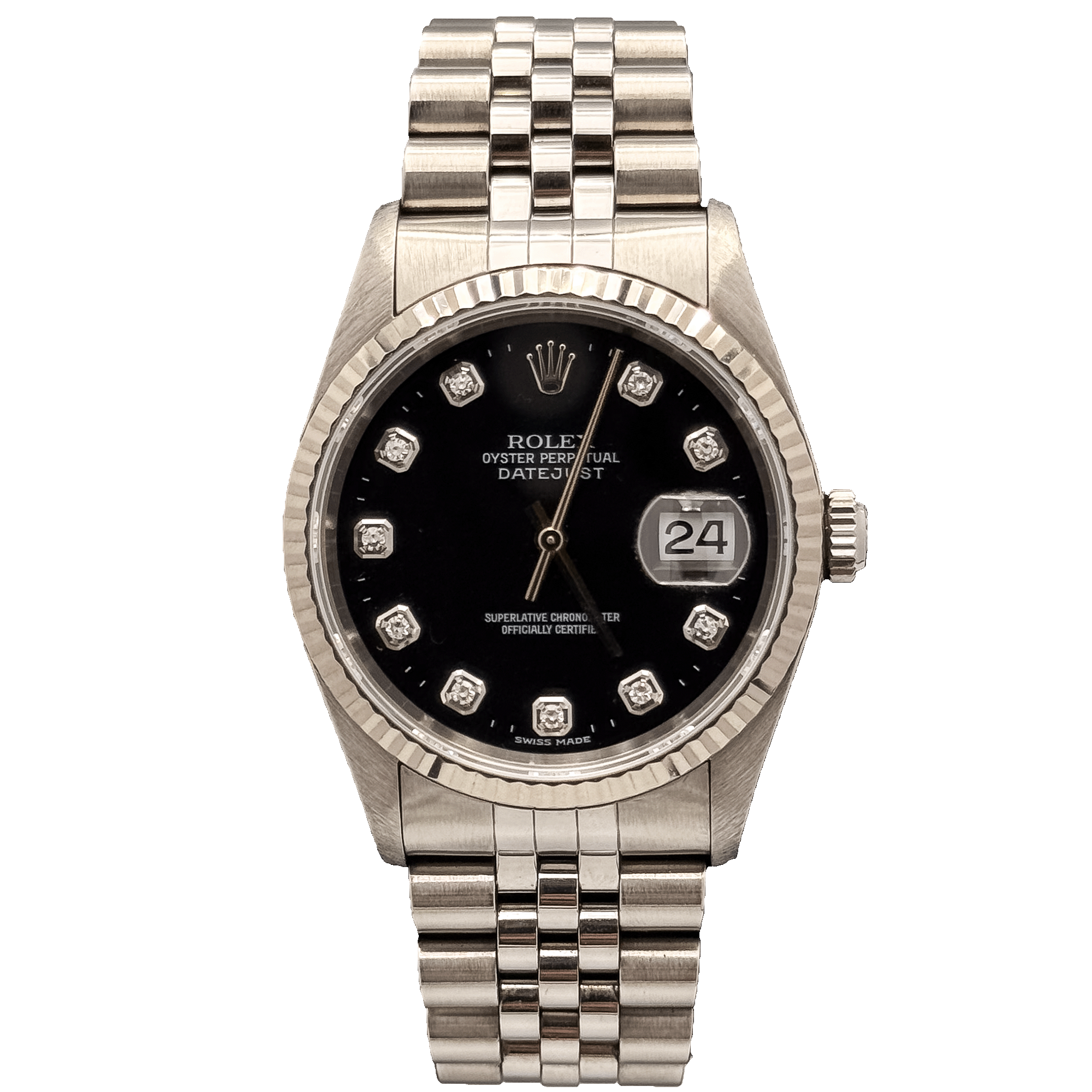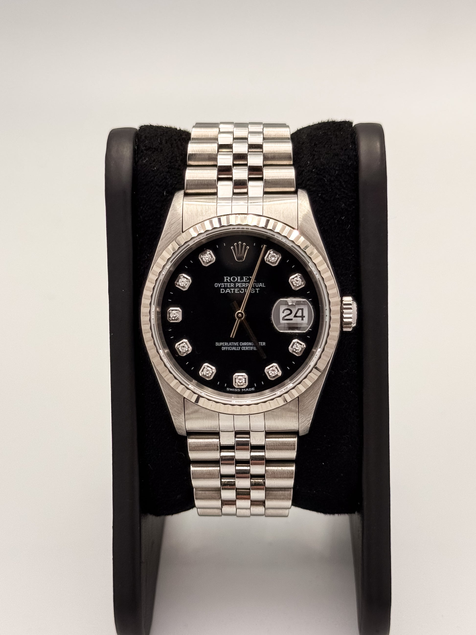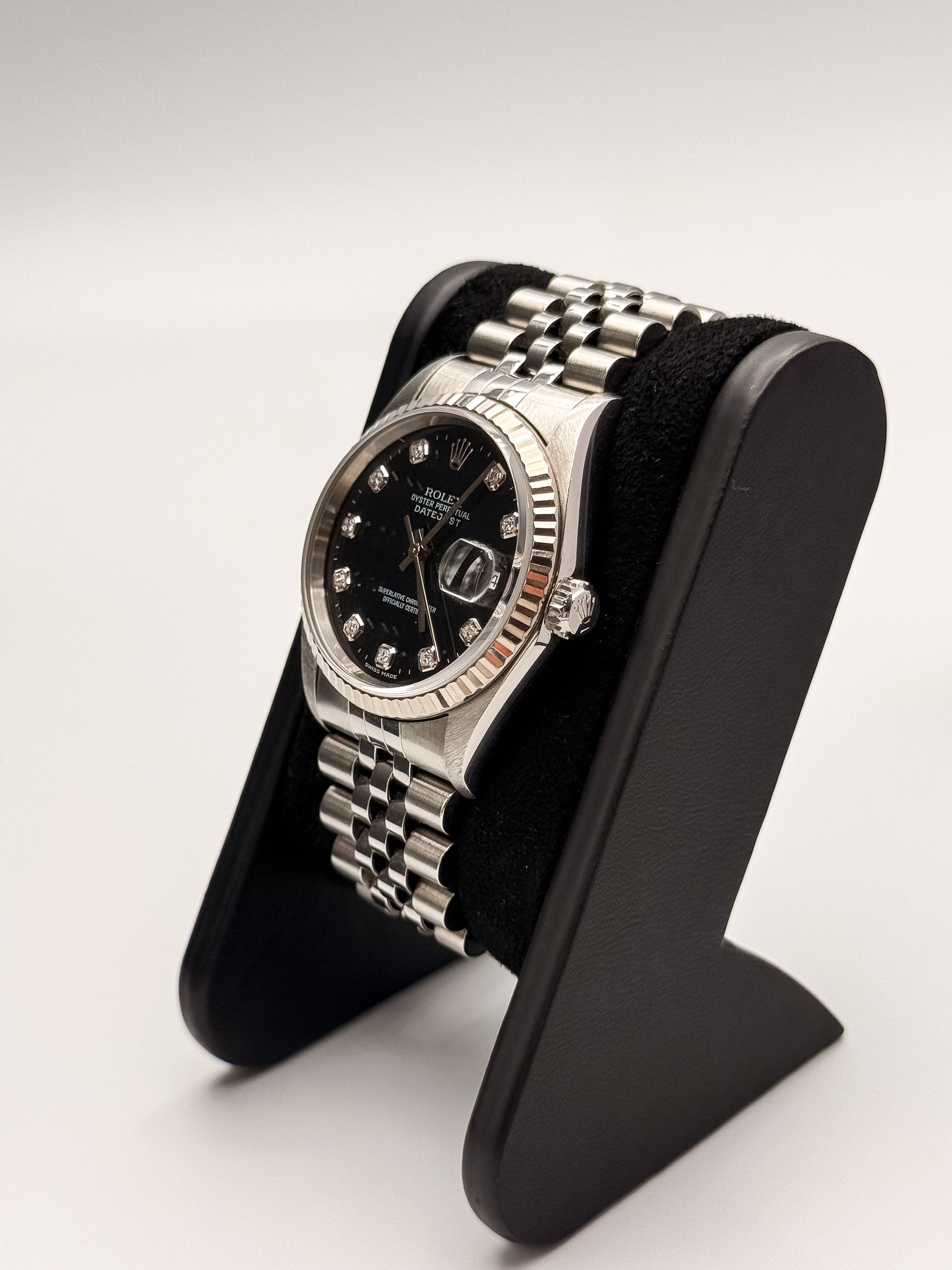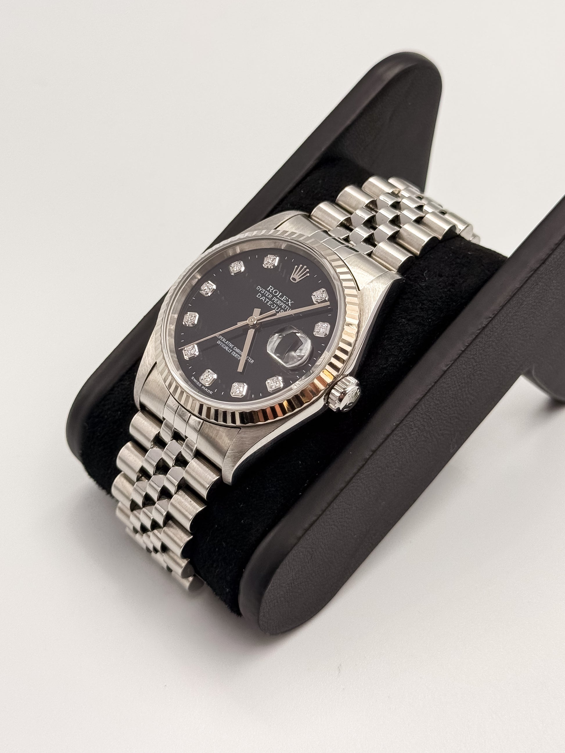 Datejust 16234 con quadrante nero impreziosito da diamanti, un capolavoro di orologeria che incarna l'eleganza senza tempo. Questo modello combina la precisione svizzera con un design raffinato, caratterizzato da una cassa in acciaio e ghiera in oro bianco che esalta il contrasto del quadrante scuro. I diamanti, sapientemente posizionati, catturano la luce con discrezione, conferendo un tocco di lusso sobrio. Il cristallo zaffiro antigraffio e la resistenza all'acqua garantiscono affidabilità quotidiana. Un orologio che trascende le mode, perfetto per chi apprezza l'eccellenza artigianale e la versatilità senza compromessi.