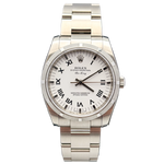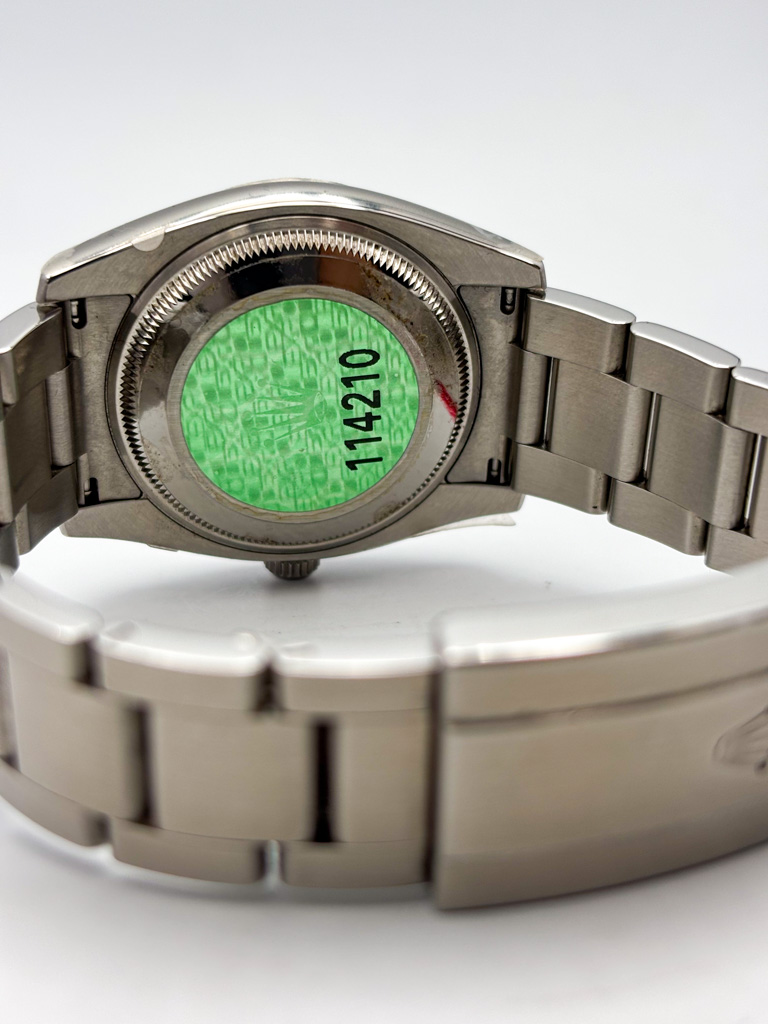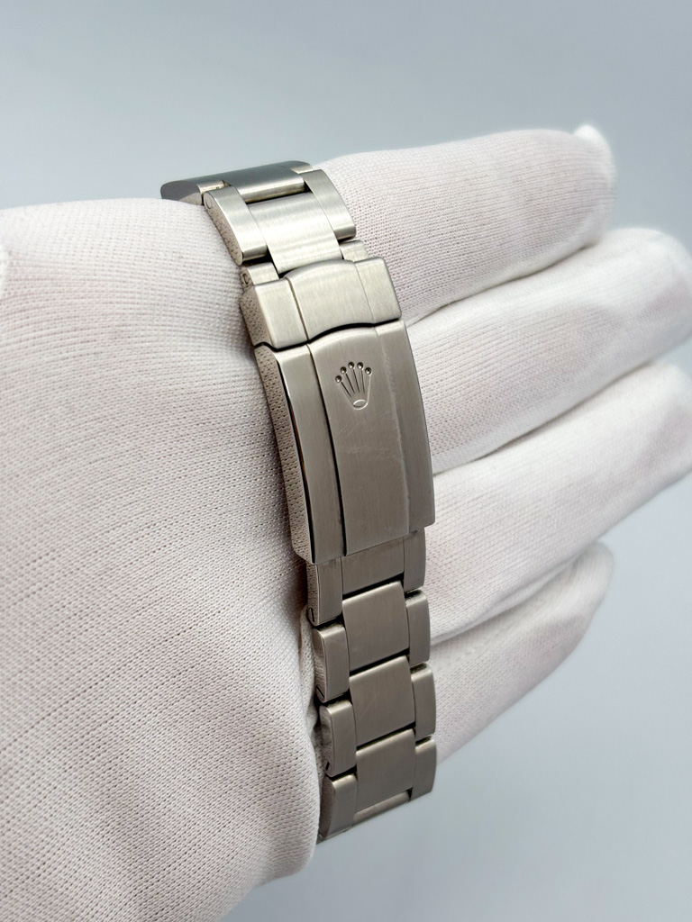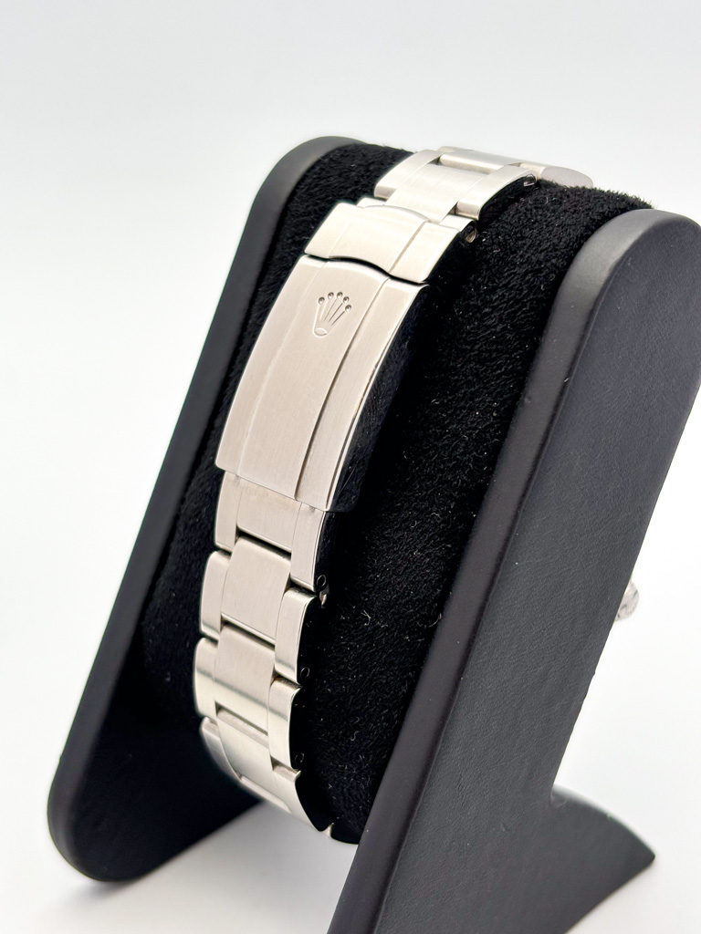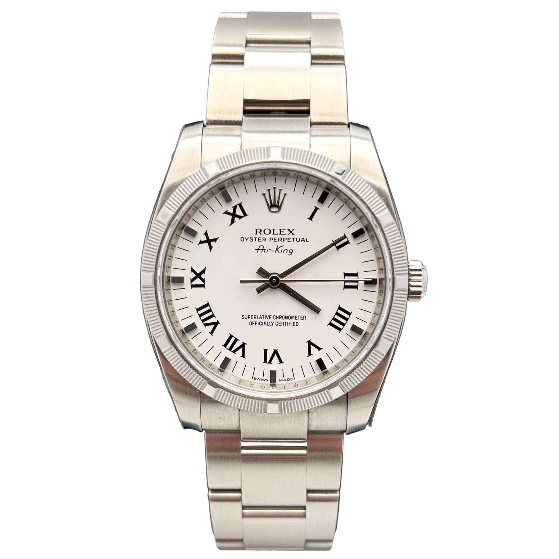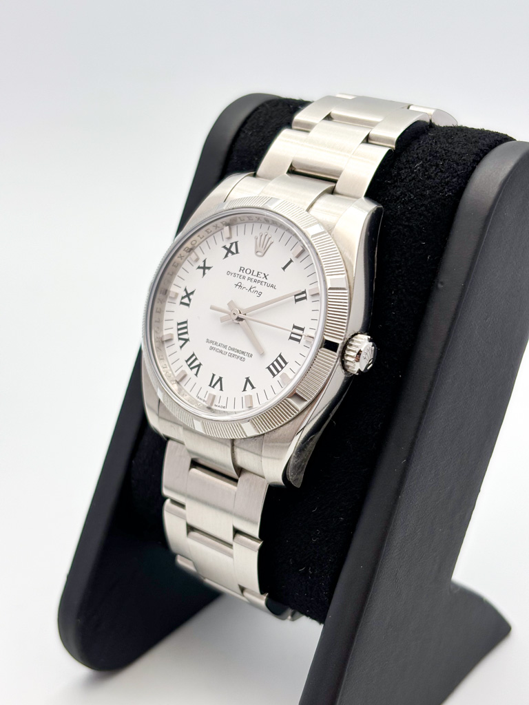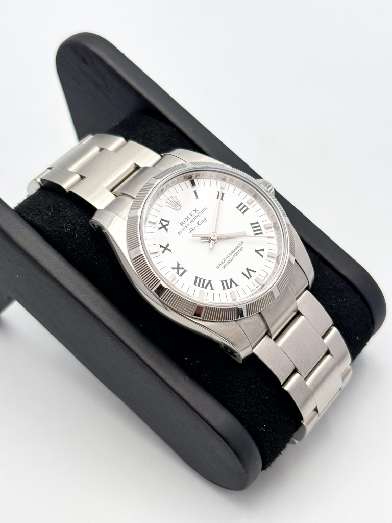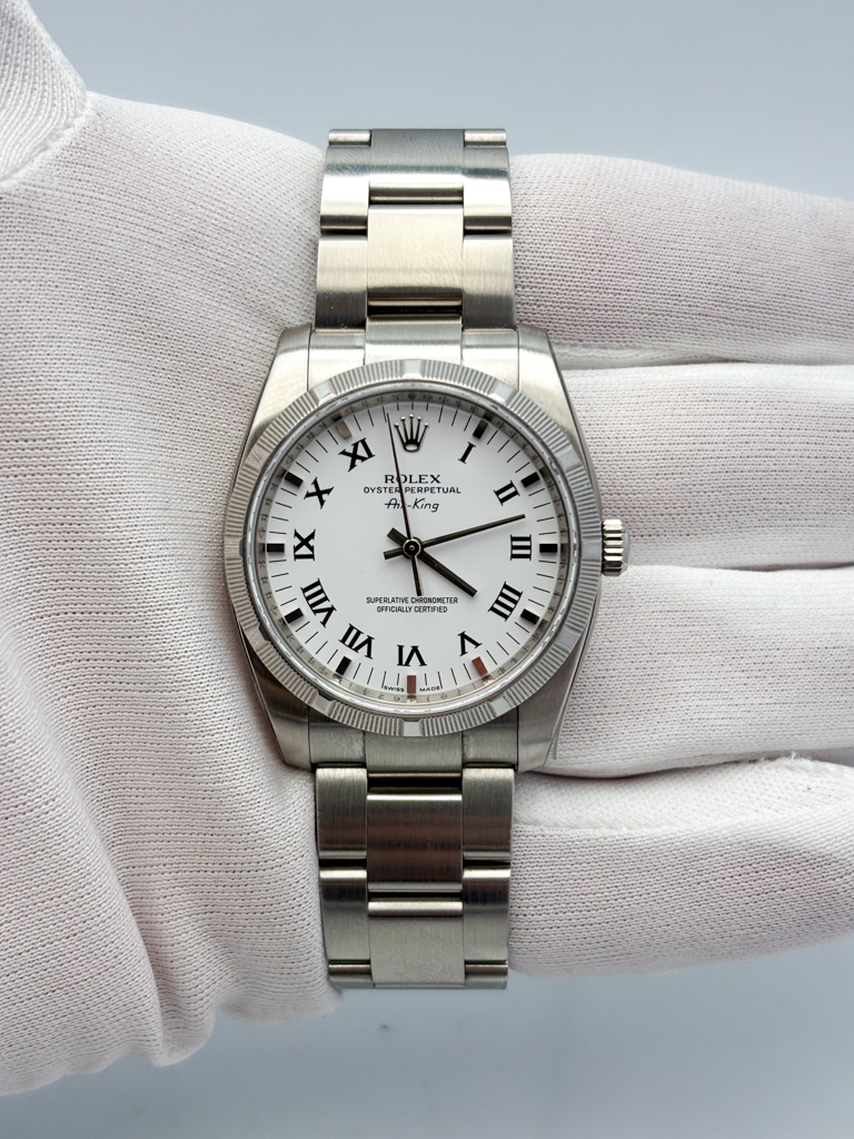 Rolex Air-King 114210, completo di corredo originale. La cassa in acciaio da 34mm è abbinata a un elegante bracciale Oyster e a una ghiera zigrinata. Il quadrante bianco presenta indici romani, offrendo una lettura chiara e raffinata. La chiusura deployante garantisce comfort e sicurezza al polso. Un orologio di prestigio dal design classico, perfetto per chi cerca affidabilità e stile senza compromessi.