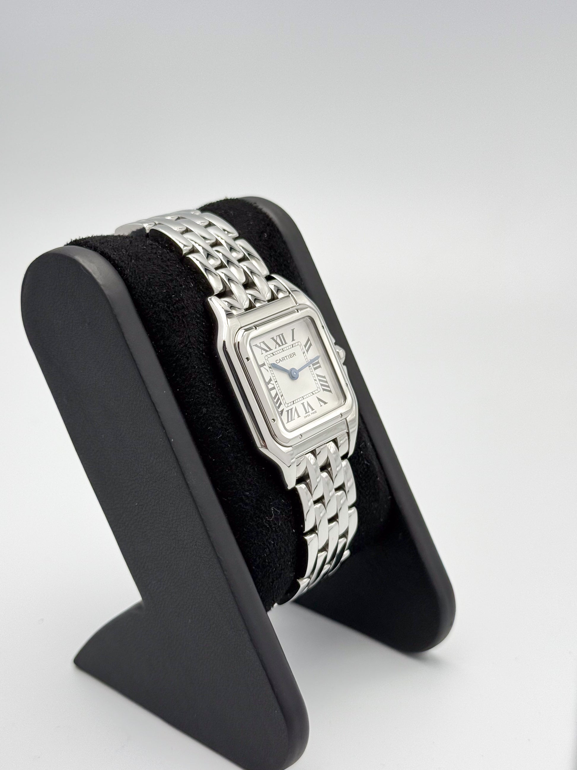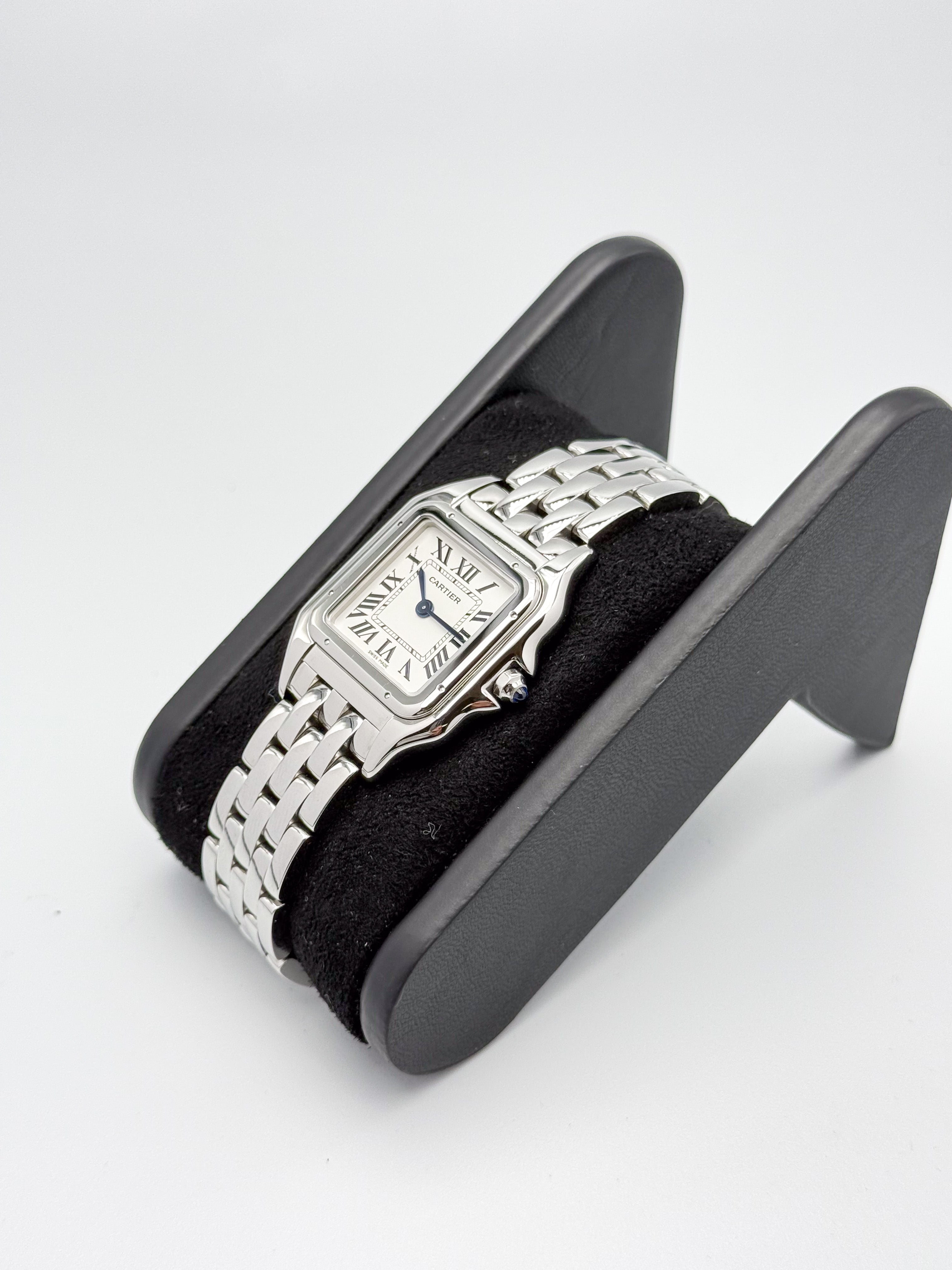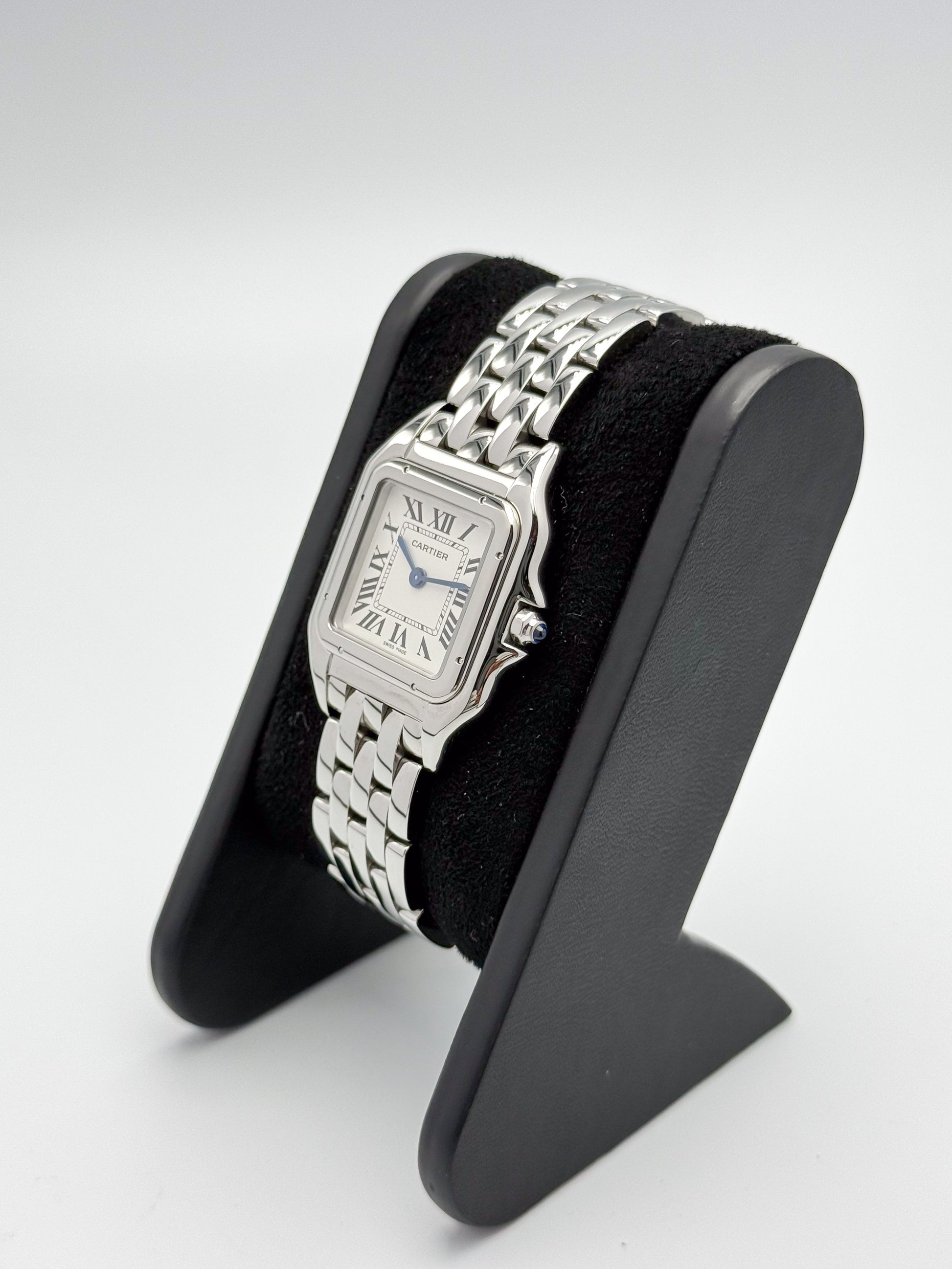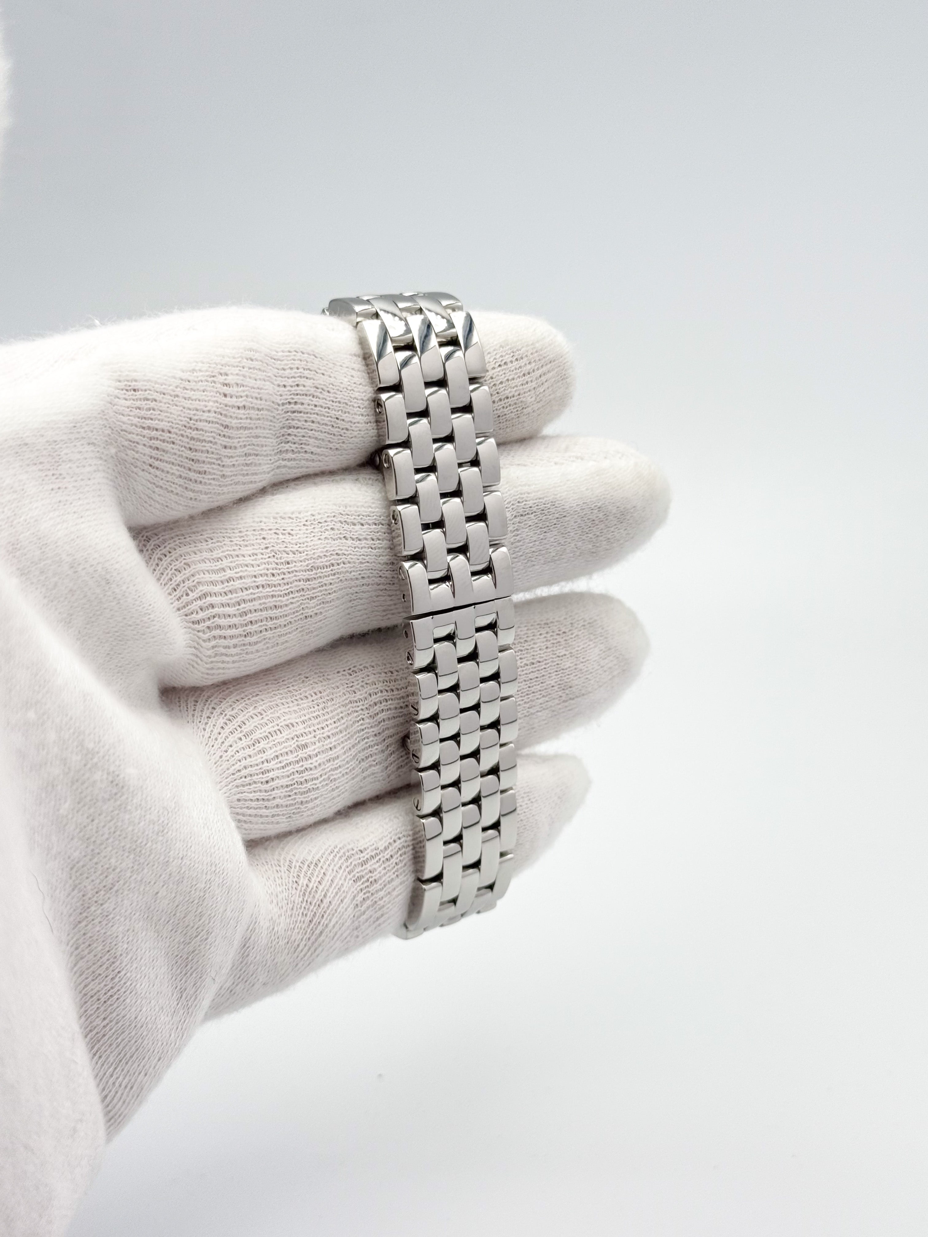 Panthère de Cartier, l'icona degli anni '80 che incarna l'eleganza felina della Maison. Questo orologio gioiello di medie dimensioni (27 x 37 mm) combina raffinatezza e versatilità, perfetto per chi ricerca uno stile deciso e sofisticato. Movimento a quarzo, cassa in acciaio con corona ornata di spinello sintetico blu, quadrante argentato e lancette a gladio azzurrato. Il bracciale in acciaio, straordinariamente flessibile, evoca le movenze sinuose della pantera. Resistente all'acqua fino a 30 metri, rappresenta l'equilibrio ideale tra gioiello e orologio da polso.