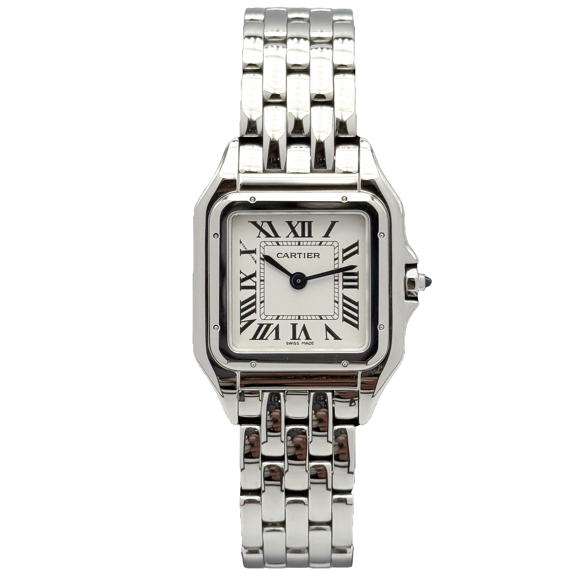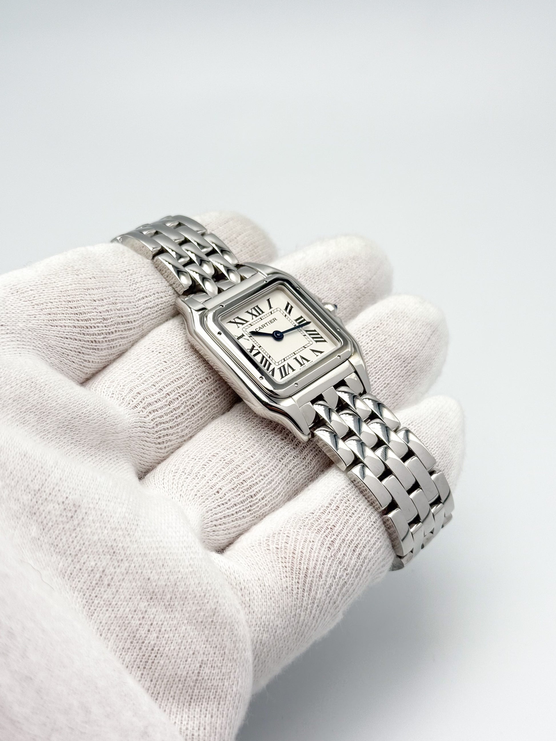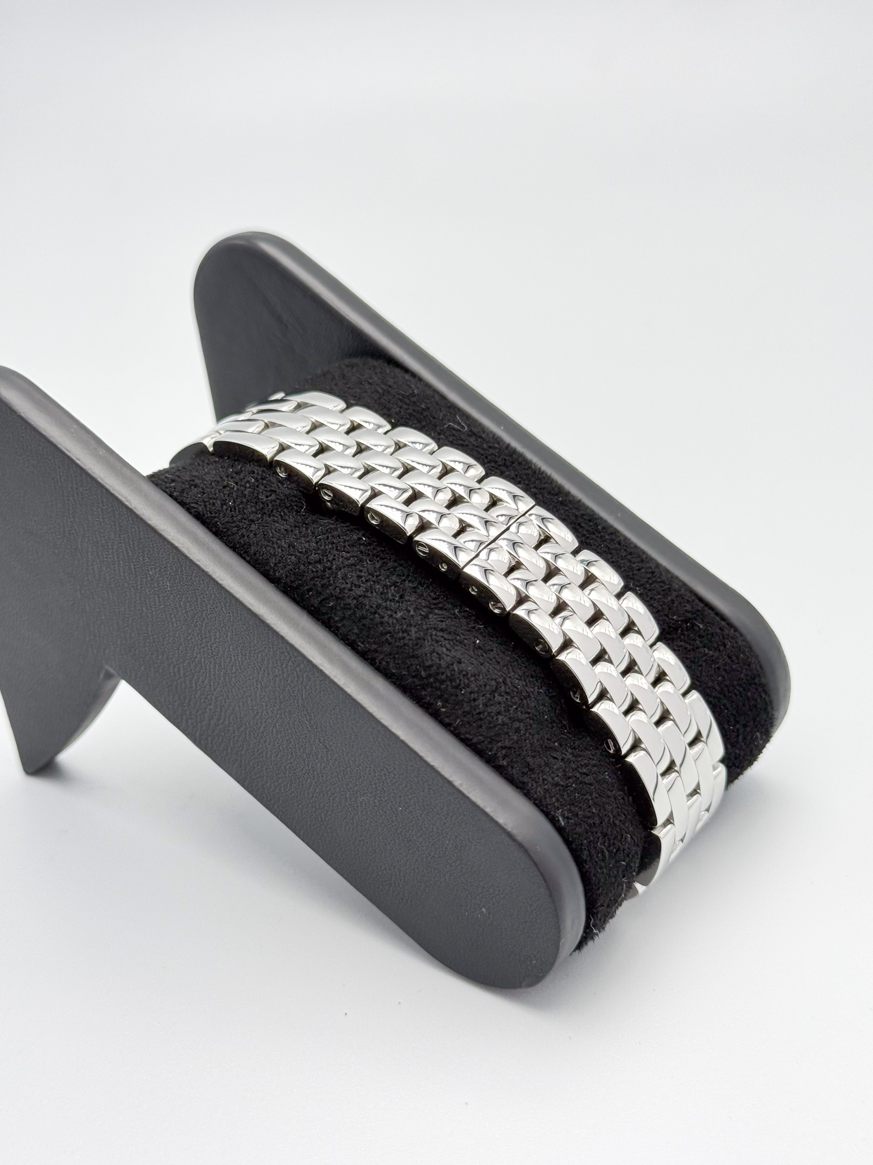 Panthère de Cartier, l'icona degli anni '80 che incarna l'eleganza felina della Maison. Questo orologio gioiello di medie dimensioni (27 x 37 mm) combina raffinatezza e versatilità, perfetto per chi ricerca uno stile deciso e sofisticato. Movimento a quarzo, cassa in acciaio con corona ornata di spinello sintetico blu, quadrante argentato e lancette a gladio azzurrato. Il bracciale in acciaio, straordinariamente flessibile, evoca le movenze sinuose della pantera. Resistente all'acqua fino a 30 metri, rappresenta l'equilibrio ideale tra gioiello e orologio da polso.