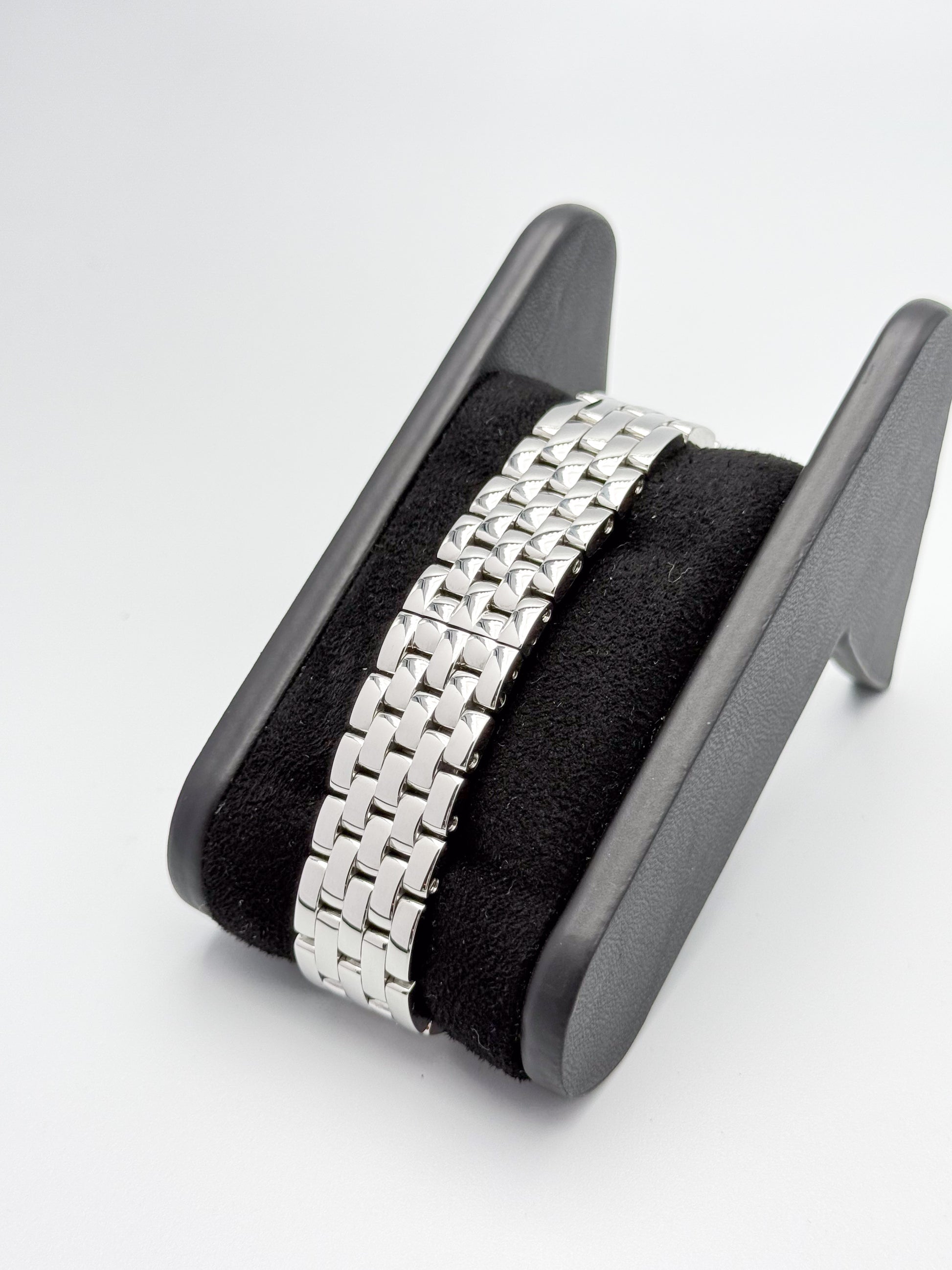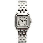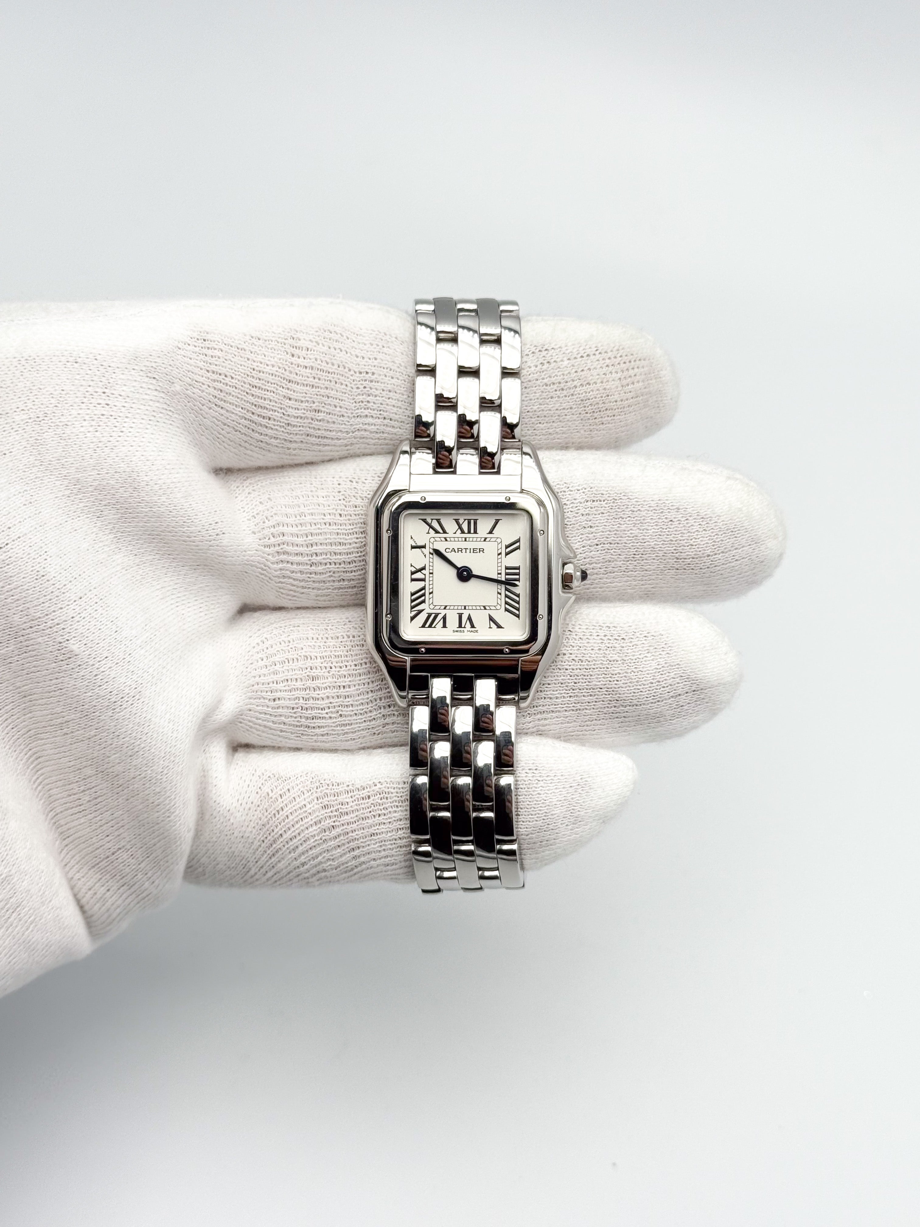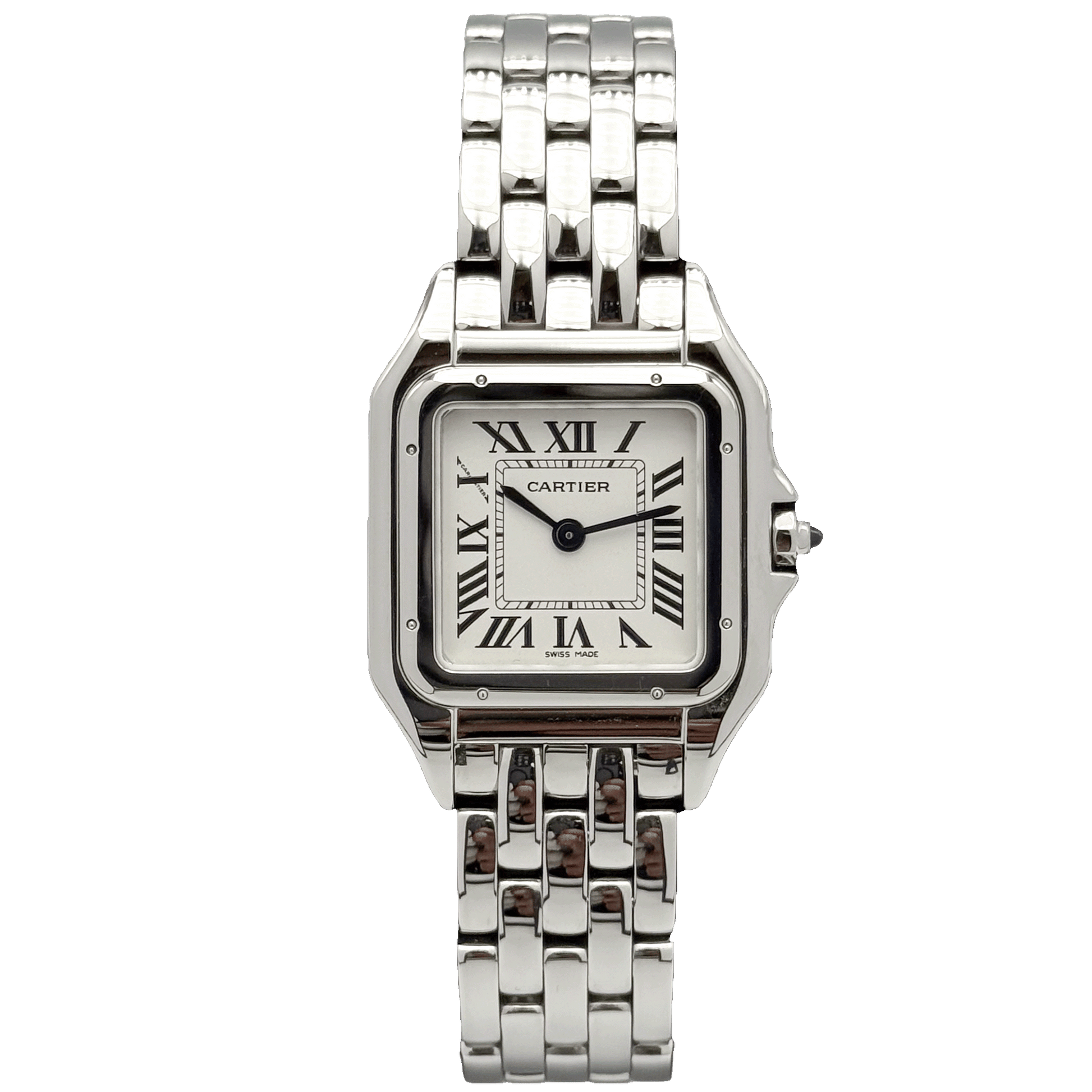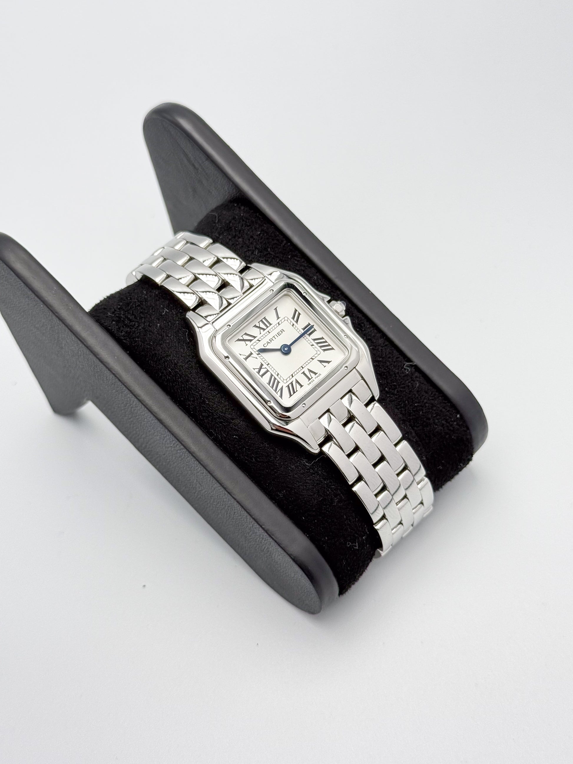 Panthère de Cartier, l'icona degli anni '80 che incarna l'eleganza felina della Maison. Questo orologio gioiello di medie dimensioni (27 x 37 mm) combina raffinatezza e versatilità, perfetto per chi ricerca uno stile deciso e sofisticato. Movimento a quarzo, cassa in acciaio con corona ornata di spinello sintetico blu, quadrante argentato e lancette a gladio azzurrato. Il bracciale in acciaio, straordinariamente flessibile, evoca le movenze sinuose della pantera. Resistente all'acqua fino a 30 metri, rappresenta l'equilibrio ideale tra gioiello e orologio da polso.