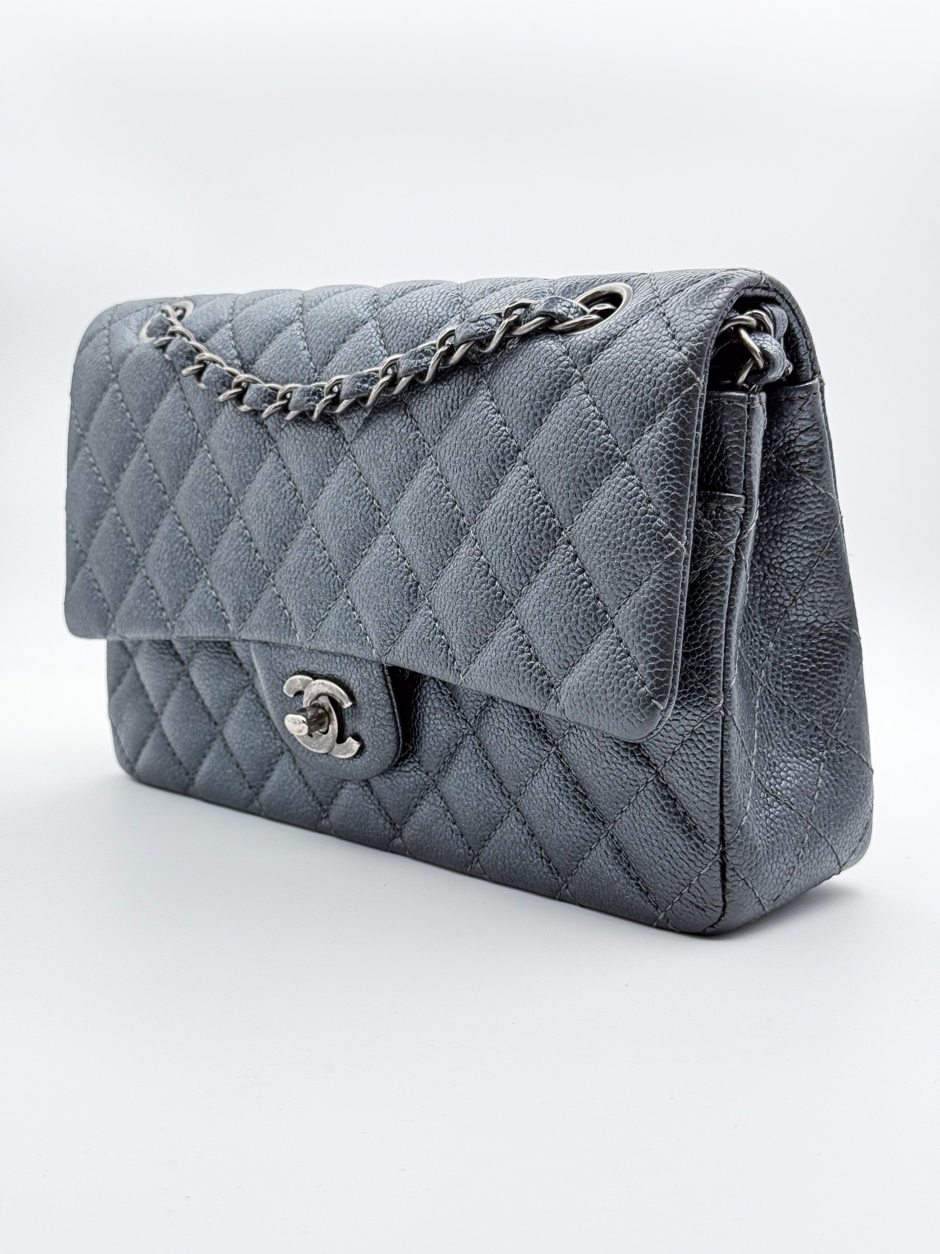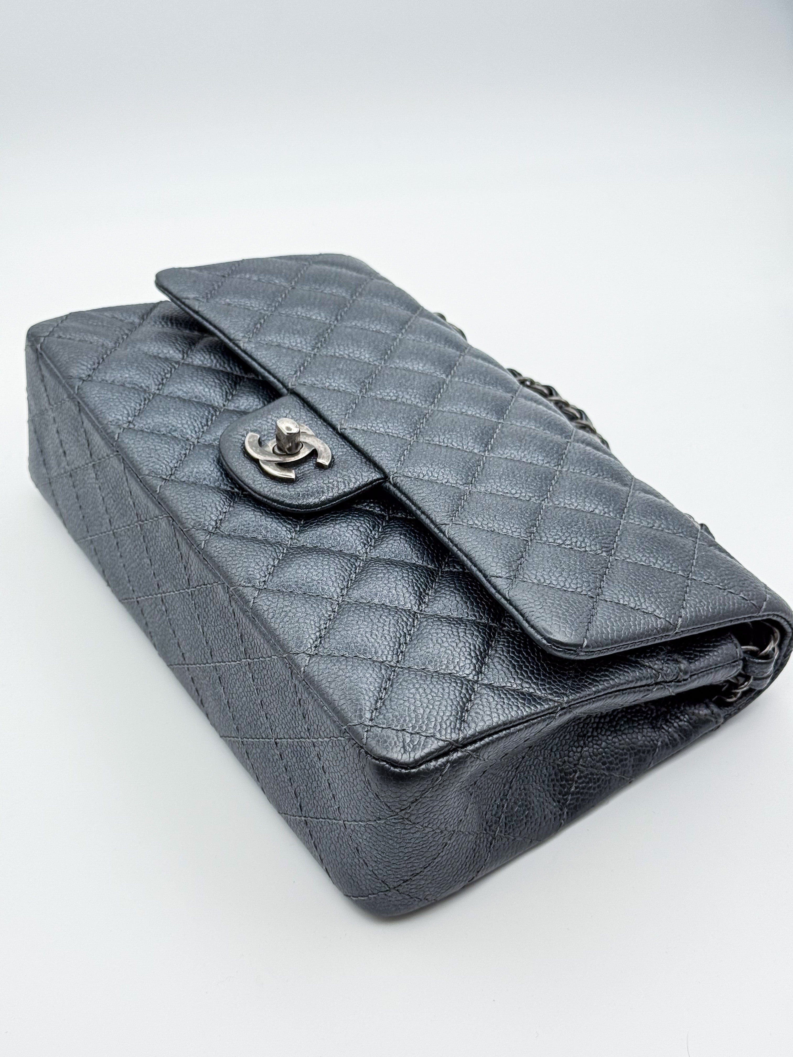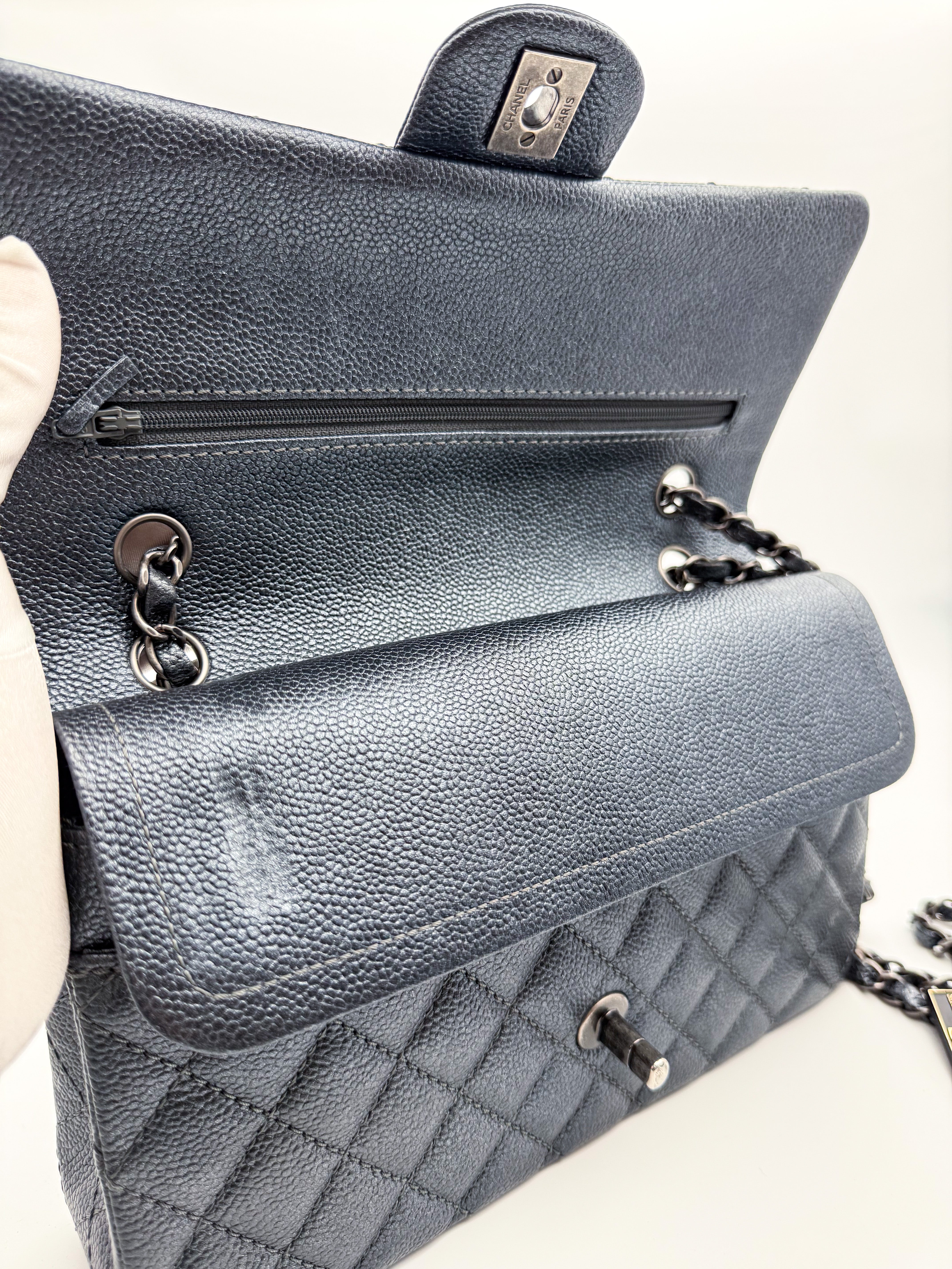 La Chanel 11.12 misura 25 cm ed è realizzata in pelle caviar grigia, un colore unico che esprime eleganza e versatilità. L'hardware in ruthenium valorizza ogni dettaglio con una finitura sofisticata e contemporanea, rendendo questa borsa un accessorio esclusivo per chi apprezza la qualità e lo stile senza tempo.