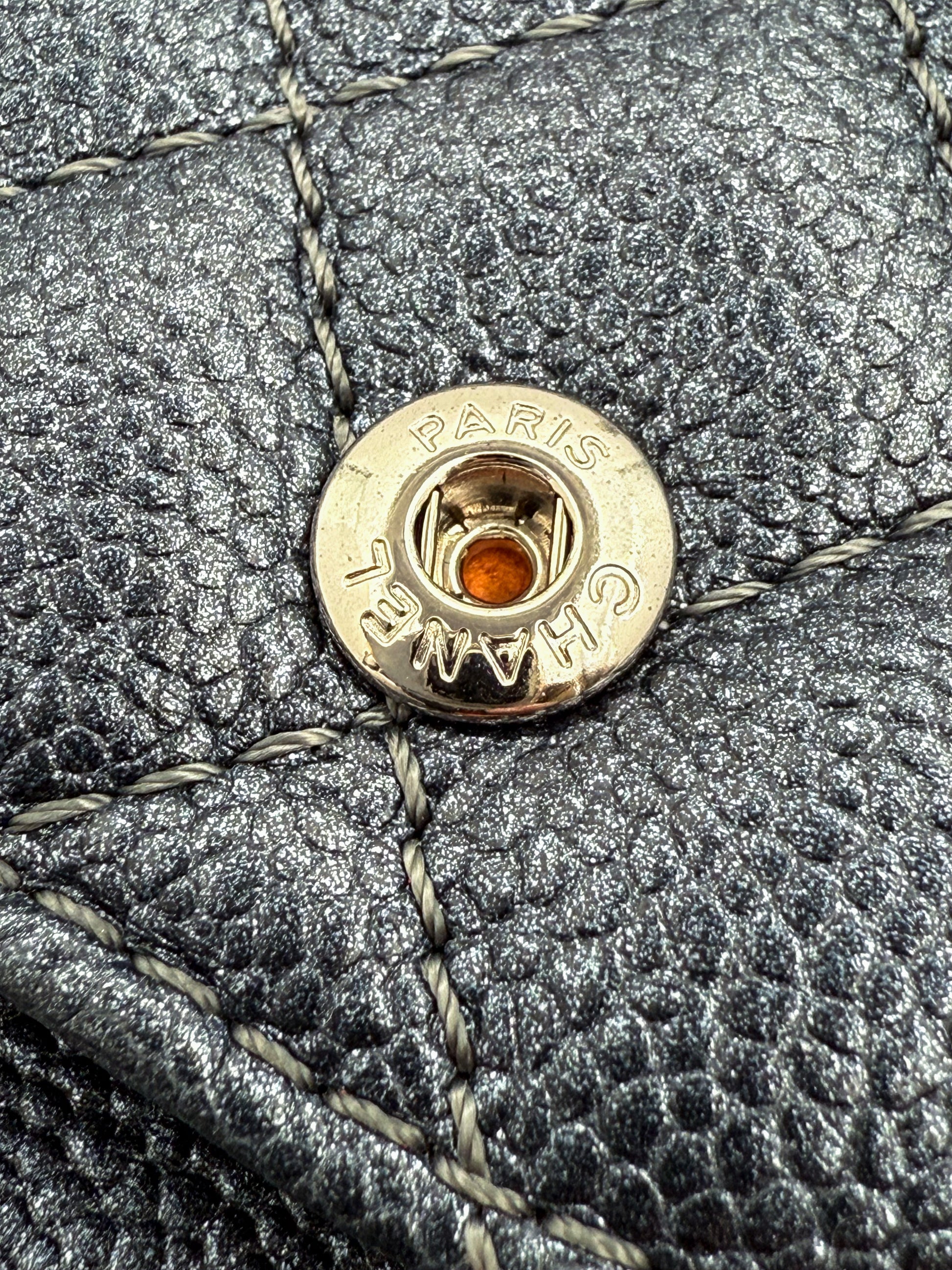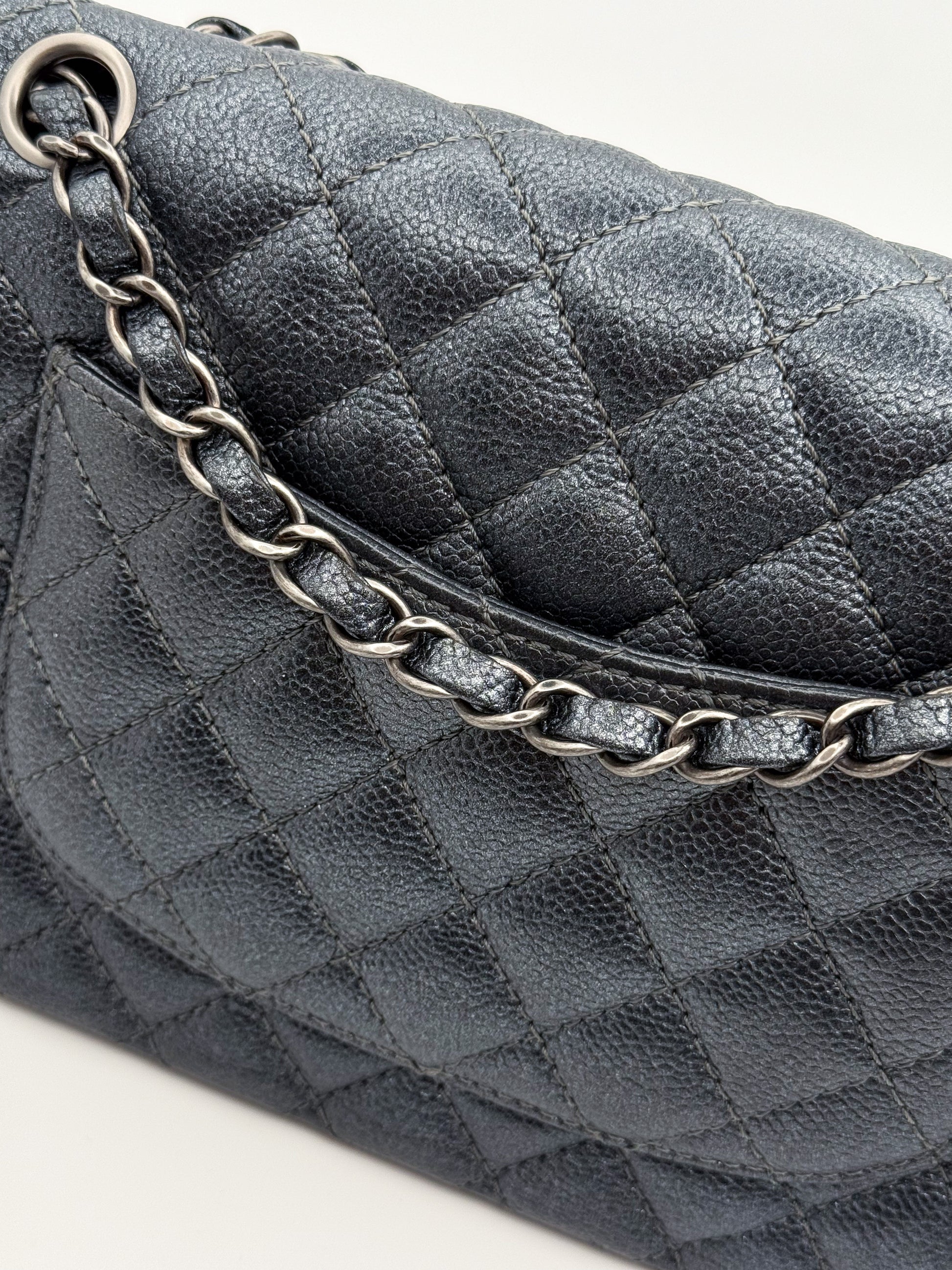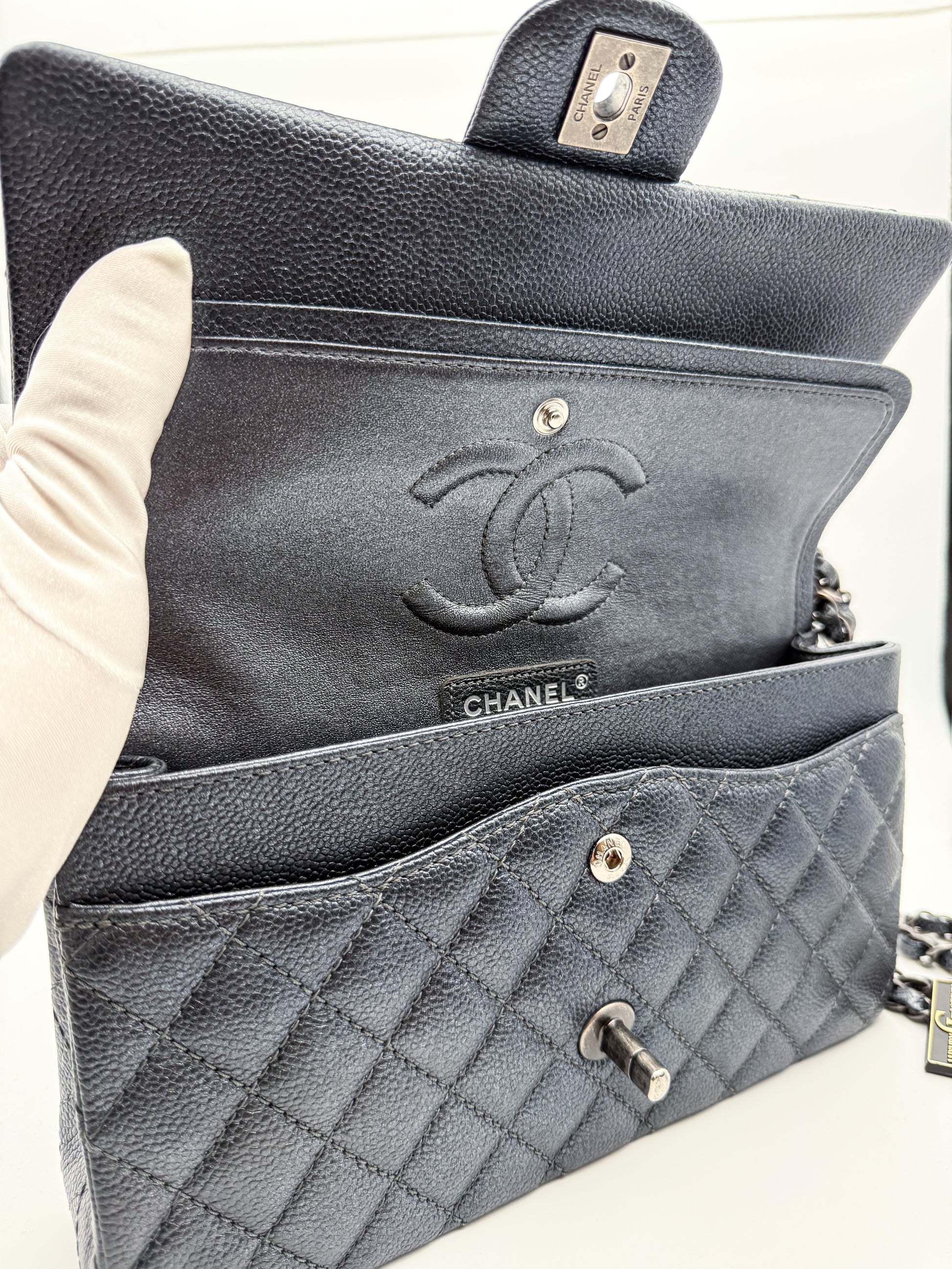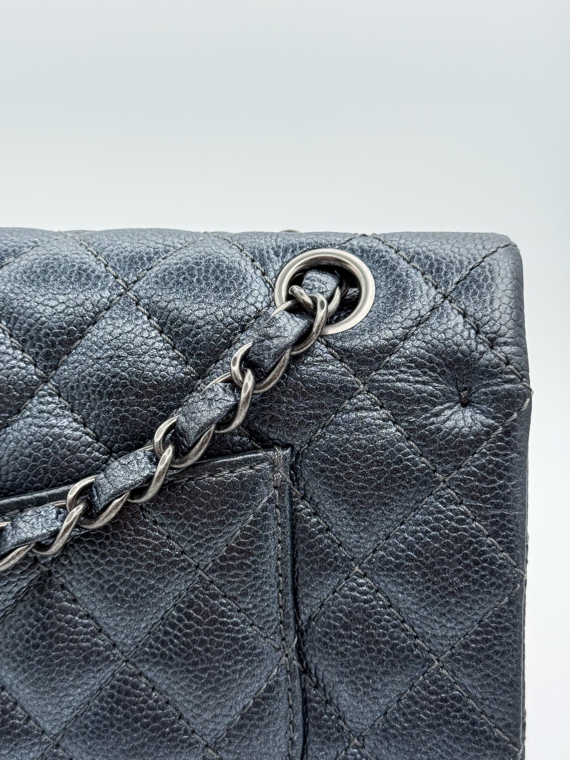 La Chanel 11.12 misura 25 cm ed è realizzata in pelle caviar grigia, un colore unico che esprime eleganza e versatilità. L'hardware in ruthenium valorizza ogni dettaglio con una finitura sofisticata e contemporanea, rendendo questa borsa un accessorio esclusivo per chi apprezza la qualità e lo stile senza tempo.