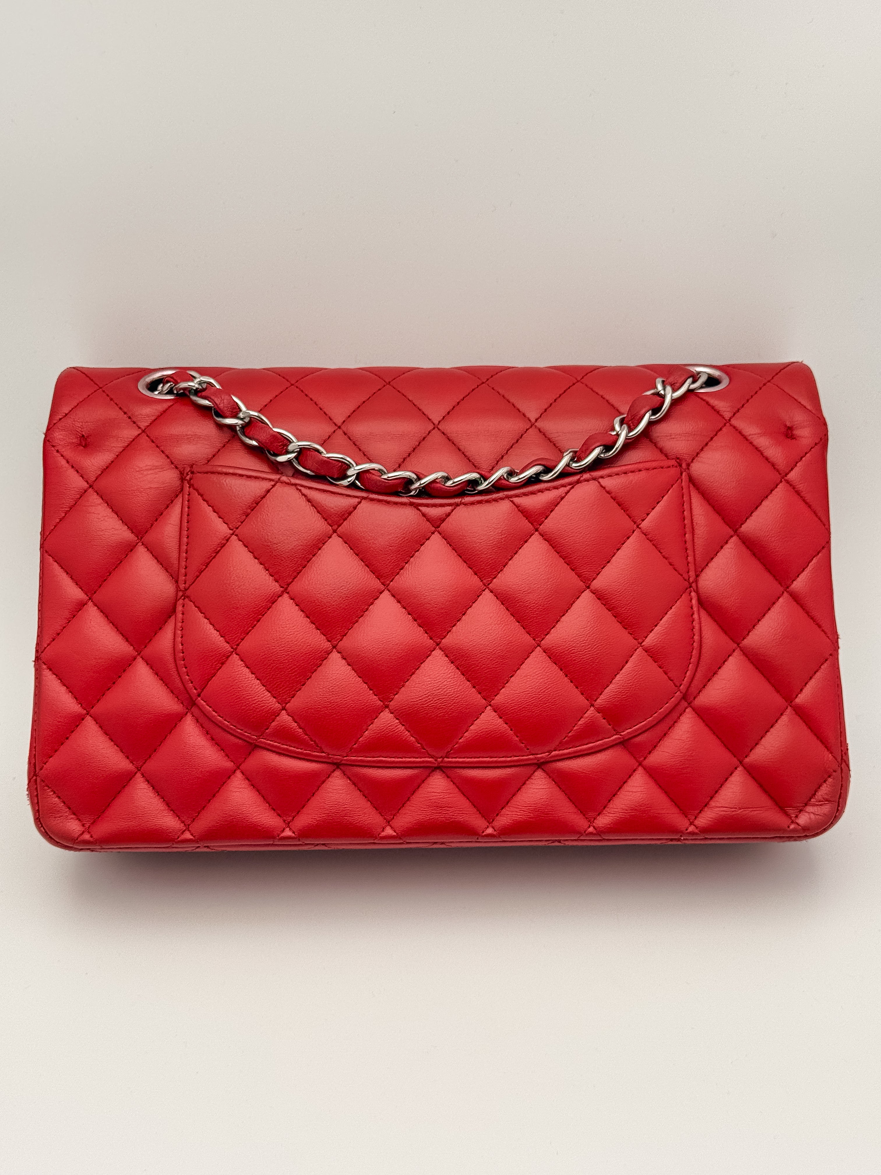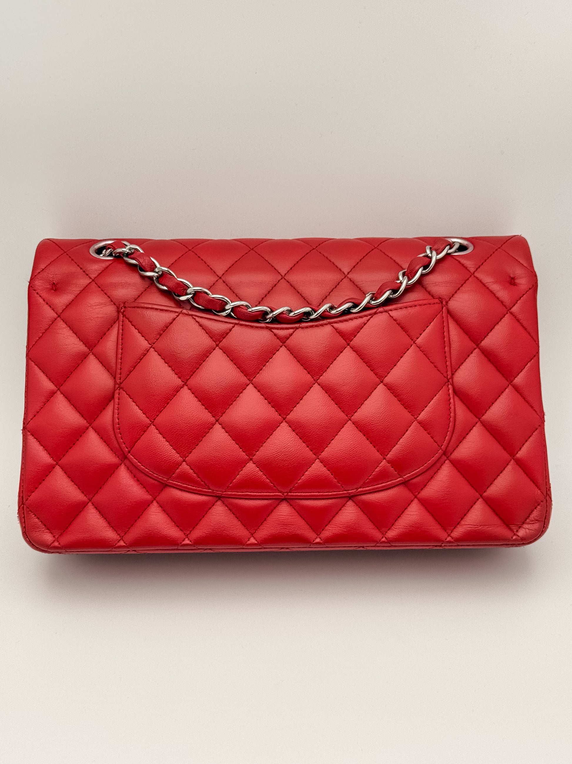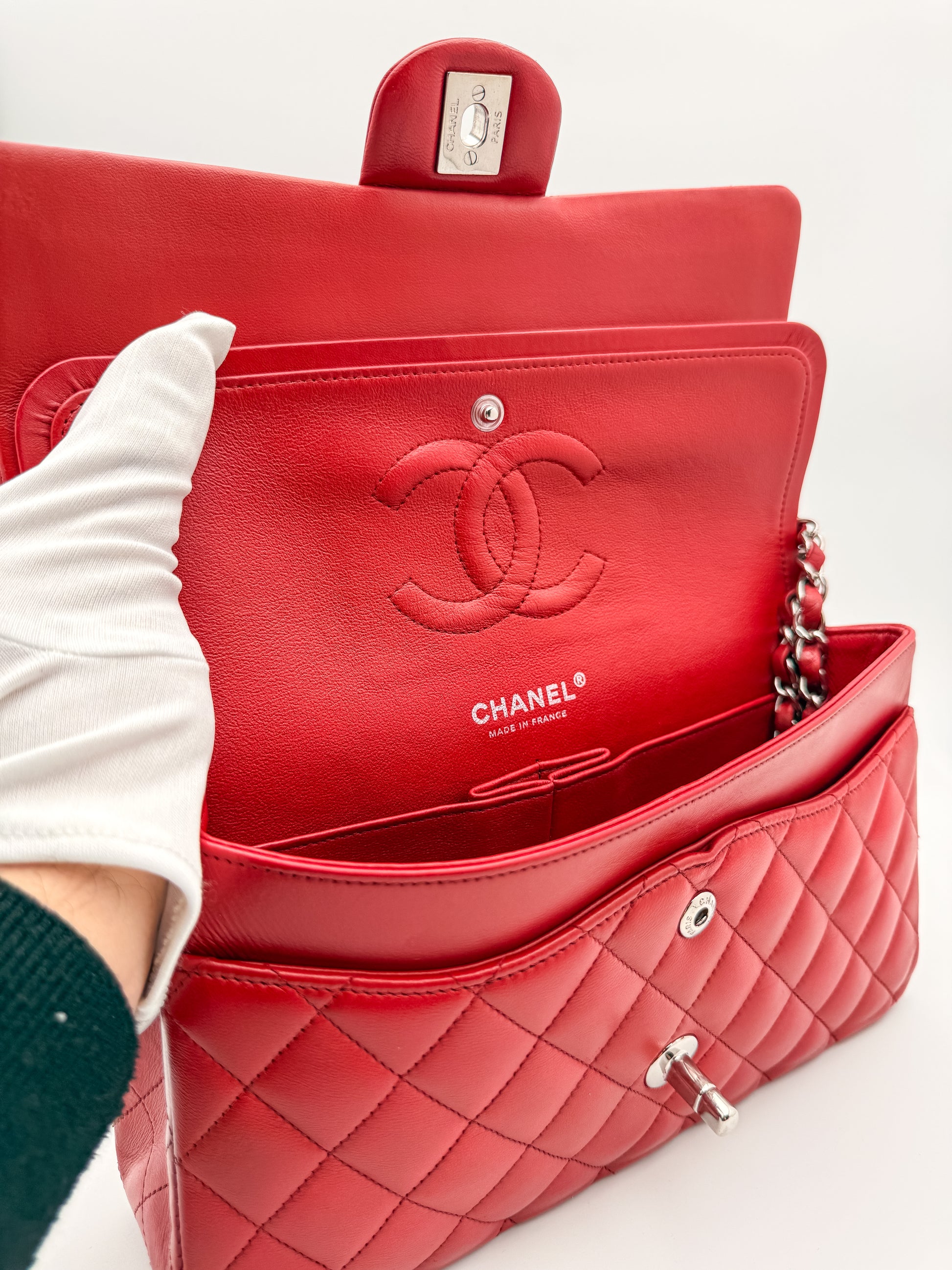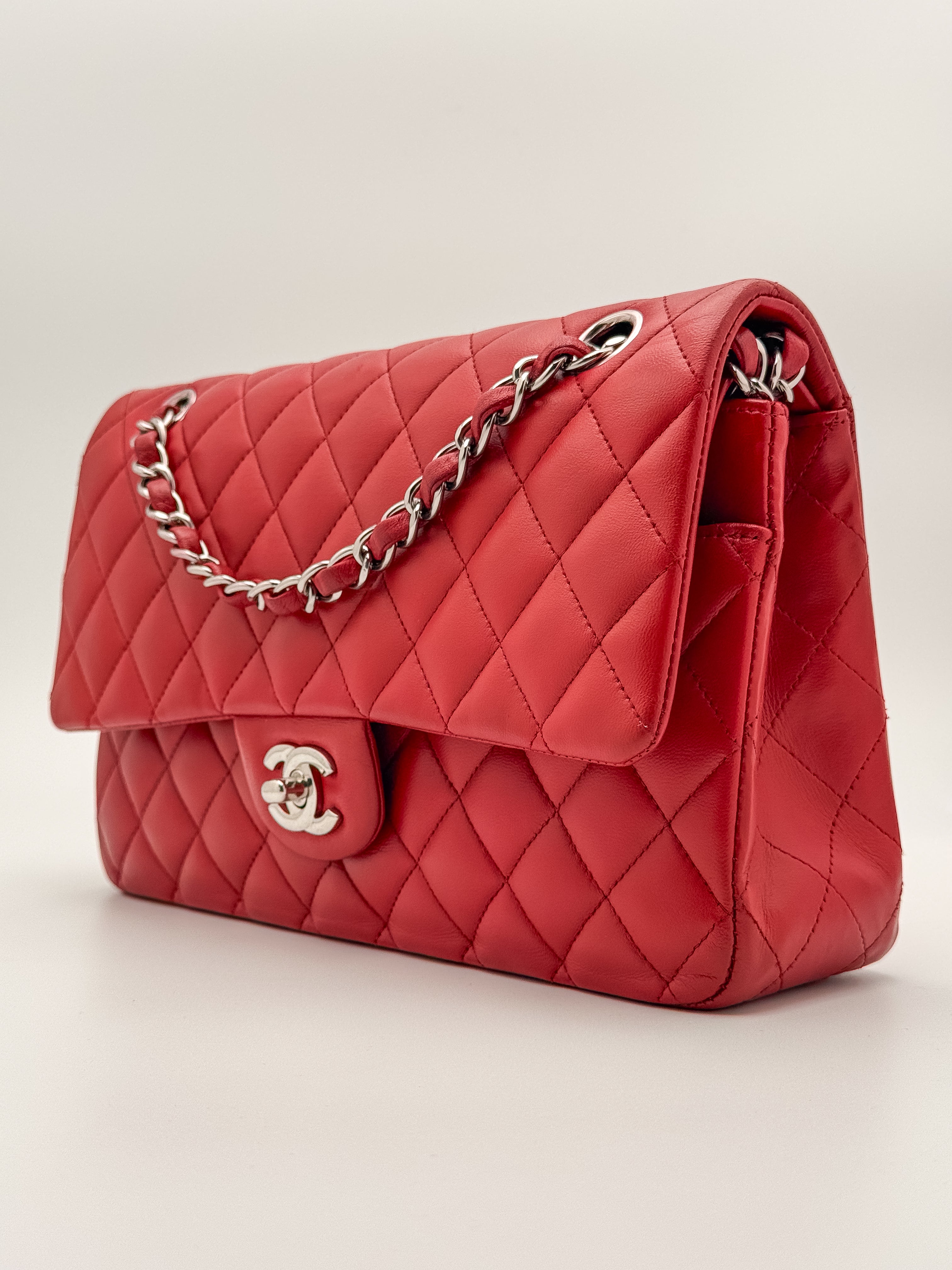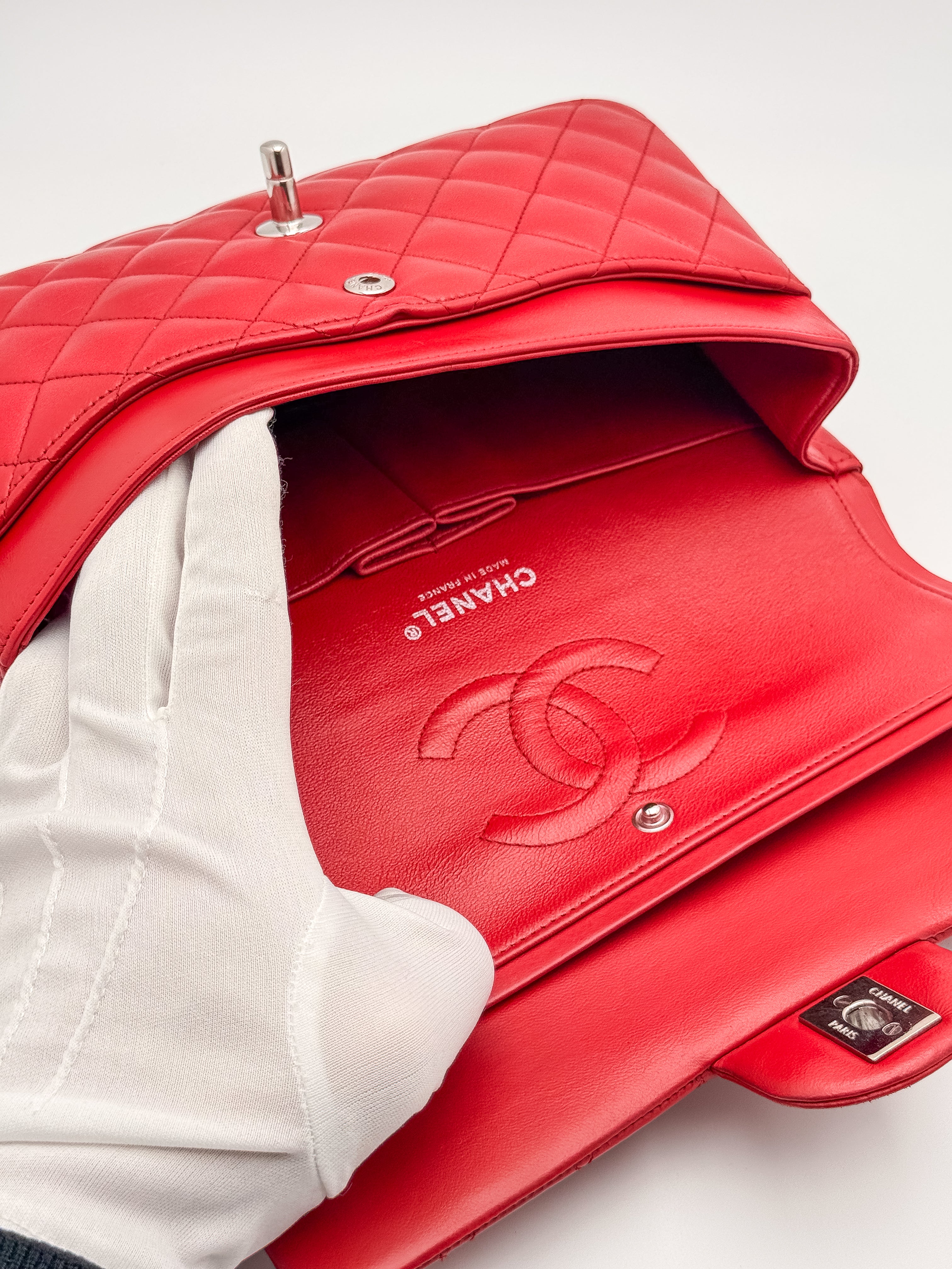 La Chanel Classic 11.12 25 rappresenta l'essenza della sartoria francese, un capolavoro intramontabile che incarna l'eleganza sofisticata della maison. Realizzata in pregiato lambskin rosso, la borsa offre una texture morbida e raffinata che cattura la luce con naturale luminosità. Gli hardware in color argento completano il design con un tocco di modernità discreta, esaltando le proporzioni armoniose della silhouette. Le dimensioni compatte 25 la rendono ideale per occasioni formali e serate esclusive, garantendo praticità senza compromessi stilistici. Un investimento nel lusso autentico, simbolo di gusto impeccabile e consapevolezza sartoriale.