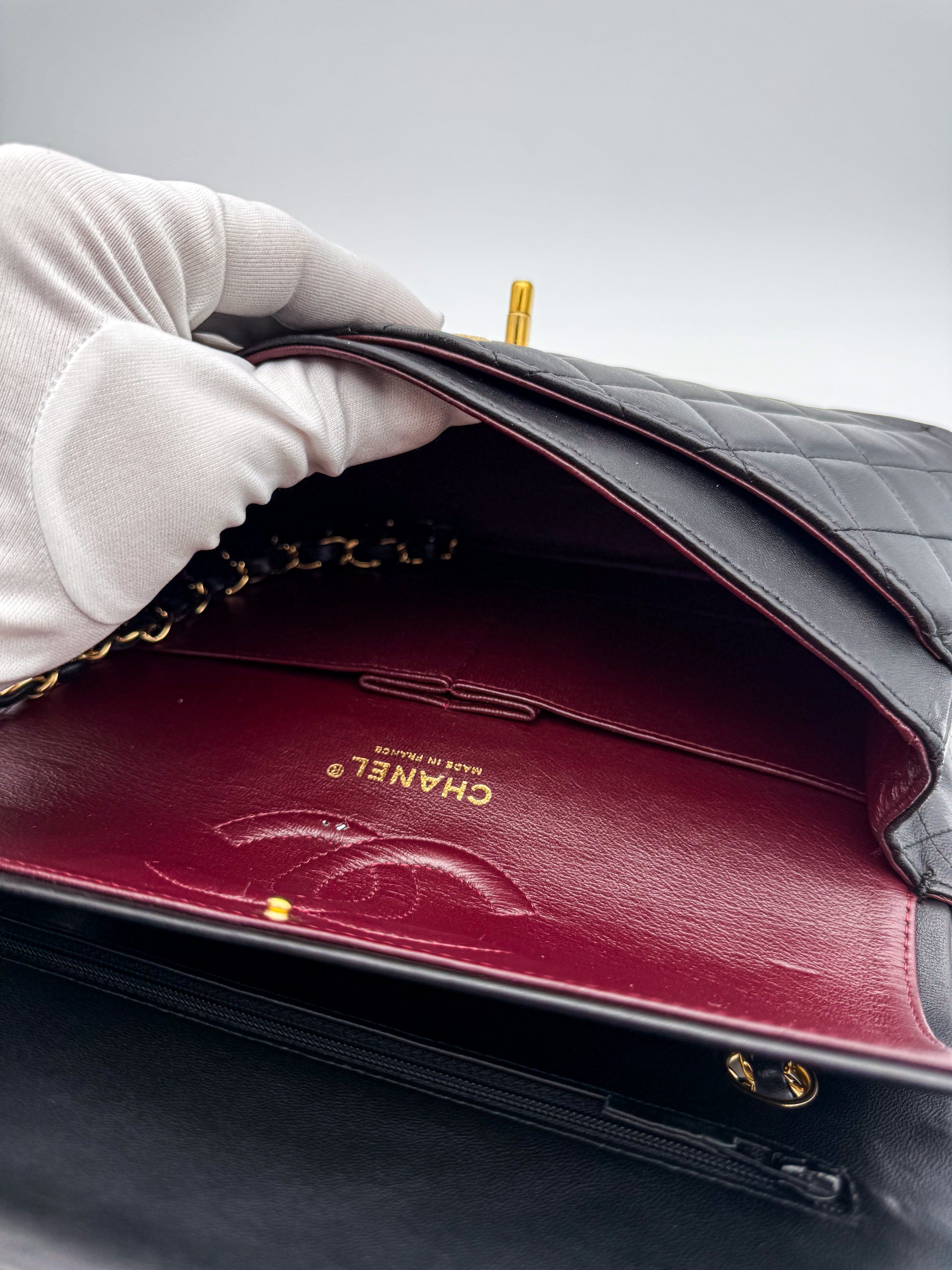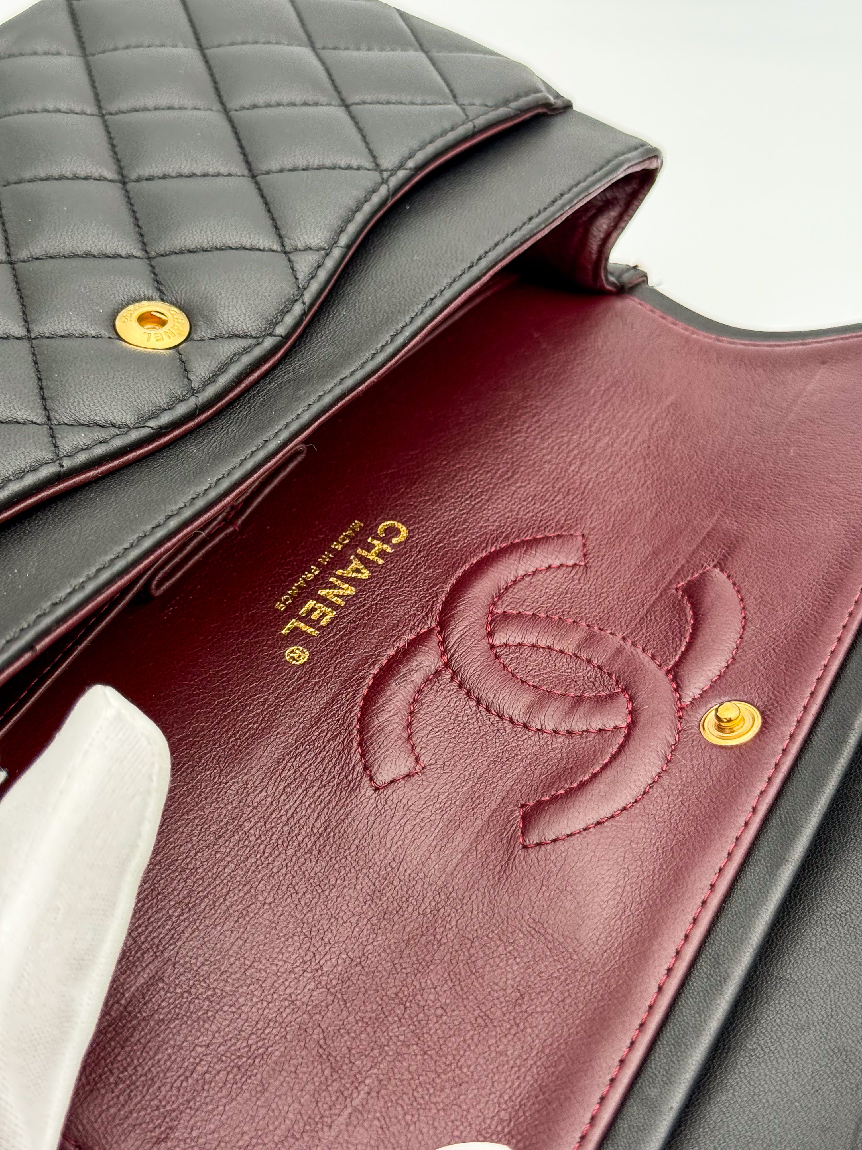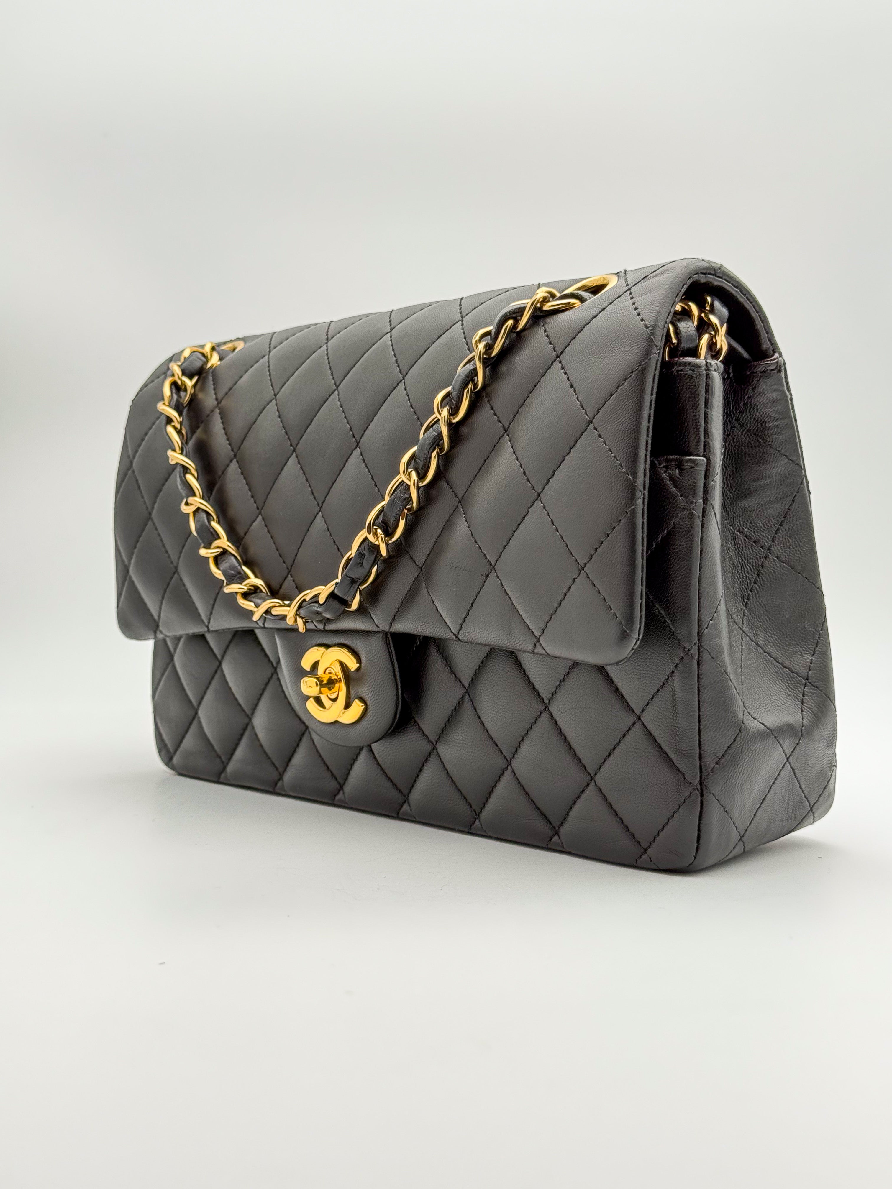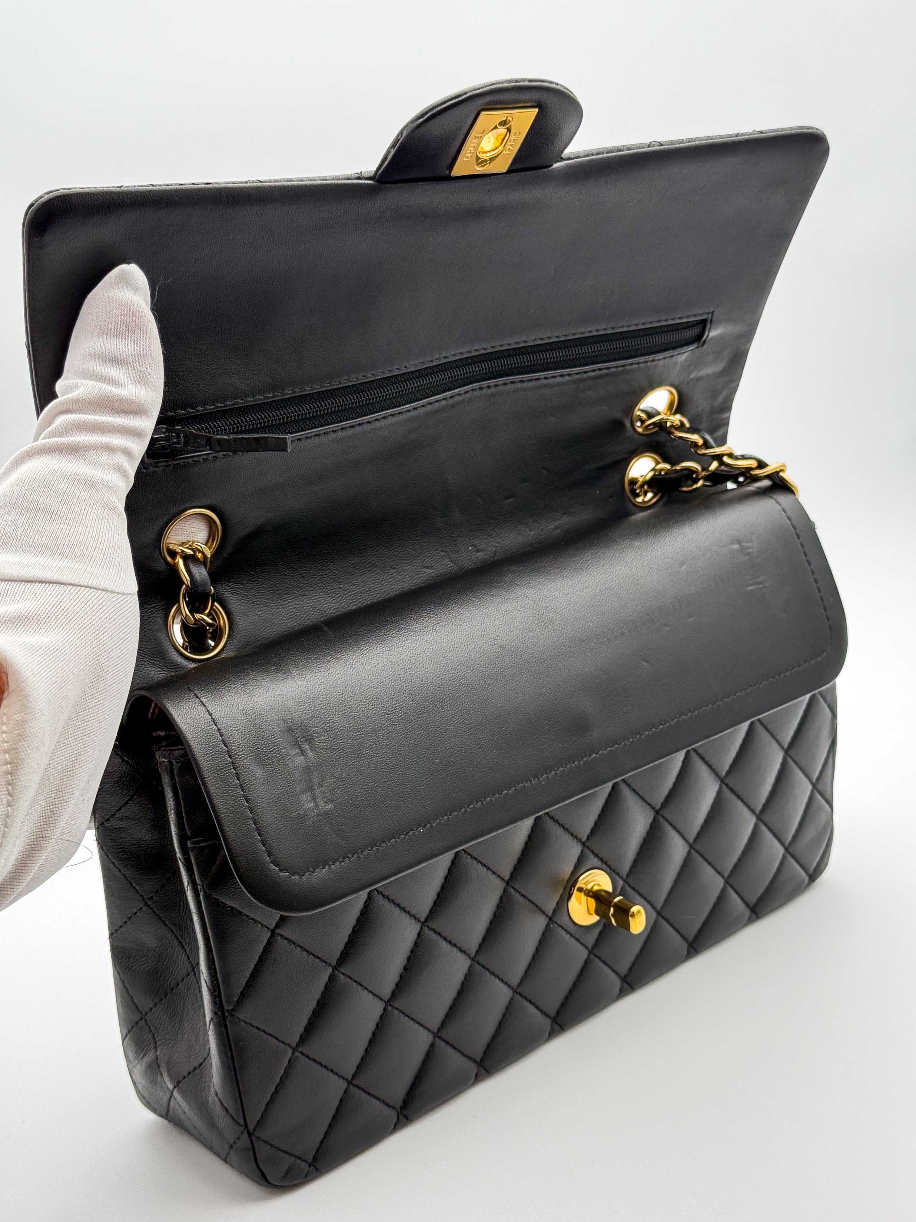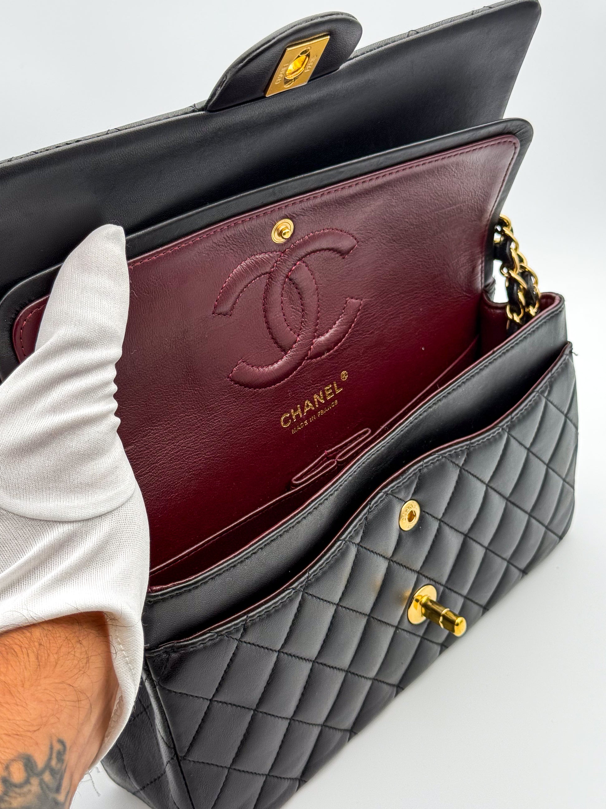 La borsa Chanel Classic 11.12 in formato 25cm rappresenta l'essenza della sartoria francese. Realizzata in pregiato lambskin nero, offre una morbidezza incomparabile e una patina che si affina nel tempo. La catena in metallo effetto dorato conferisce un tocco di eleganza senza tempo, mentre il sistema di chiusura CC garantisce sicurezza e stile. Perfetta per occasioni formali e uso quotidiano, questa icona di lusso combina funzionalità e raffinatezza in un'unica silhouette intramontabile.