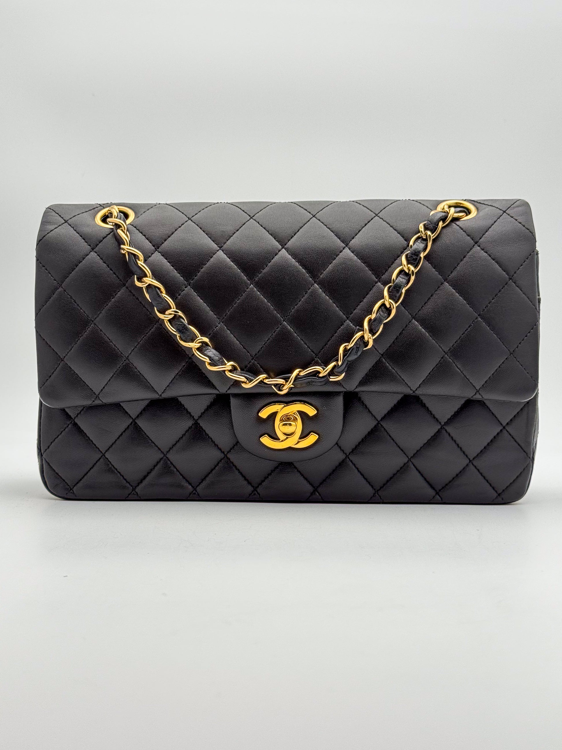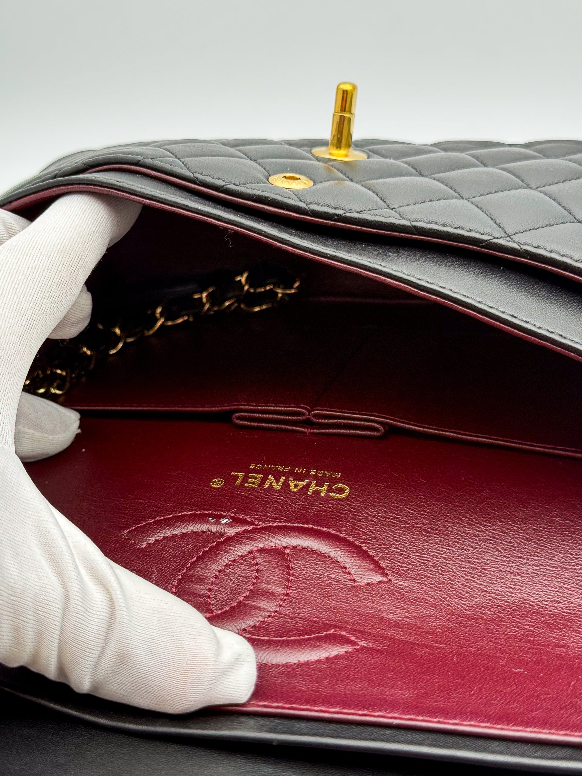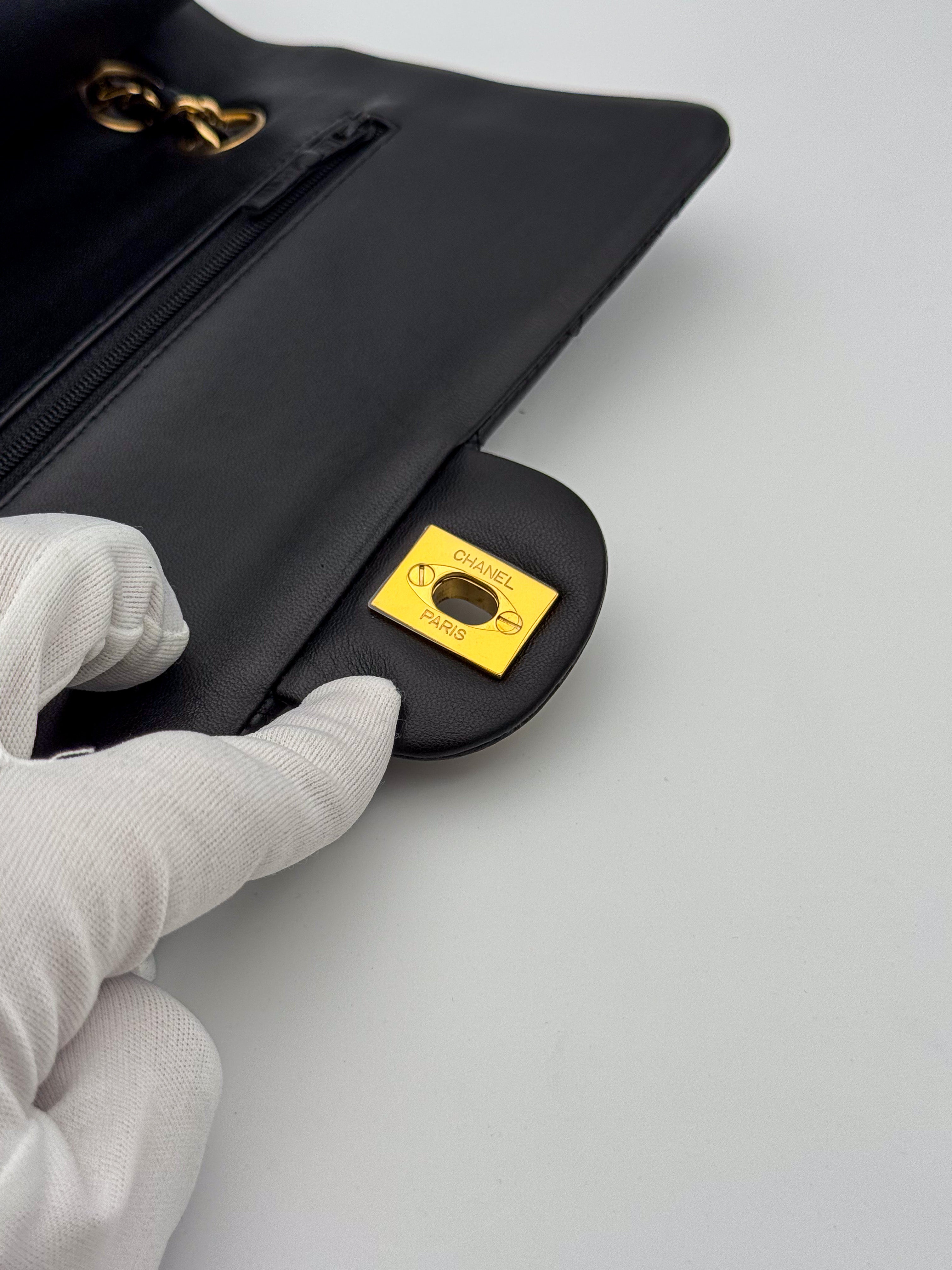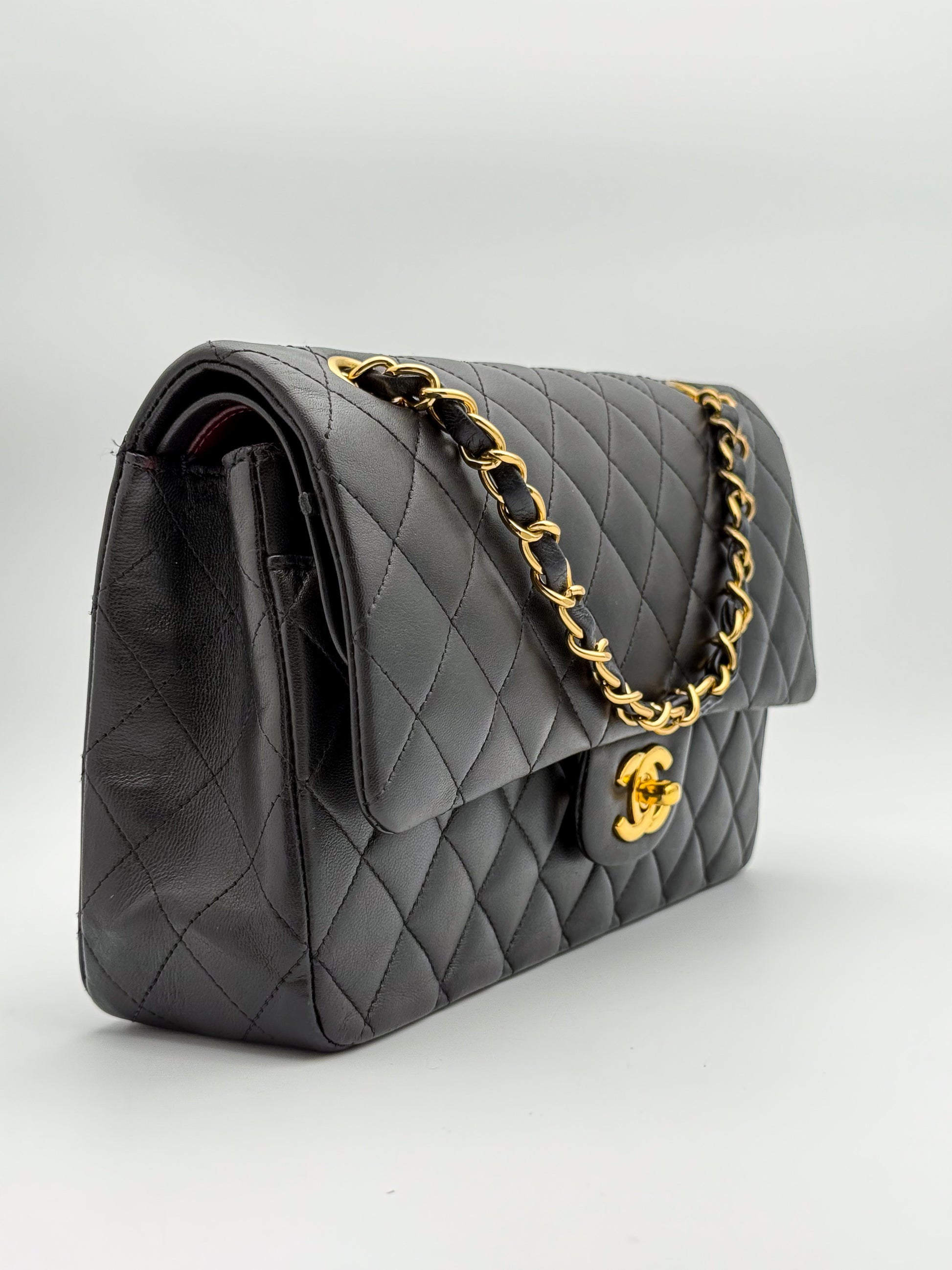 La borsa Chanel Classic 11.12 in formato 25cm rappresenta l'essenza della sartoria francese. Realizzata in pregiato lambskin nero, offre una morbidezza incomparabile e una patina che si affina nel tempo. La catena in metallo effetto dorato conferisce un tocco di eleganza senza tempo, mentre il sistema di chiusura CC garantisce sicurezza e stile. Perfetta per occasioni formali e uso quotidiano, questa icona di lusso combina funzionalità e raffinatezza in un'unica silhouette intramontabile.
