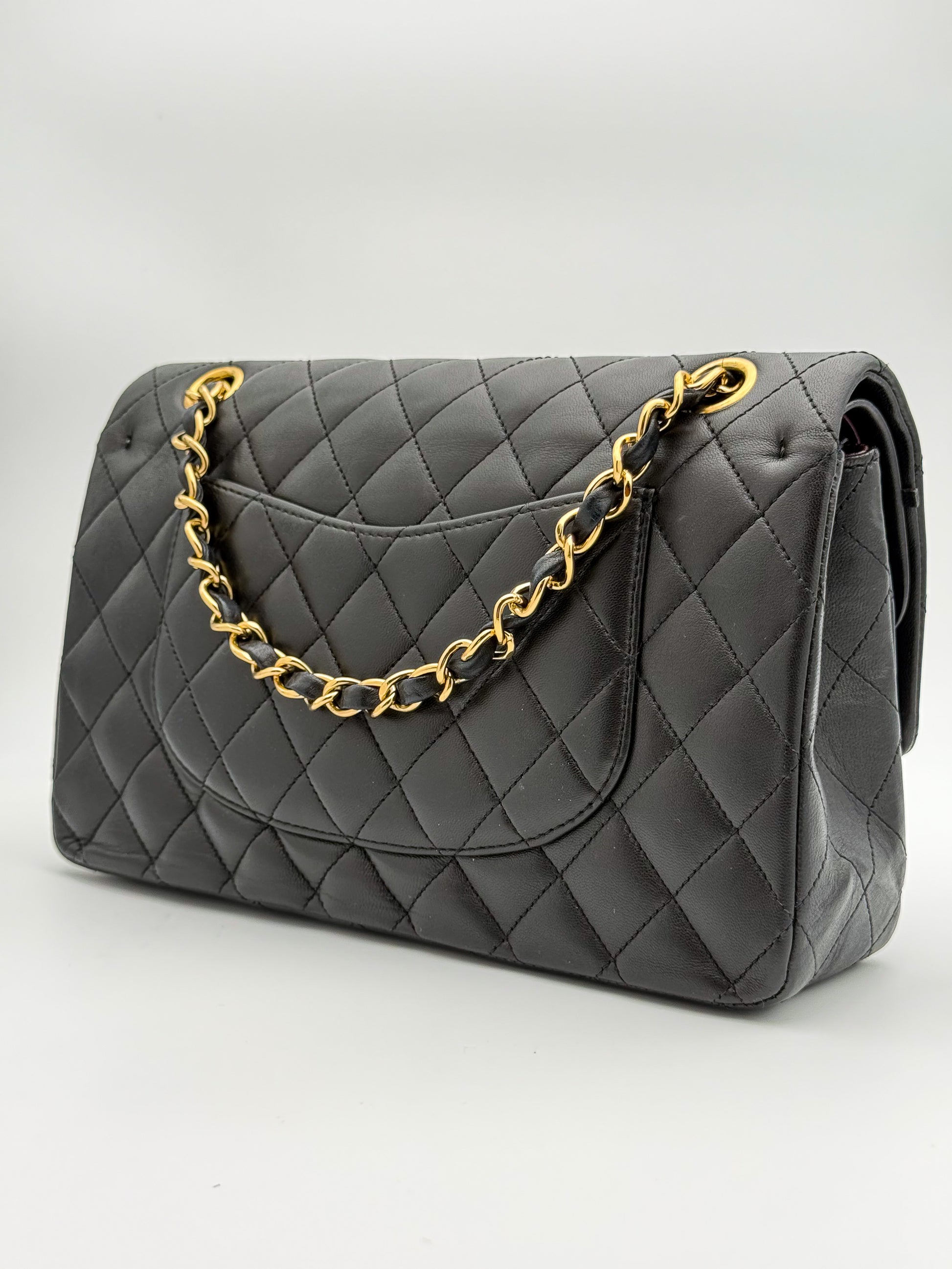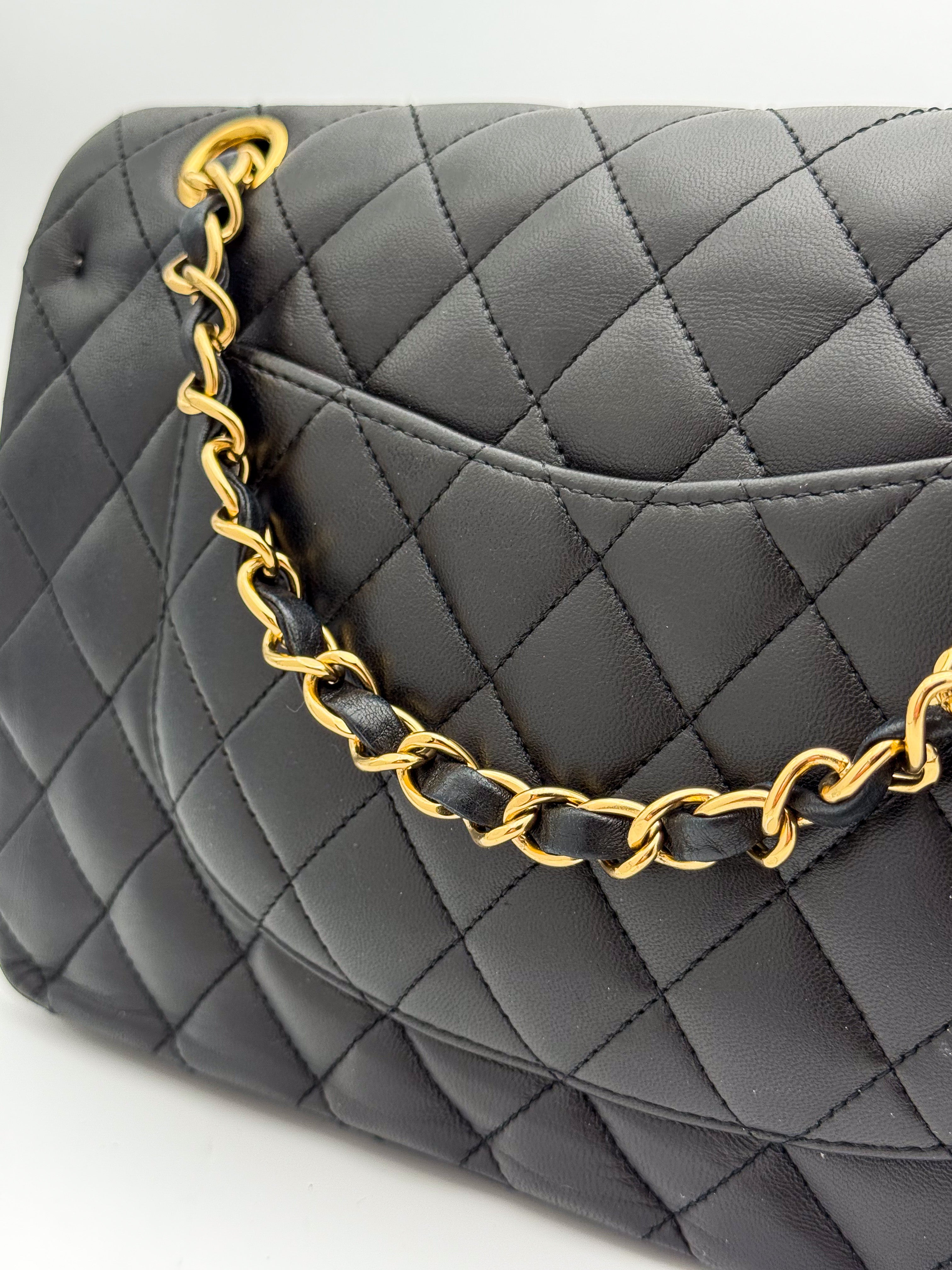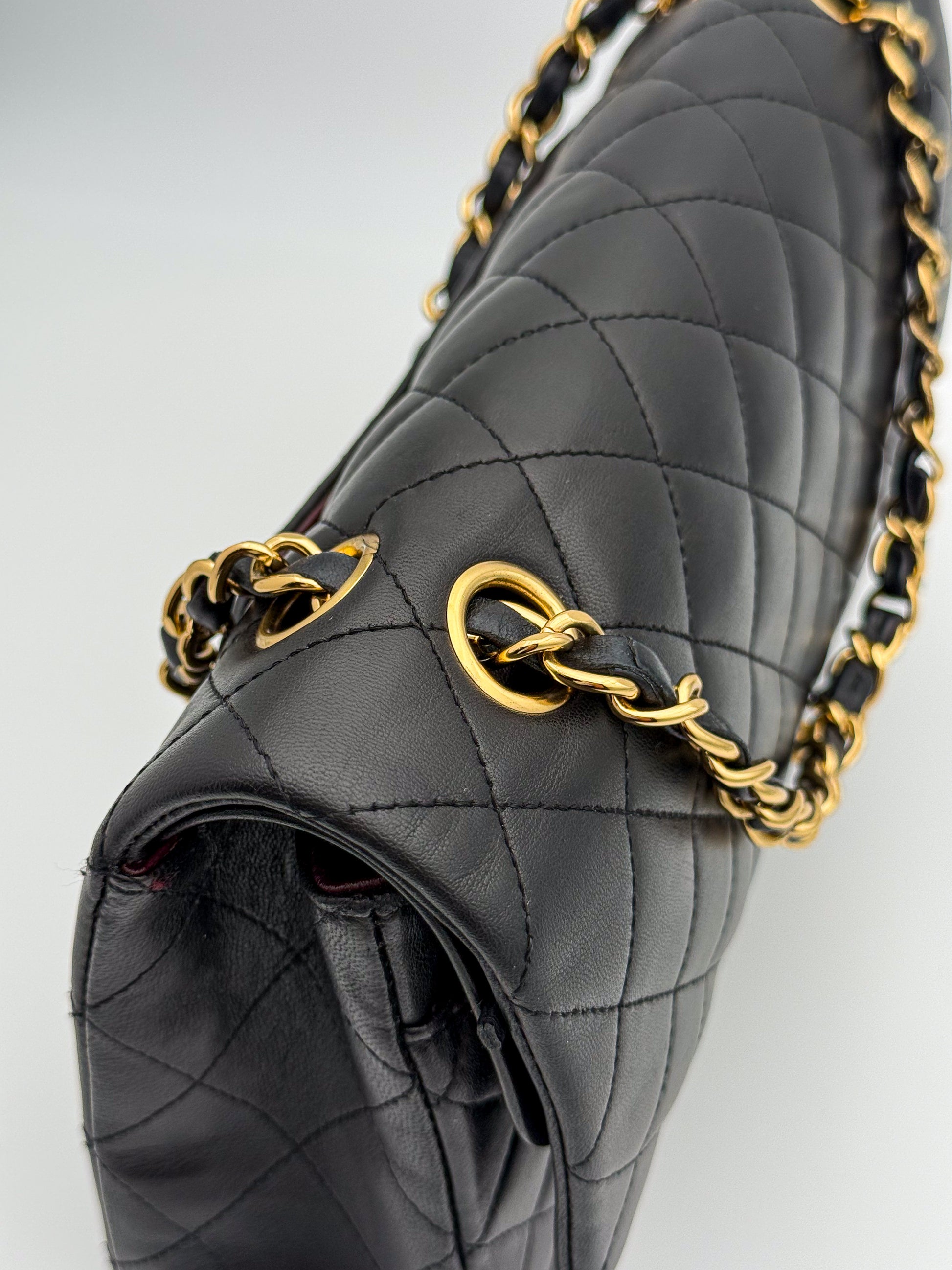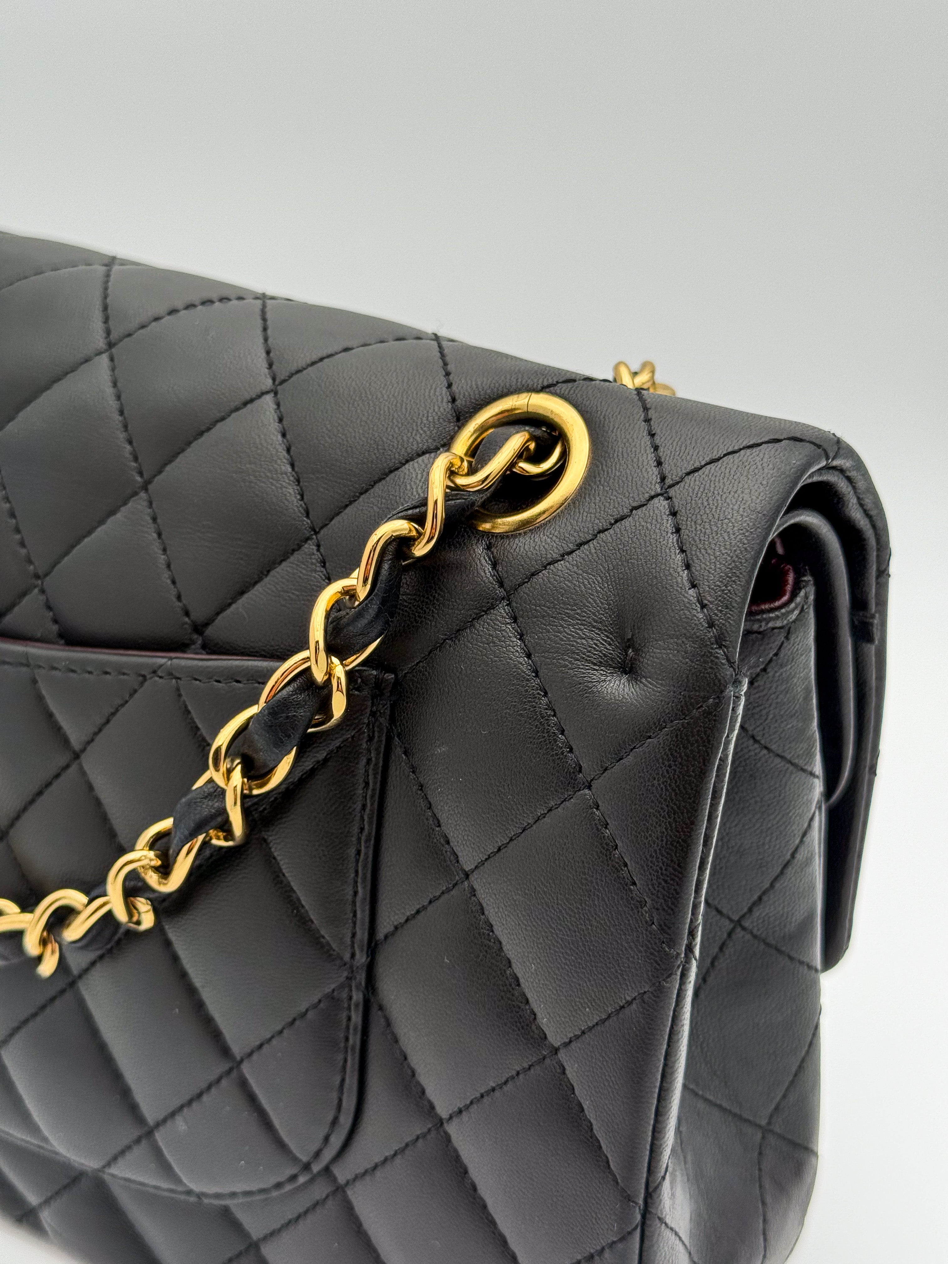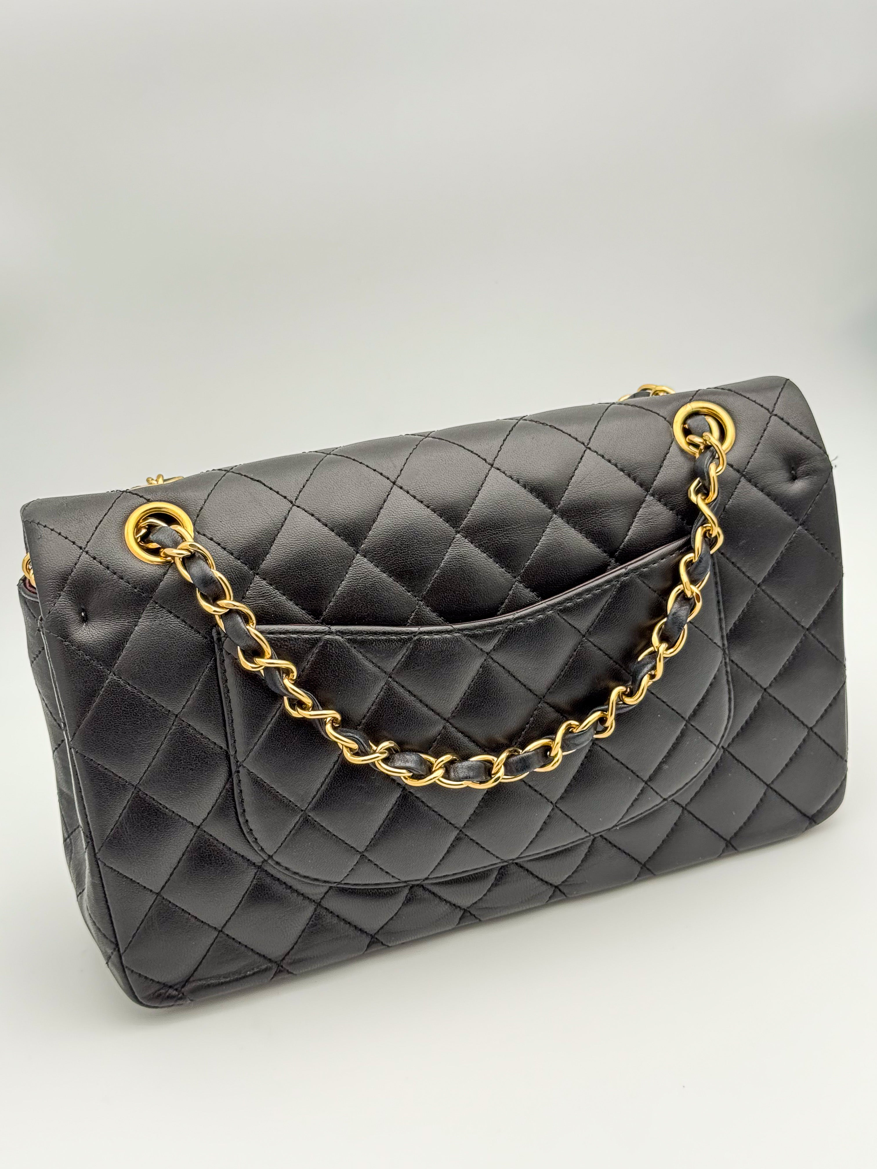La borsa Chanel Classic 11.12 in formato 25cm rappresenta l'essenza della sartoria francese. Realizzata in pregiato lambskin nero, offre una morbidezza incomparabile e una patina che si affina nel tempo. La catena in metallo effetto dorato conferisce un tocco di eleganza senza tempo, mentre il sistema di chiusura CC garantisce sicurezza e stile. Perfetta per occasioni formali e uso quotidiano, questa icona di lusso combina funzionalità e raffinatezza in un'unica silhouette intramontabile.
