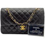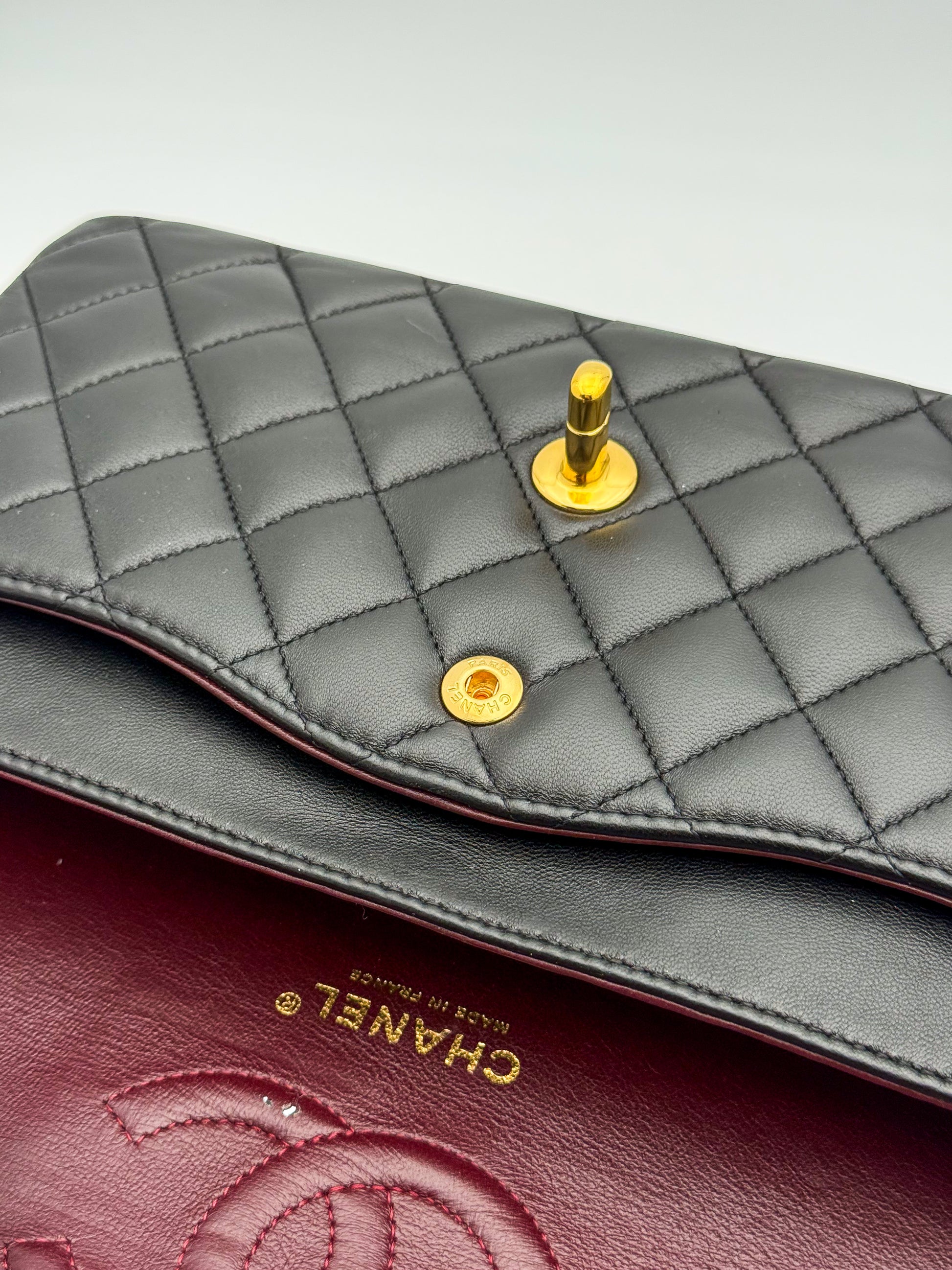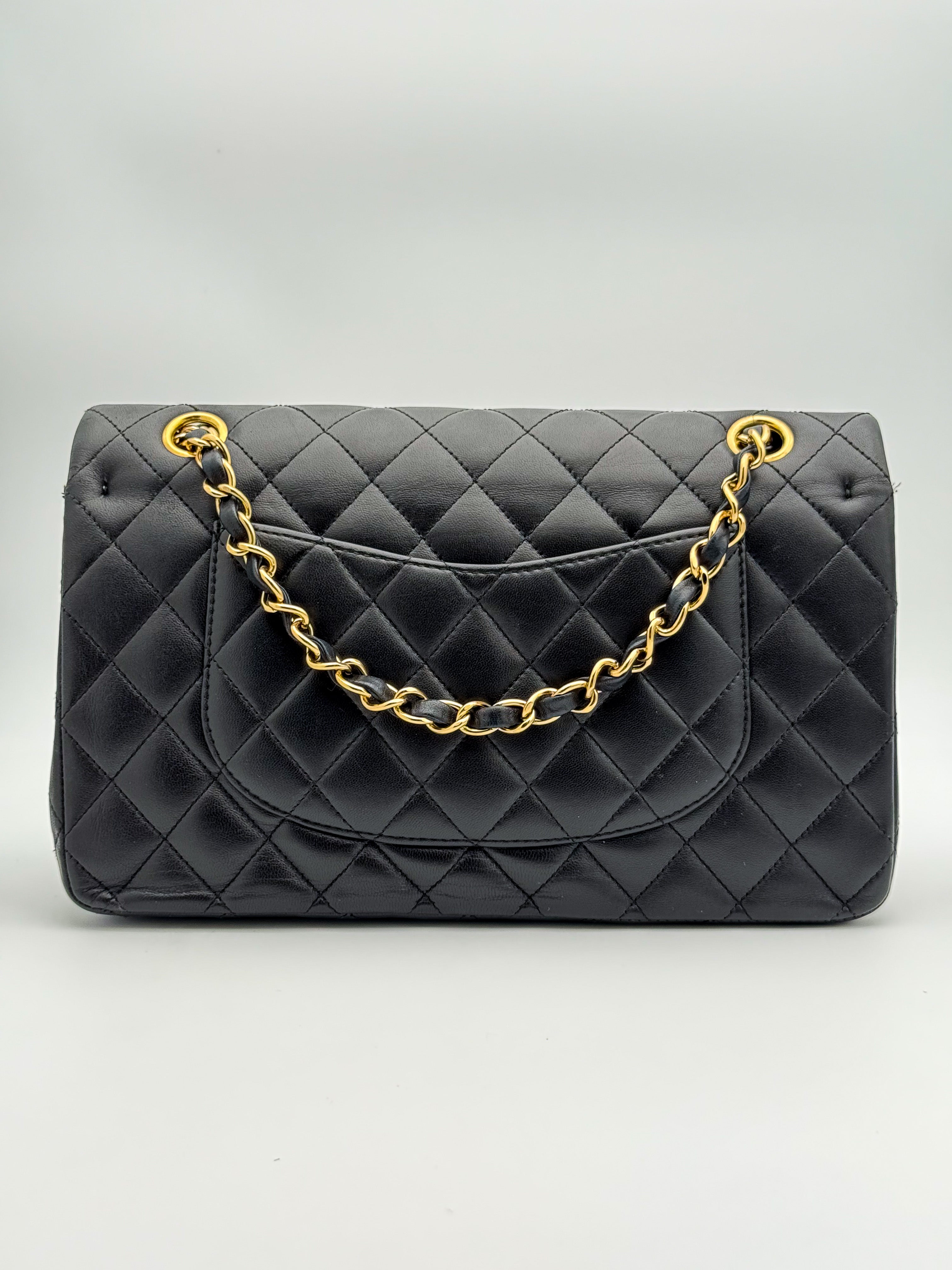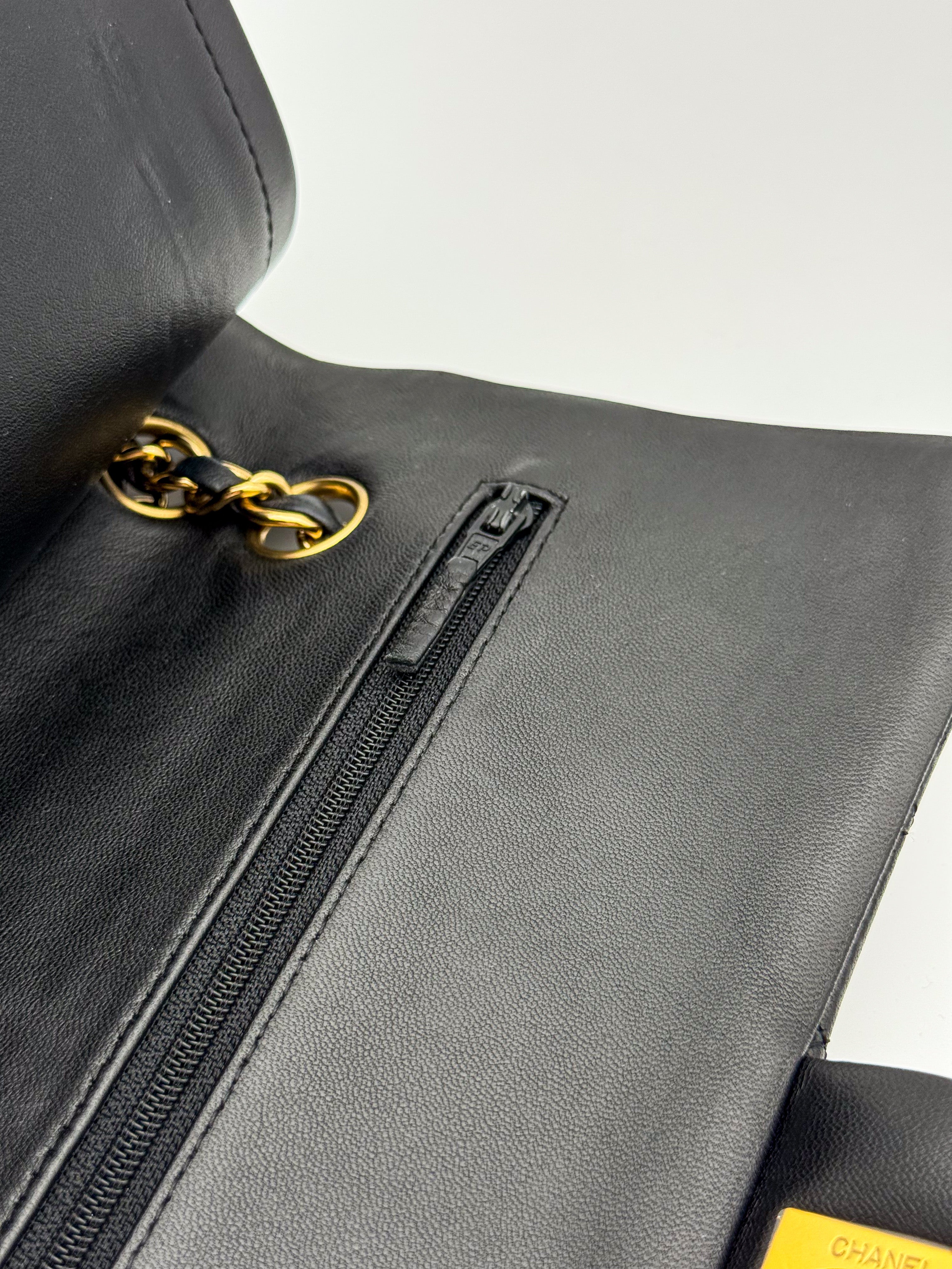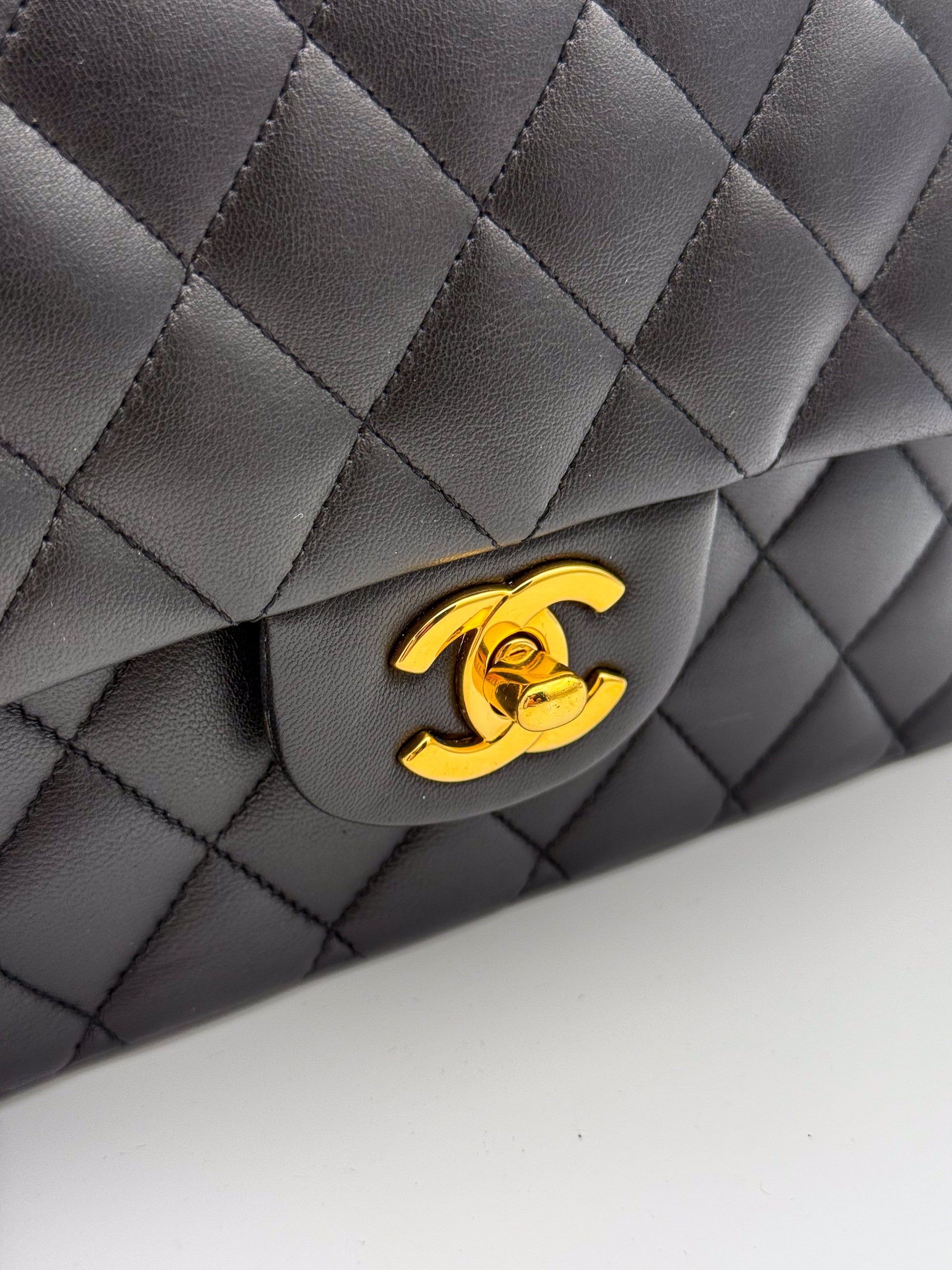 La borsa Chanel Classic 11.12 in formato 25cm rappresenta l'essenza della sartoria francese. Realizzata in pregiato lambskin nero, offre una morbidezza incomparabile e una patina che si affina nel tempo. La catena in metallo effetto dorato conferisce un tocco di eleganza senza tempo, mentre il sistema di chiusura CC garantisce sicurezza e stile. Perfetta per occasioni formali e uso quotidiano, questa icona di lusso combina funzionalità e raffinatezza in un'unica silhouette intramontabile.