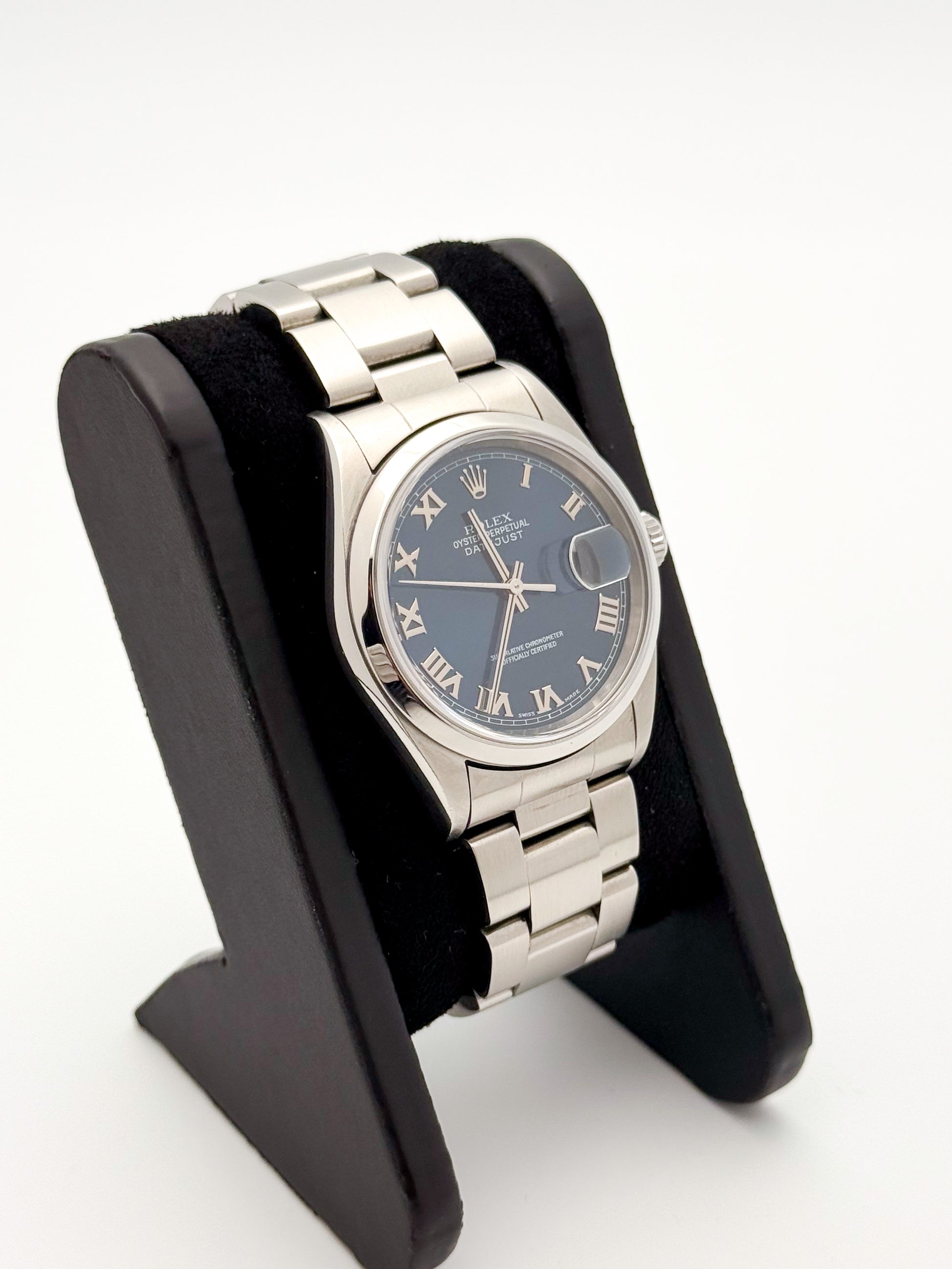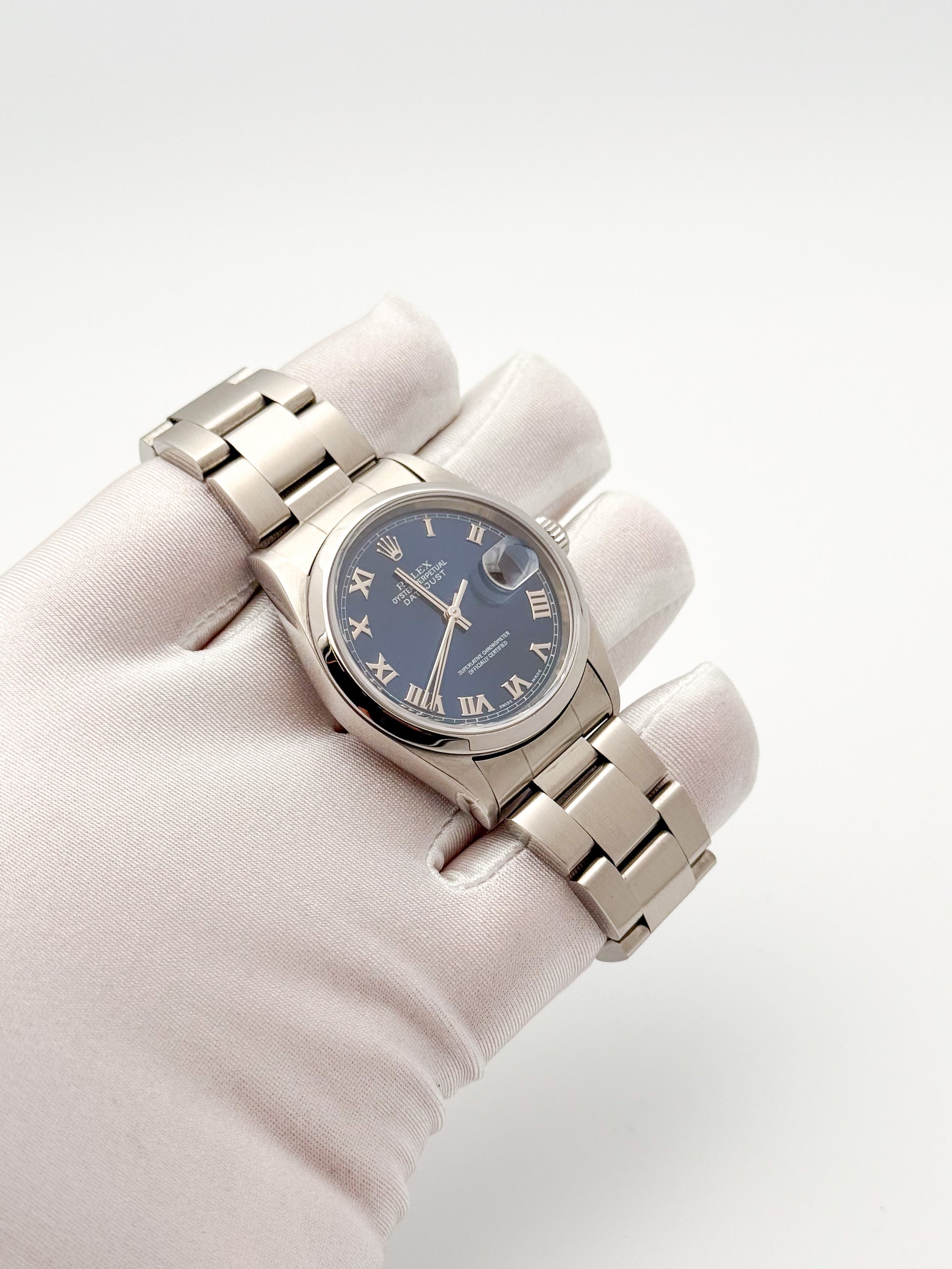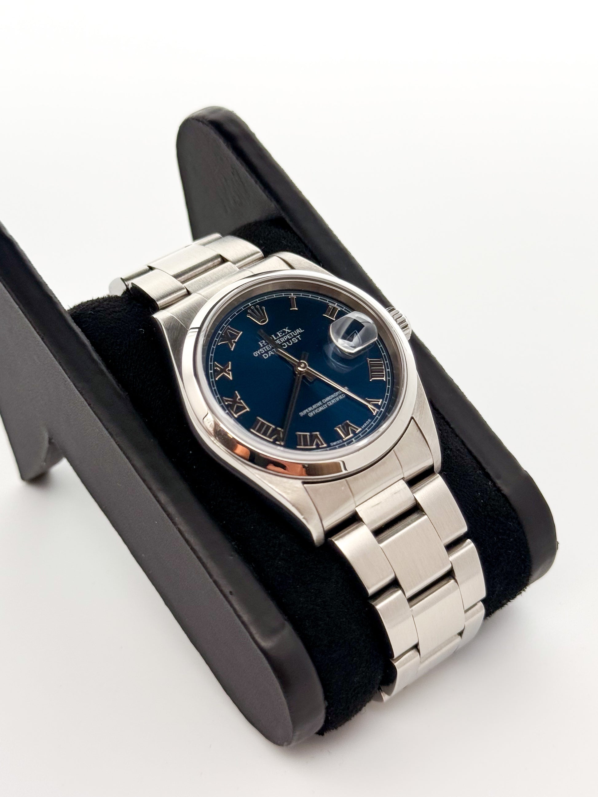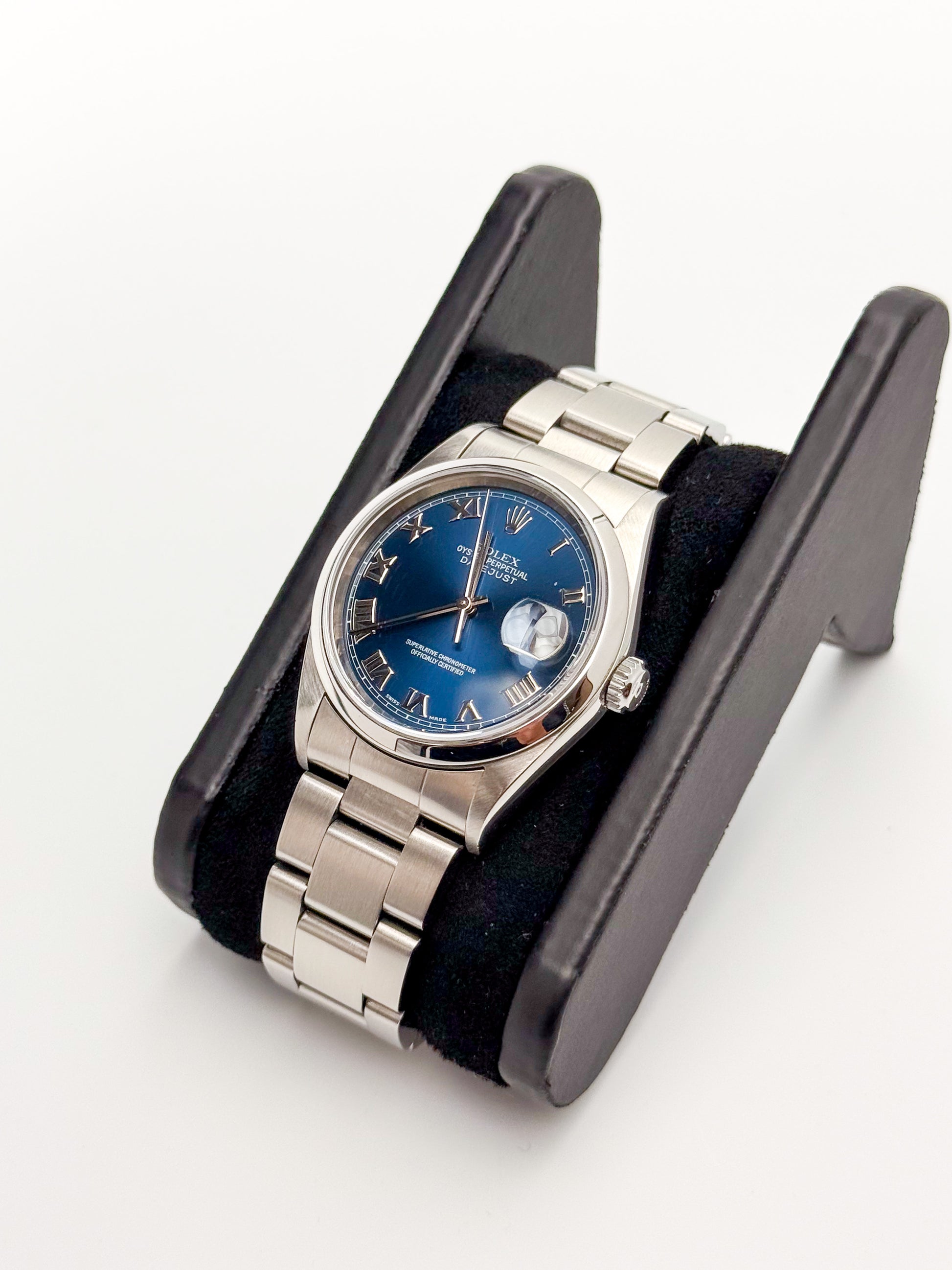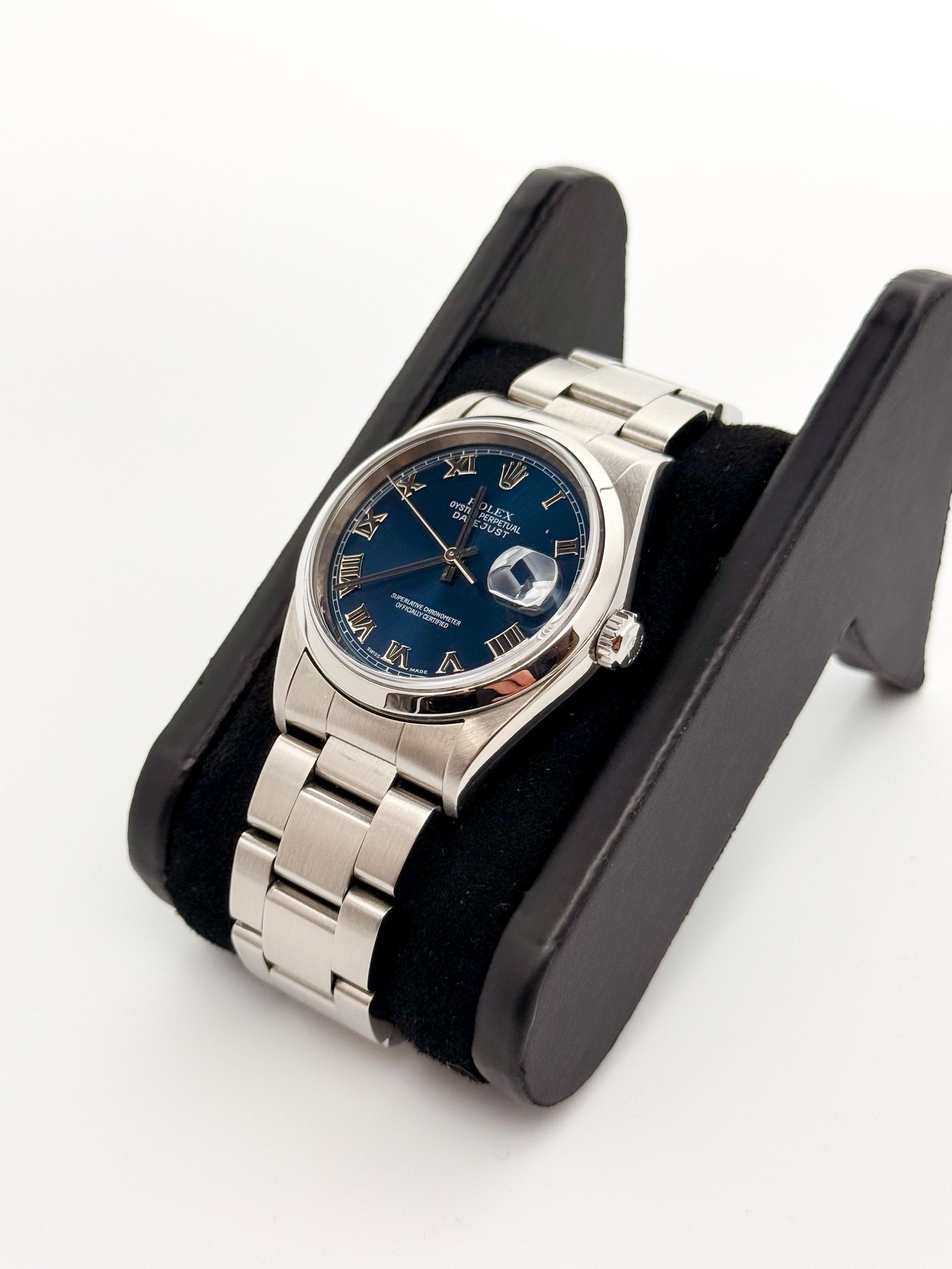 Il Datejust 16200 presenta una cassa da 36 mm perfettamente proporzionata, abbinata a un elegante quadrante blu con numeri romani che conferisce un tocco classico e raffinato. Il bracciale Oyster garantisce robustezza e comfort, rendendo questo orologio ideale per un uso quotidiano senza rinunciare allo stile distintivo. Un capolavoro di precisione e design senza tempo.