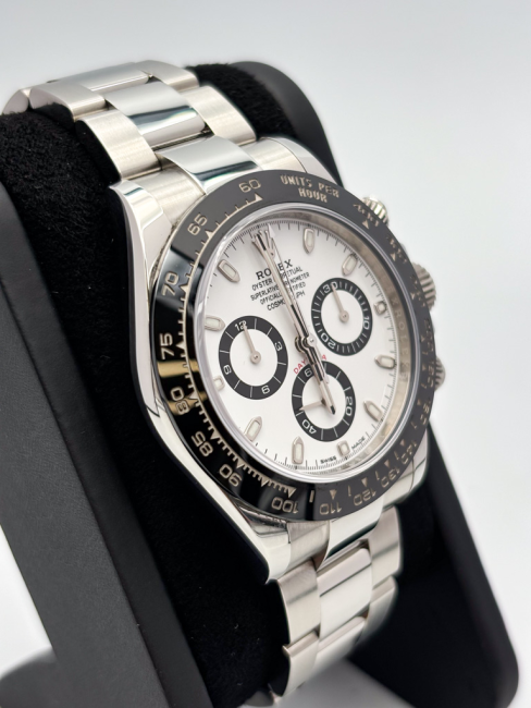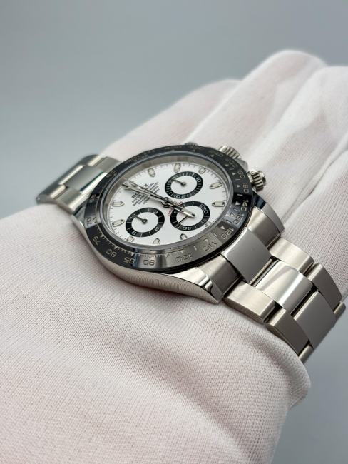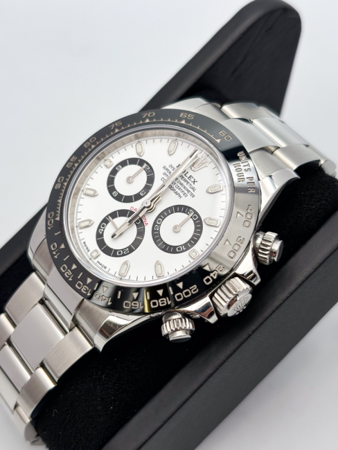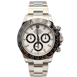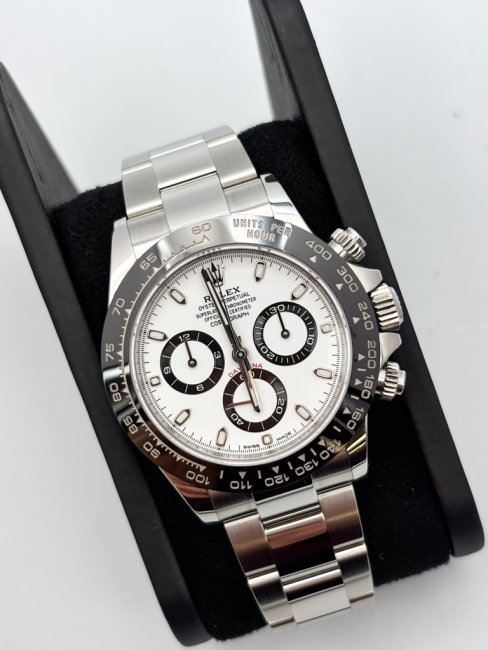 Il Rolex Daytona 116500LN rappresenta l'apice della precisione e dell'eleganza, incapsulando in un design iconico l'essenza dell'alta orologeria. La cassa in acciaio da 40 mm si distingue per la sua robustezza e per la sua bellezza senza tempo, mentre la ghiera in ceramica nera conferisce un contrasto audace e sofisticato. Il quadrante bianco, pulito e luminoso, è impreziosito da contatori neri che ne esaltano la funzionalità e il fascino estetico, rendendo ogni sguardo un'esperienza visiva unica. Il bracciale Oyster, con la sua chiusura déployante, garantisce non solo sicurezza ma anche un comfort assoluto, facendo di questo orologio un compagno ideale per ogni occasione. Indossare il Daytona significa abbracciare una tradizione di lusso e prestazioni, perfetta per chi non accetta compromessi.