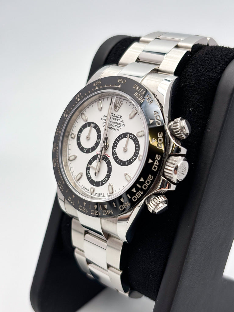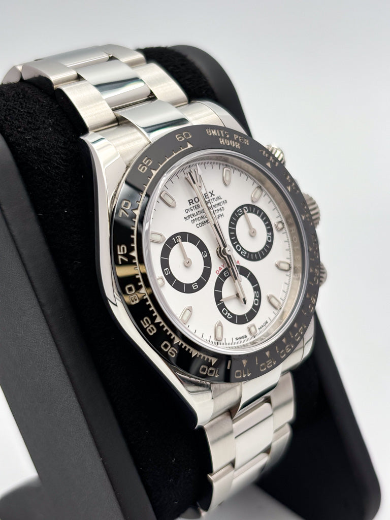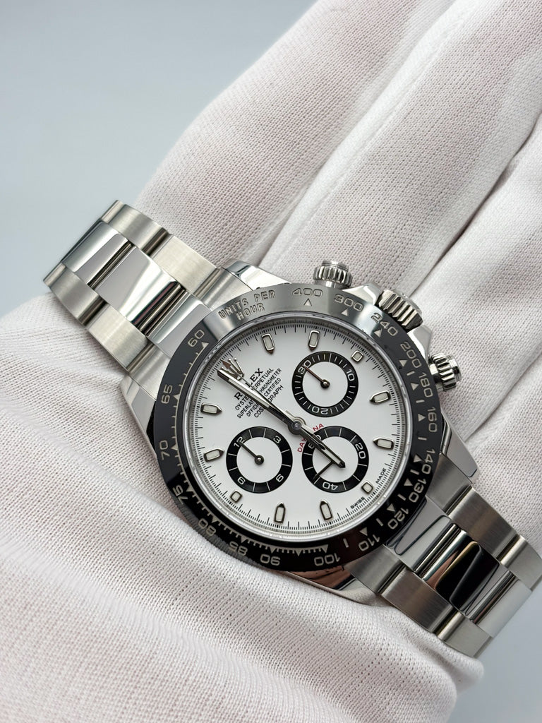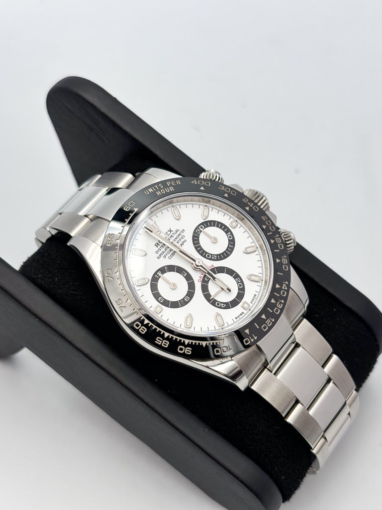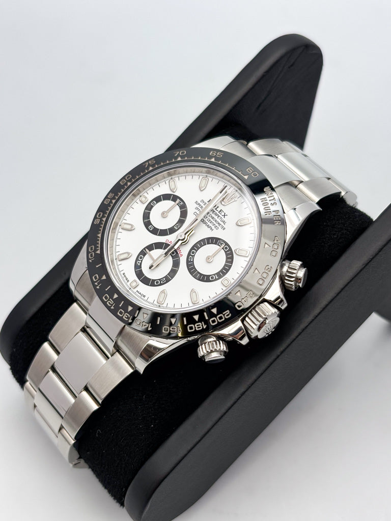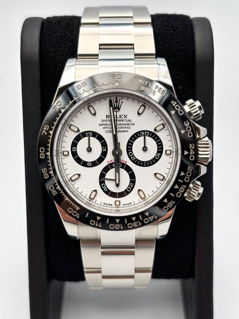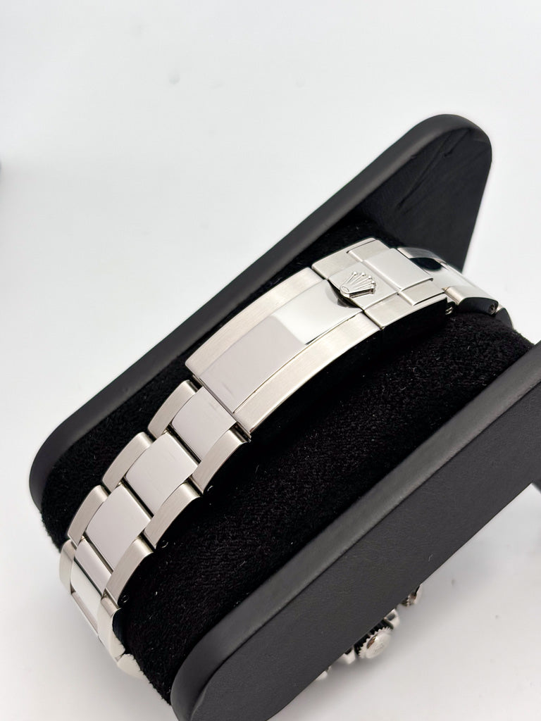 Scoprite l'eleganza senza tempo della Daytona 116500LN, un'orologio che incarna l'essenza dell'alta orologeria e dello stile esclusivo. Con una cassa di 40mm, questo esemplare si distingue per la sua proporzione perfetta e la sua raffinata presenza al polso. La ghiera in ceramica nera non solo conferisce un tocco di modernità, ma garantisce anche un'eccezionale resistenza ai graffi, mantenendo il suo fascino impeccabile anche dopo anni di utilizzo. Il quadrante bianco, luminoso e pulito, offre una leggibilità straordinaria, mentre il bracciale Oyster, in pregiato acciaio, esprime forza e eleganza, creando un'armonia perfetta tra sportività e raffinatezza. La chiusura déployante assicura una vestibilità sicura e confortevole, rendendo ogni attimo indossare questo pezzo unico un'esperienza indimenticabile.