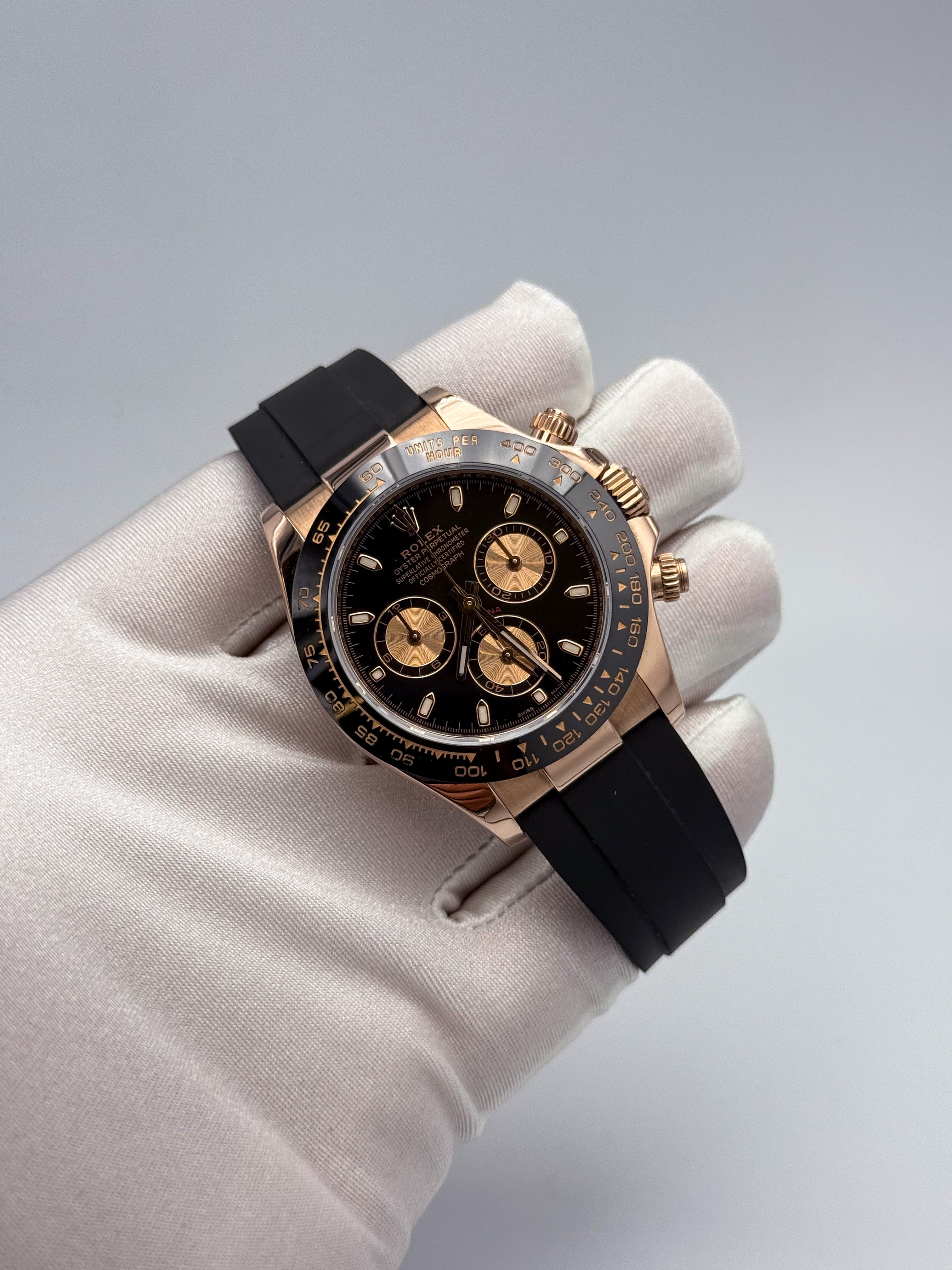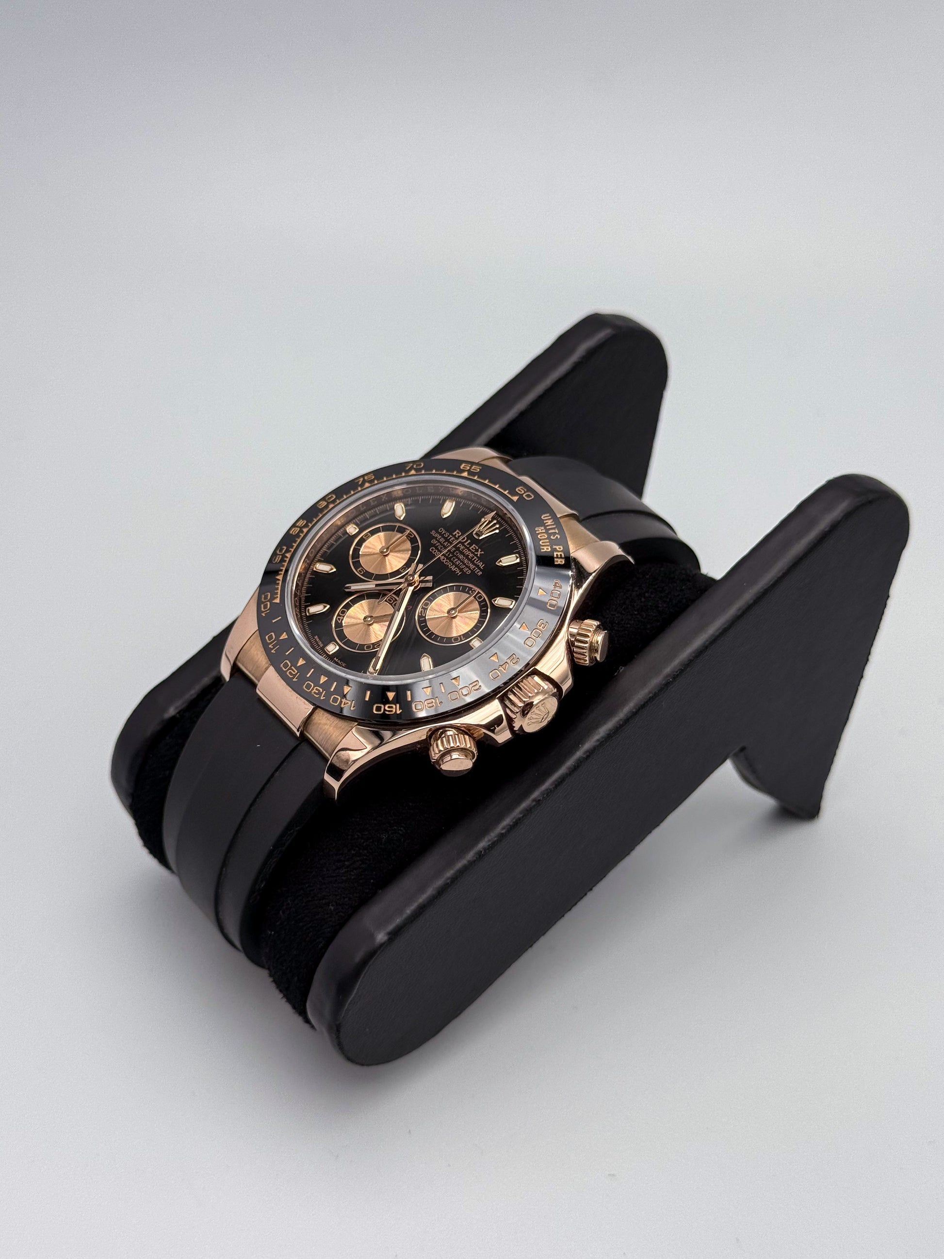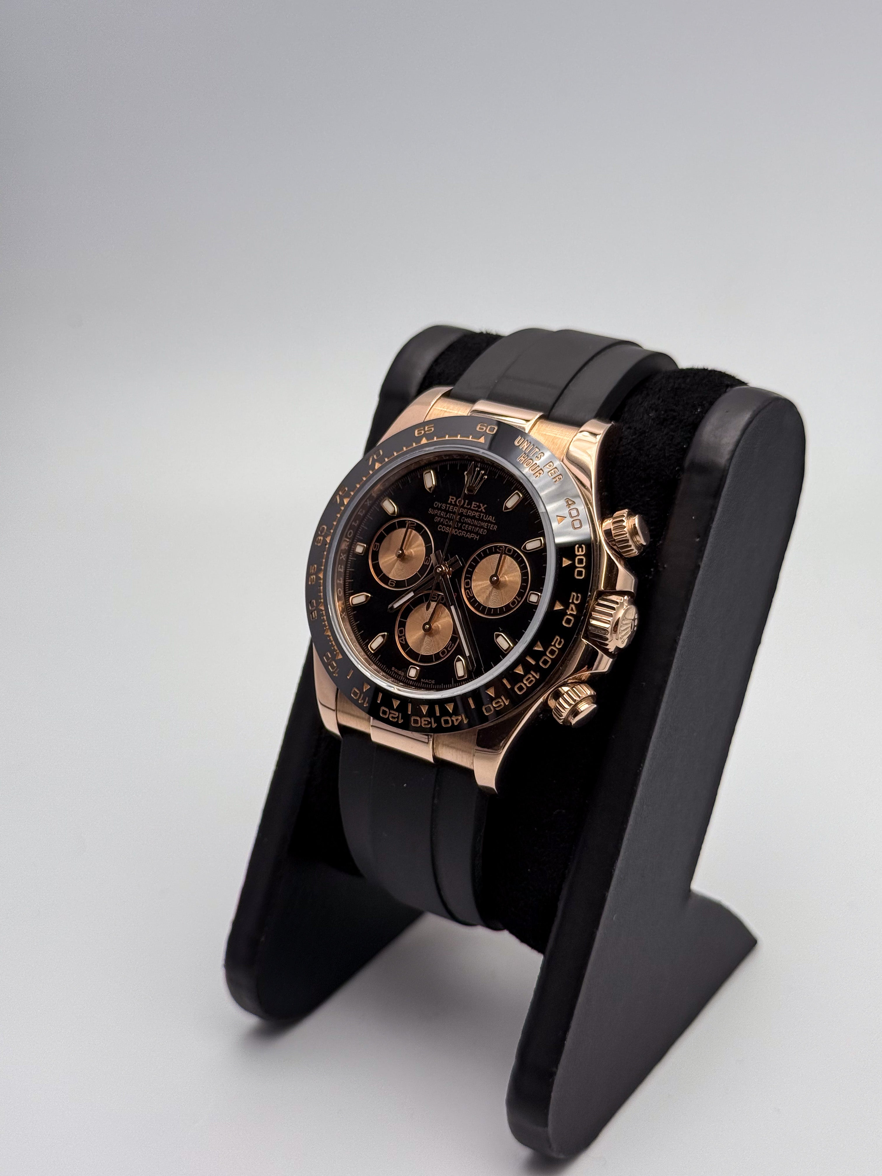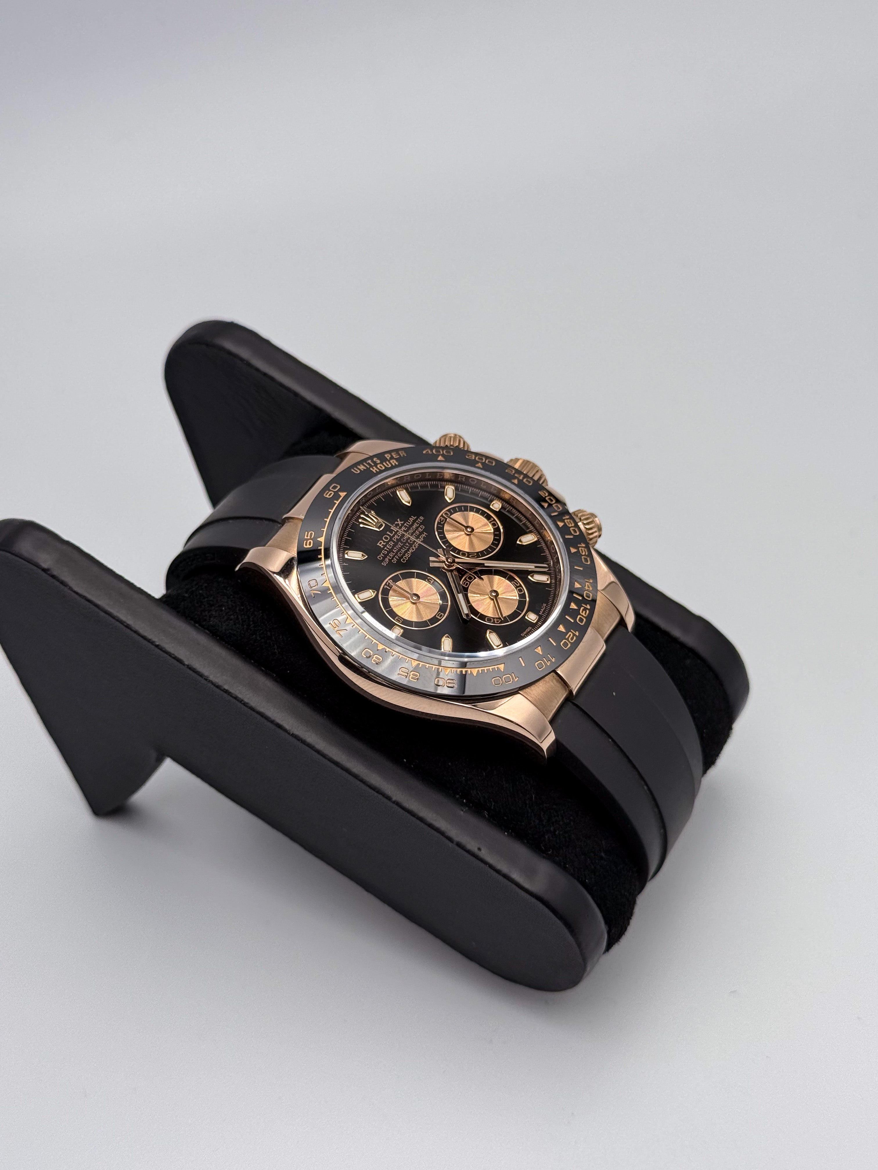 Cronografo sportivo di eccellenza con quadrante nero che esalta la leggibilità dei contatori. La cassa in oro rosa 18 carati conferisce eleganza senza compromessi, mentre il bracciale in gomma Oysterflex garantisce comfort e resistenza in ogni situazione. Perfetto per chi ricerca prestazioni cronometriche affidabili abbinate a un design raffinato e versatile. Un orologio che unisce tradizione orologiera e innovazione materica.