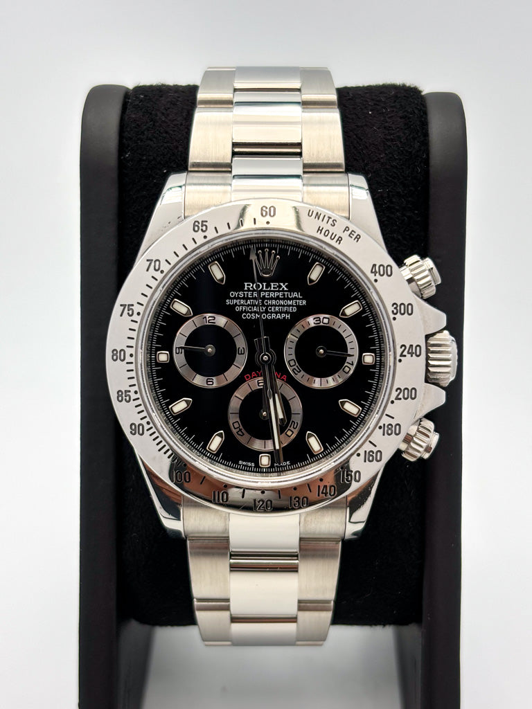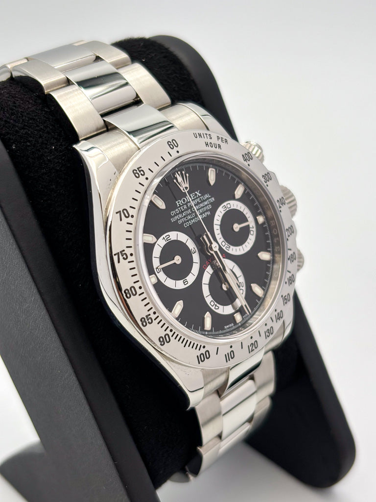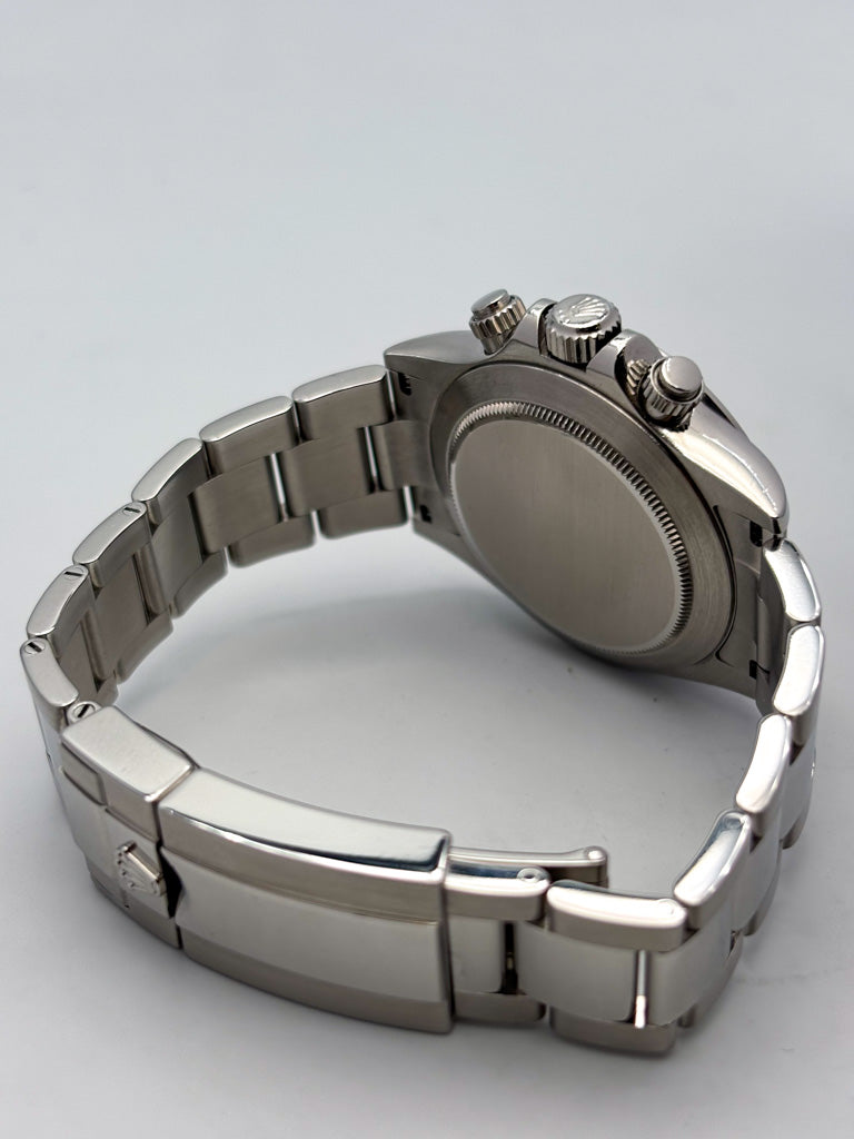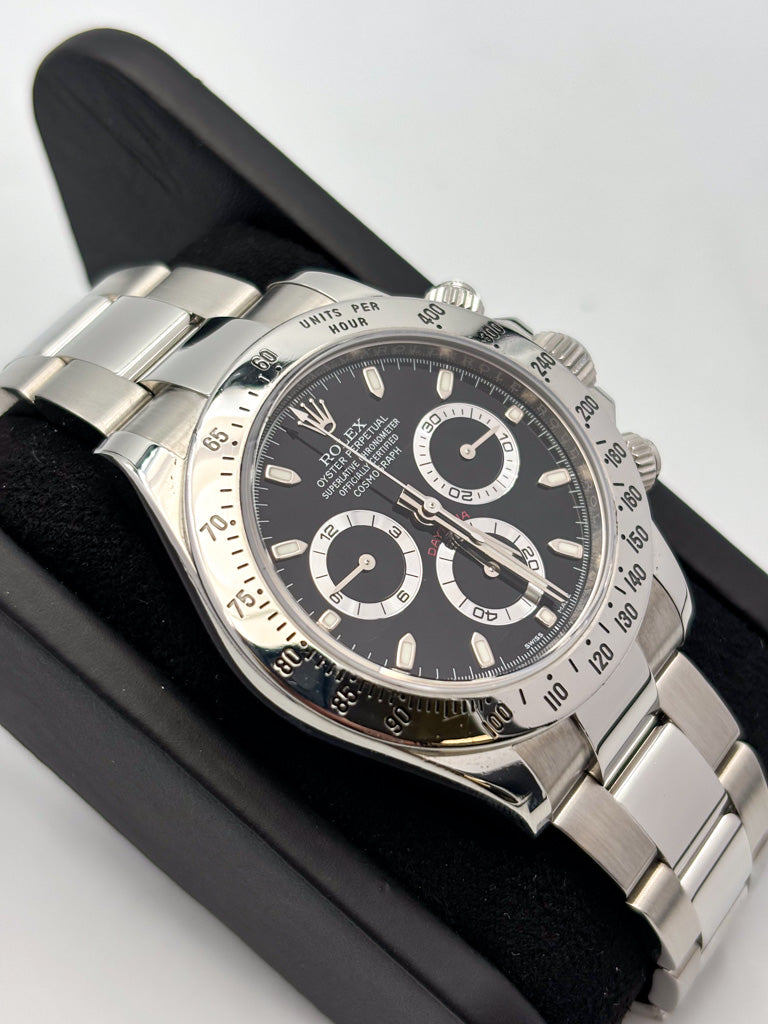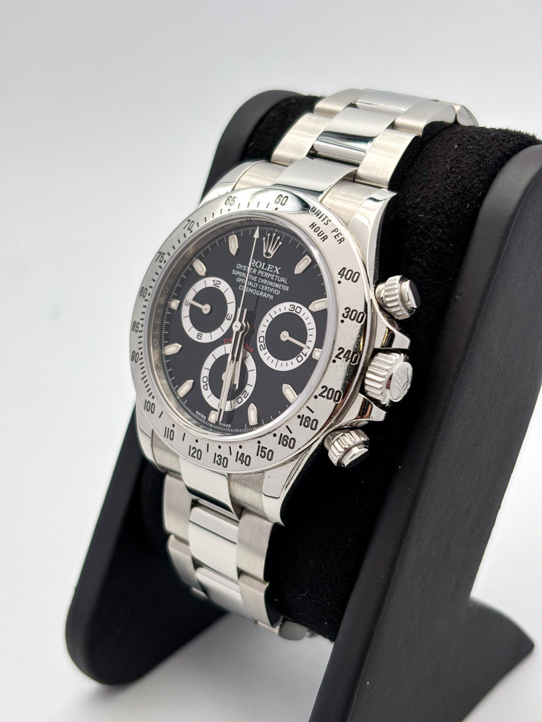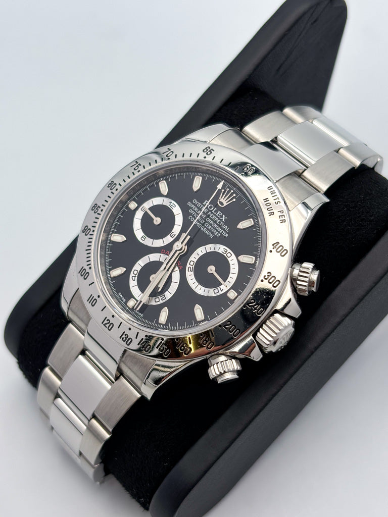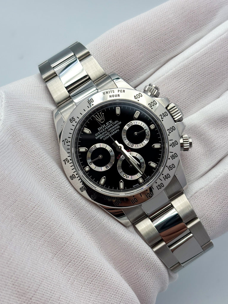 Il Daytona 116520 in acciaio rappresenta l'evoluzione della cronografia sportiva di lusso. Equipaggiato con movimento automatico, offre praticità d'uso senza compromessi sulla precisione. Il quadrante nero, elegante e leggibile, contrasta magistralmente con i contatori e la lunetta tachimetrica, elemento distintivo di questa collezione. La cassa in acciaio inossidabile garantisce robustezza e resistenza, perfetta per un utilizzo quotidiano intenso. Il meccanismo di carica automatica assicura affidabilità costante e prestazioni cronometriche certificate. Questo orologio incarna la sintesi tra innovazione tecnica e design senza tempo, destinato a chi ricerca uno strumento versatile capace di accompagnare ogni momento con eleganza e affidabilità professionale.