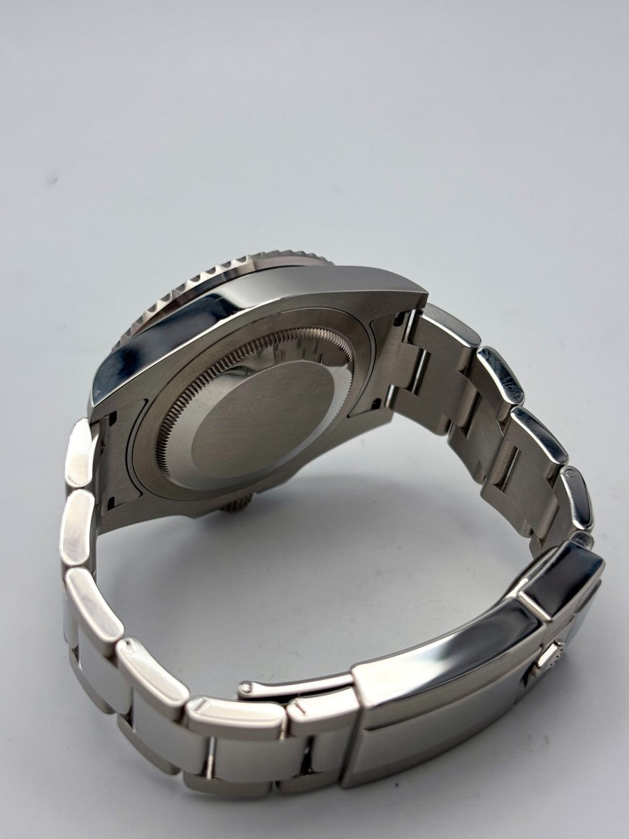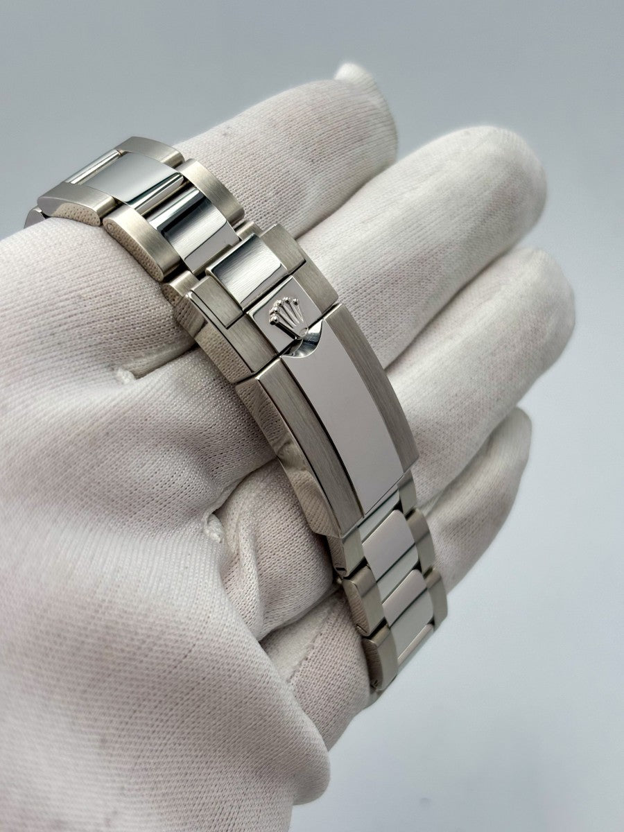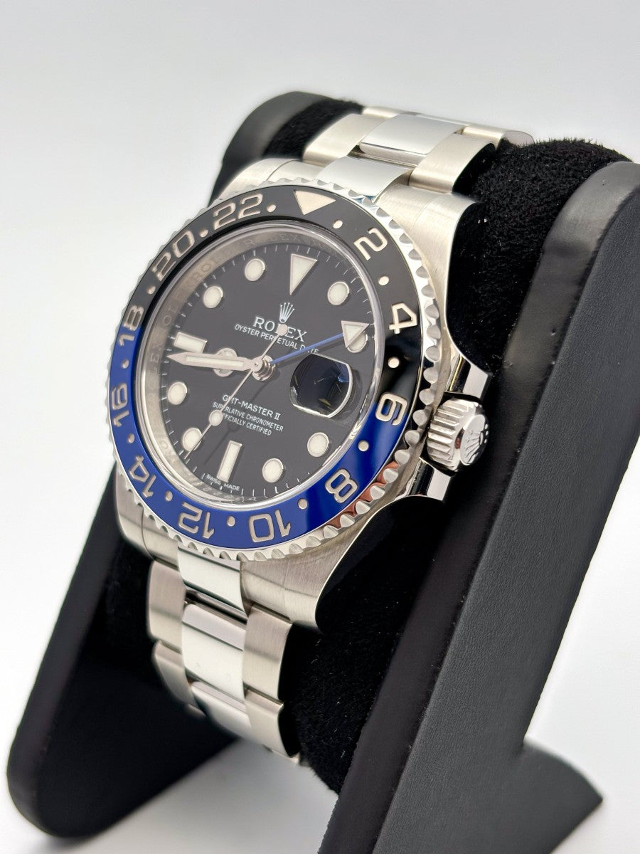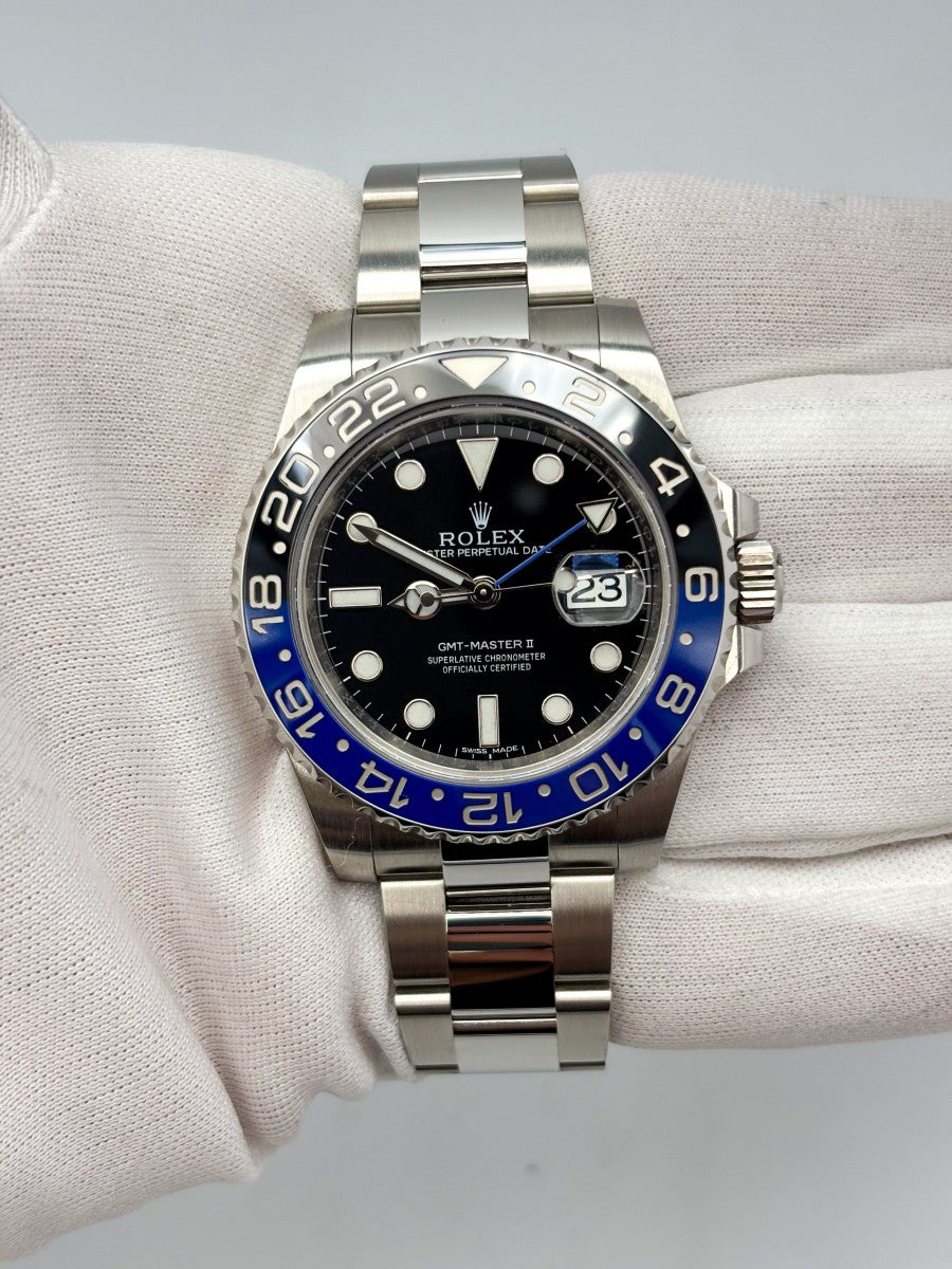 Il quadrante nero lucido offre una leggibilità impeccabile, completata dalle classiche lancette Mercedes e dalla funzione GMT che consente di visualizzare un secondo fuso orario. L’insieme rende il GMT-Master II “Batman” uno strumento affidabile tanto per viaggiatori quanto per collezionisti. Il corredo Full Set ne accresce il valore, testimoniando autenticità e cura nel tempo.
