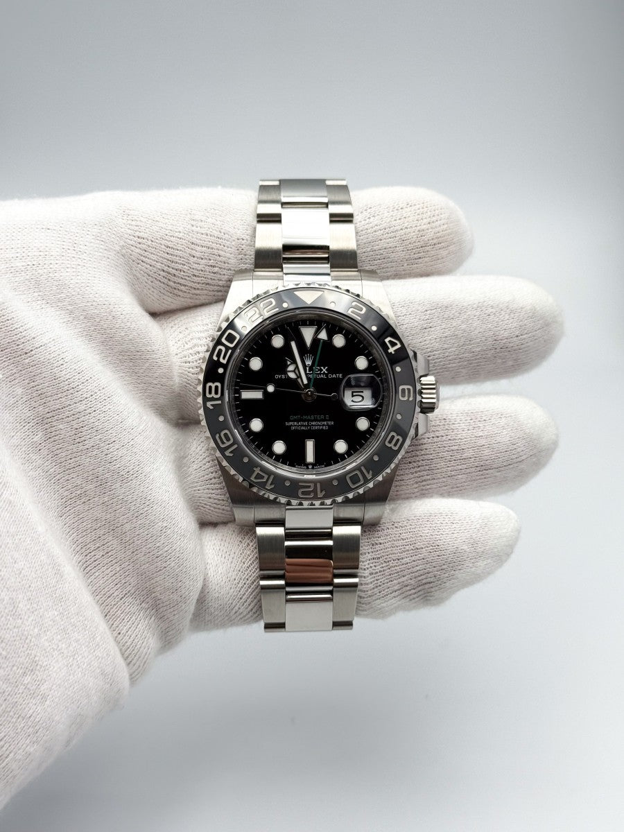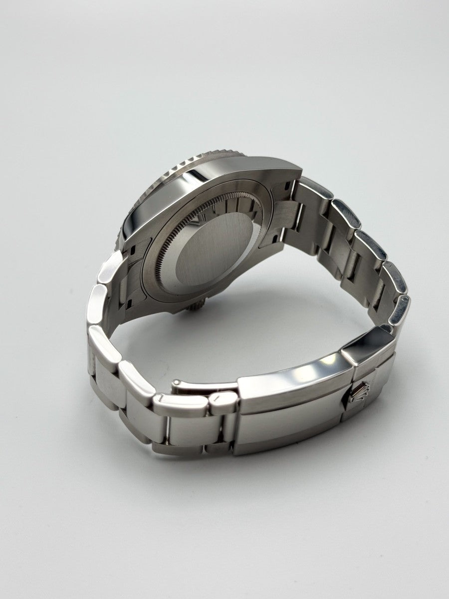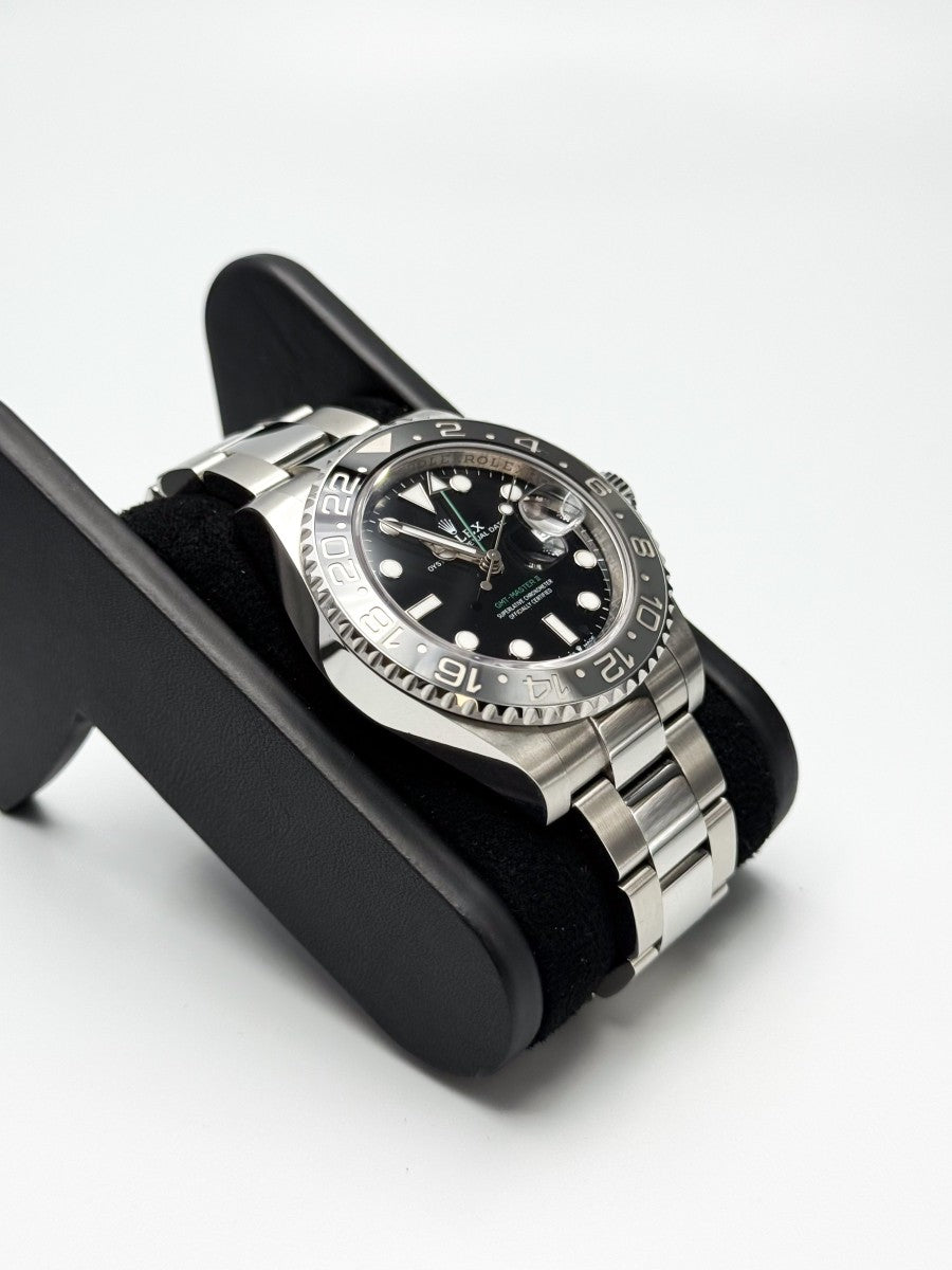 Il GMT-Master II - (Bruce Wayne) è un'autentica opera d'arte dell'orologeria, un simbolo di eleganza senza tempo e di sofisticazione. Con un diametro di 40 mm, la sua cassa in acciaio inossidabile offre una resistenza eccezionale, mentre la ghiera in ceramica nera e verde non solo esalta la sua estetica, ma garantisce anche una durata superiore. Il quadrante nero, con i suoi indici luminescenti, cattura l'attenzione offrendo una visibilità impeccabile in ogni condizione di luce. Il raffinato bracciale Oyster, con chiusura déployante, non solo assicura una vestibilità perfetta, ma sottolinea anche l’attenzione al dettaglio che caratterizza ogni creazione Rolex. Indossare questo orologio significa non solo segnare il tempo, ma farlo con stile e autorità.