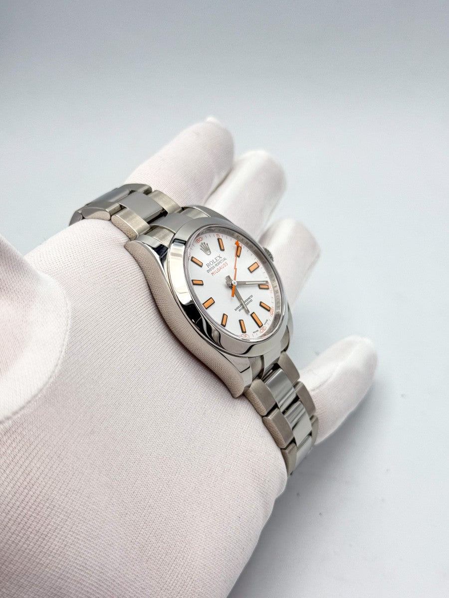 Il Rolex Milgauss 116400 si distingue per la sua eleganza senza tempo e la sua impeccabile manifattura, un capolavoro che unisce funzionalità e stile. Con una cassa di 40 mm in acciaio inossidabile, questo orologio è progettato per resistere alle sfide quotidiane senza sacrificare l'estetica. La ghiera liscia conferisce un tocco di raffinatezza, mentre il quadrante bianco, luminoso e pulito, cattura l'attenzione con la sua semplicità sofisticata. Il bracciale Oyster, noto per il suo comfort e la sua solidità, si adatta perfettamente al polso, garantendo una vestibilità sicura e premium. La chiusura déployante, infine, aggiunge un ulteriore livello di praticità e sicurezza, rendendo il Milgauss non solo un cronografo di alta classe, ma un vero e proprio simbolo di status e distinzione.