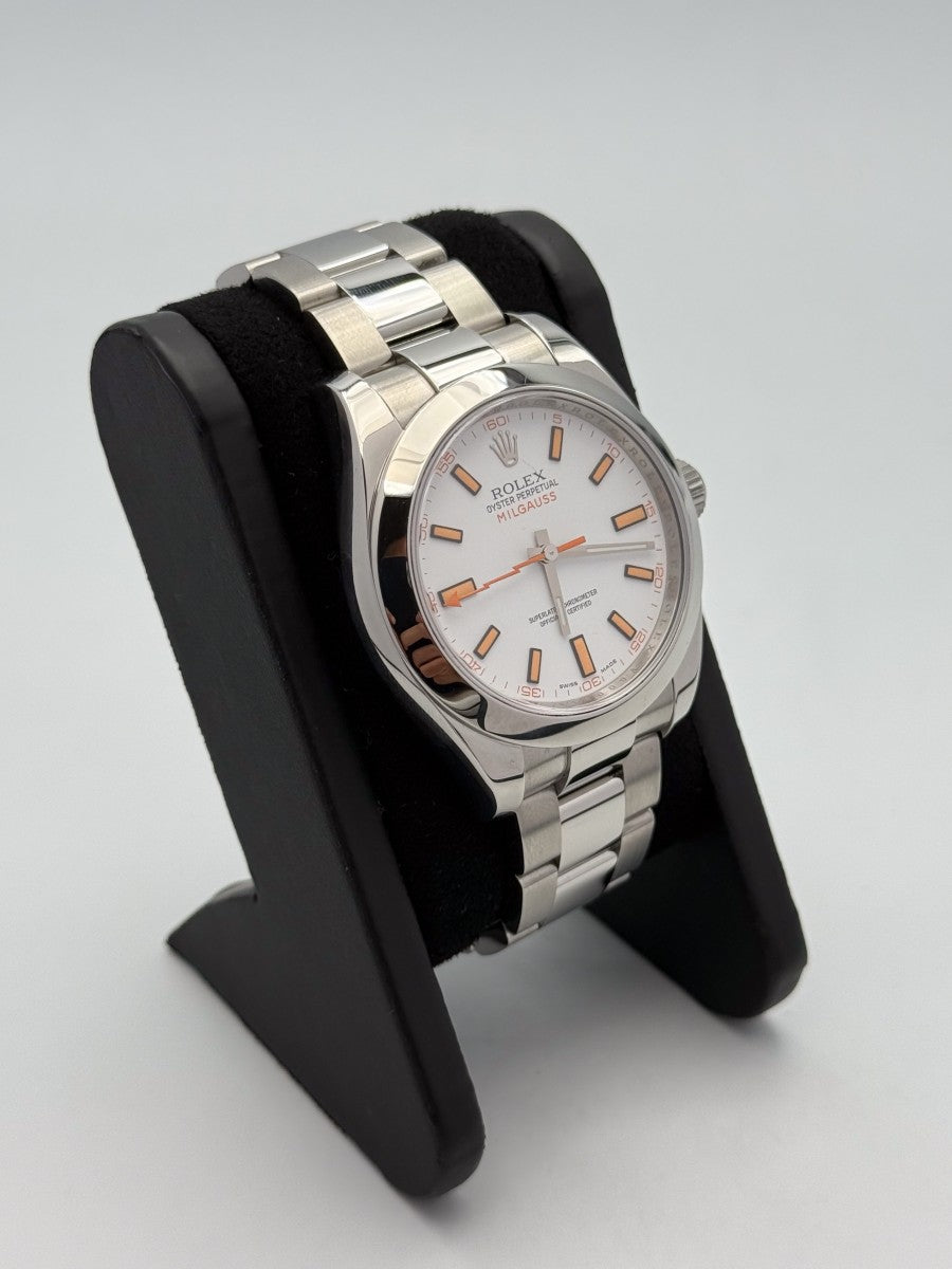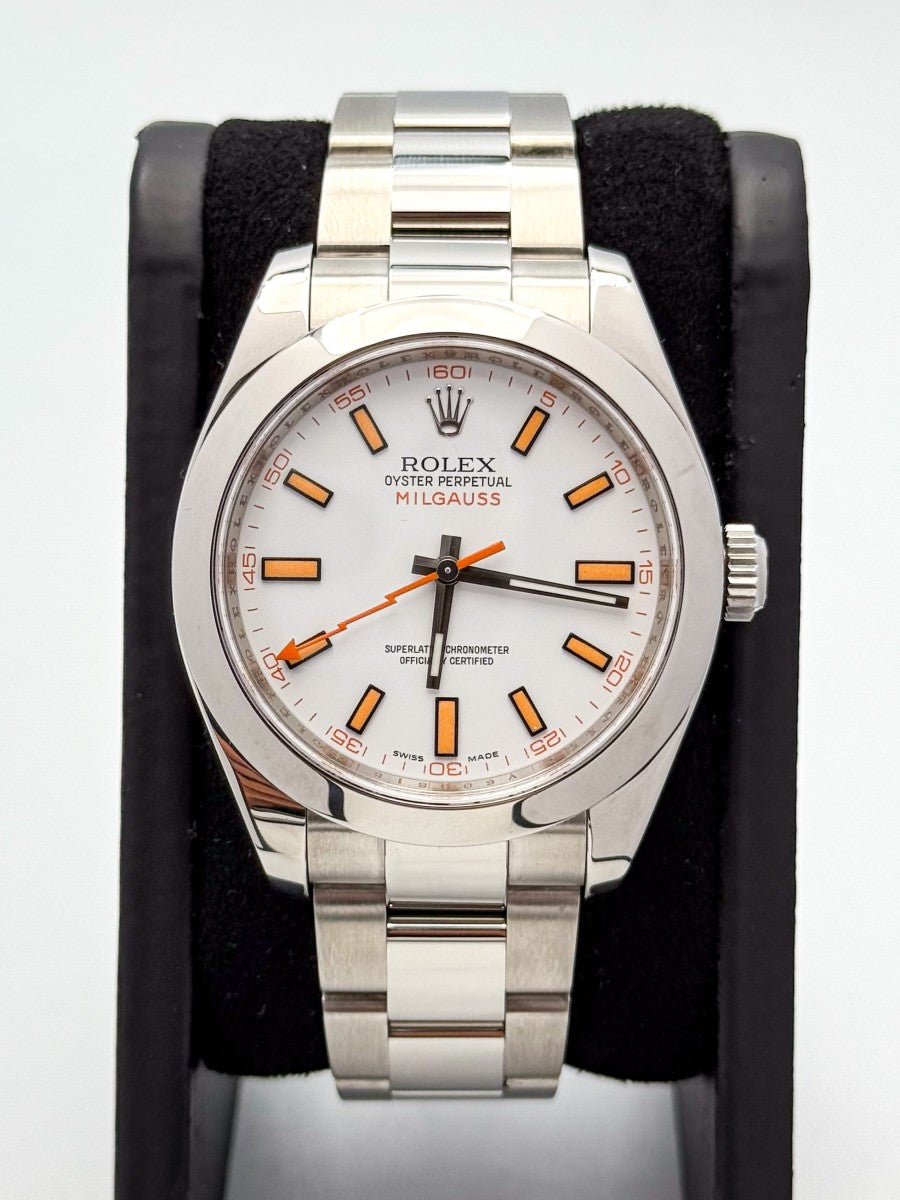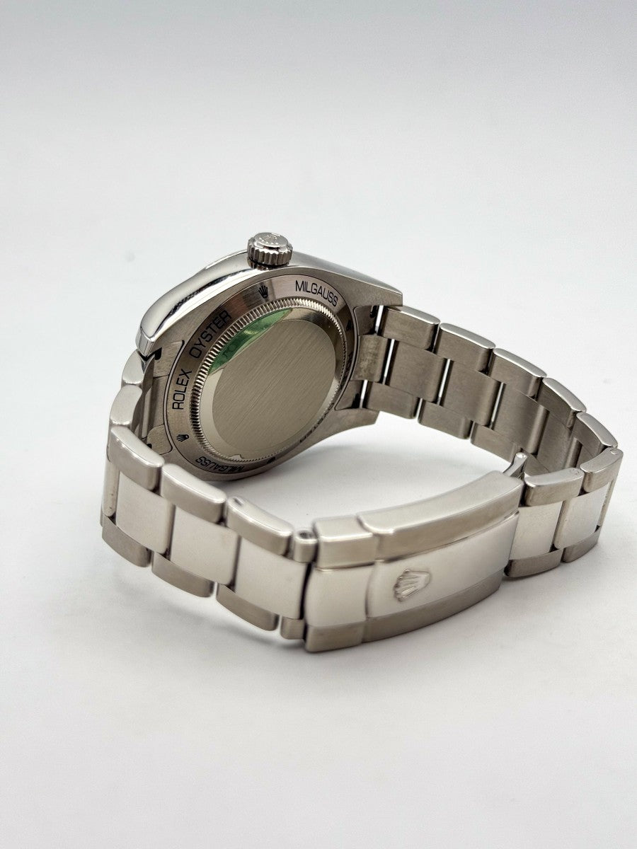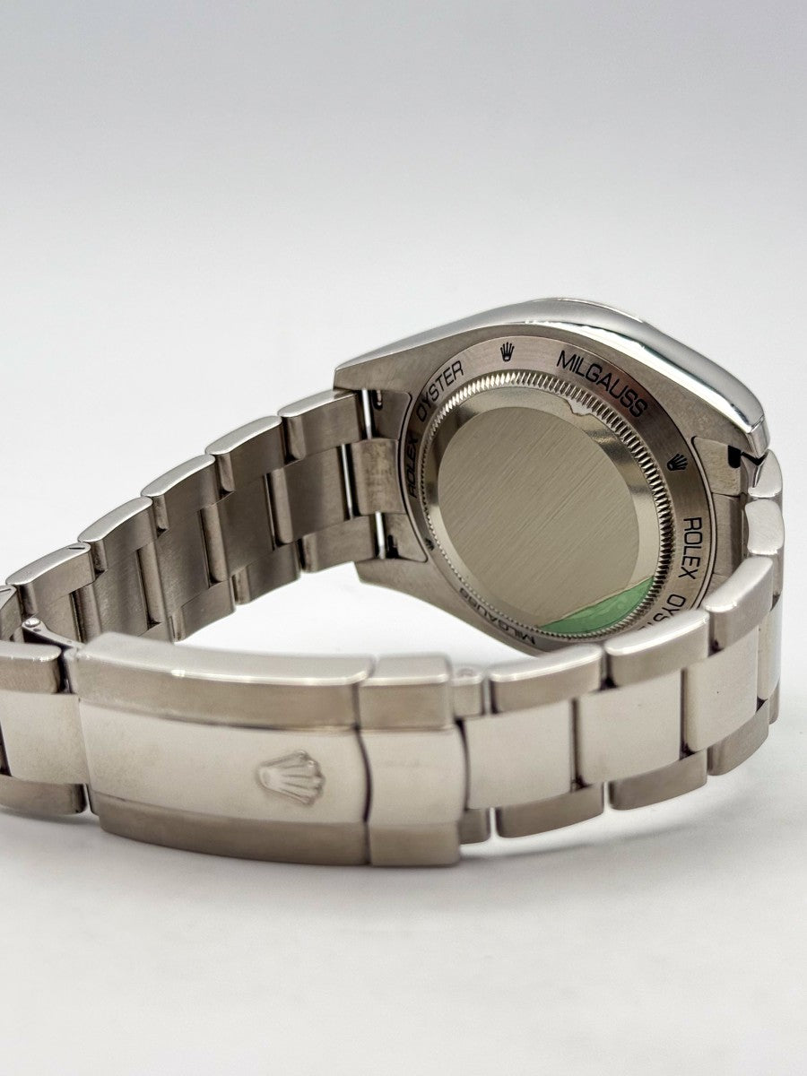 Il Rolex Milgauss 116400 è molto più di un semplice orologio; rappresenta un connubio perfetto tra innovazione tecnologica e design iconico. La cassa di 40 mm, realizzata in acciaio inossidabile di altissima qualità, offre una resistenza e una robustezza senza pari, rendendolo ideale per chi vive la vita con intensità. La ghiera liscia e il bracciale Oyster, simbolo di eleganza e sportività, si fondono armoniosamente con il quadrante bianco, che non solo esalta la luminosità del modello, ma facilita anche la lettura dell'ora. La chiusura déployante garantisce una vestibilità sicura, conferendo all’orologio un ulteriore tocco di raffinatezza. Indossare il Milgauss non è semplicemente una scelta stilistica, ma un’affermazione di prestigio e stile senza tempo.